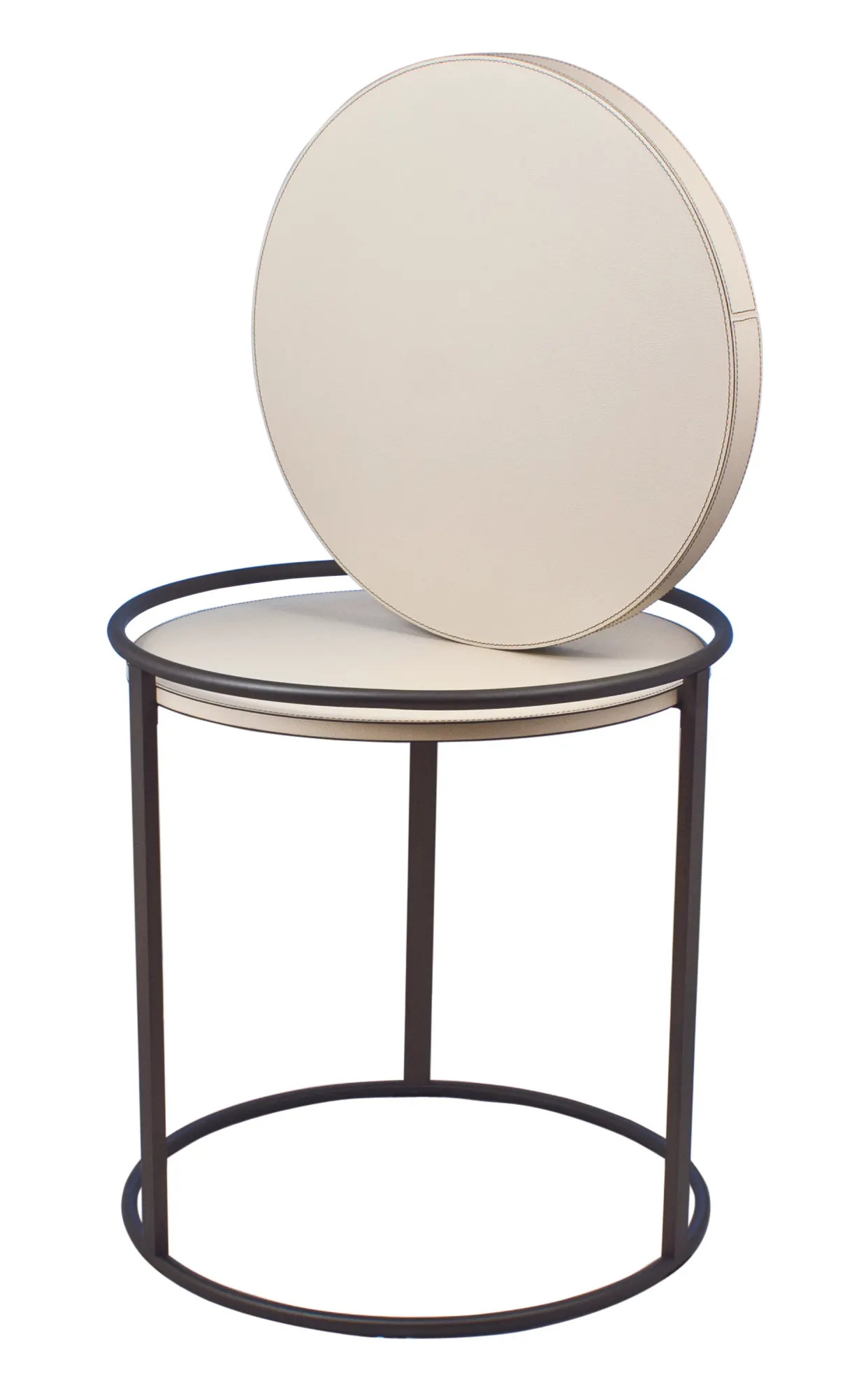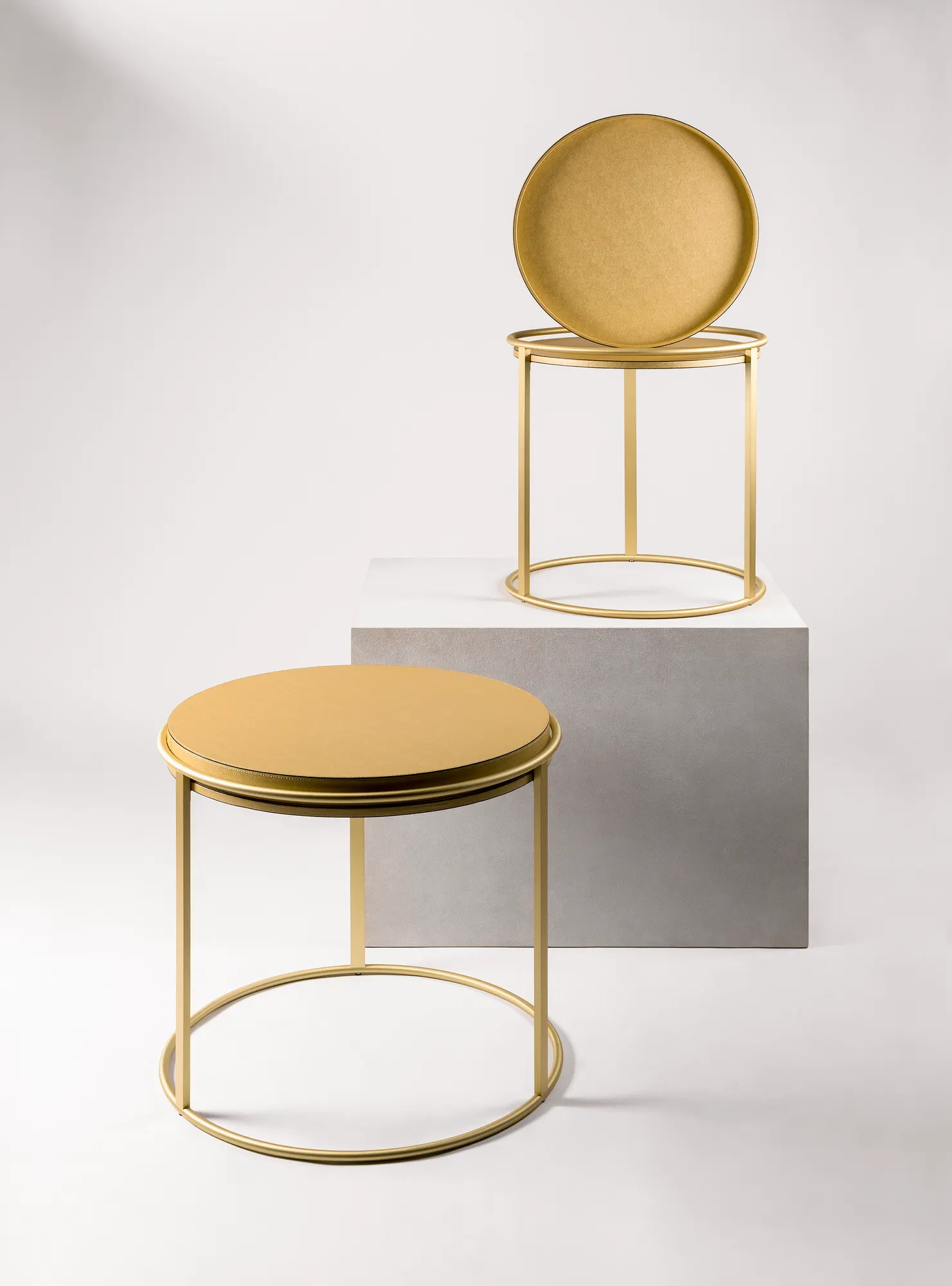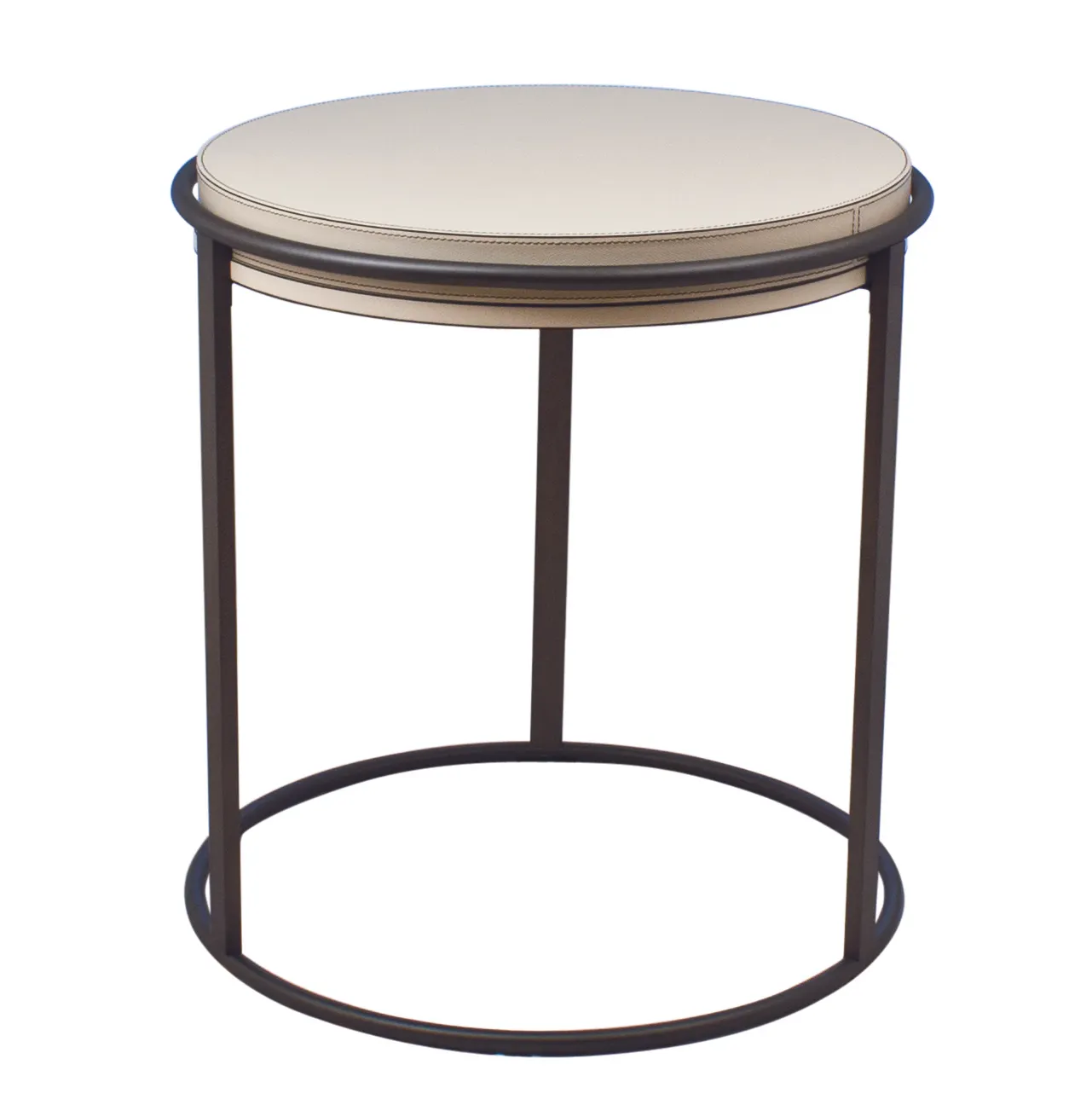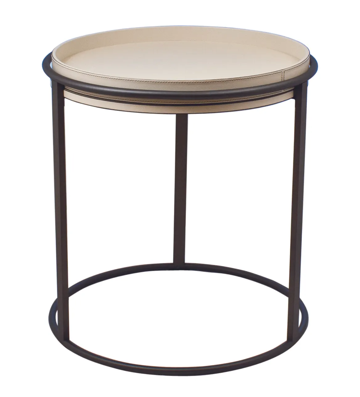 Metal structure available in three finishes with leather covered wood top and removable round tray.