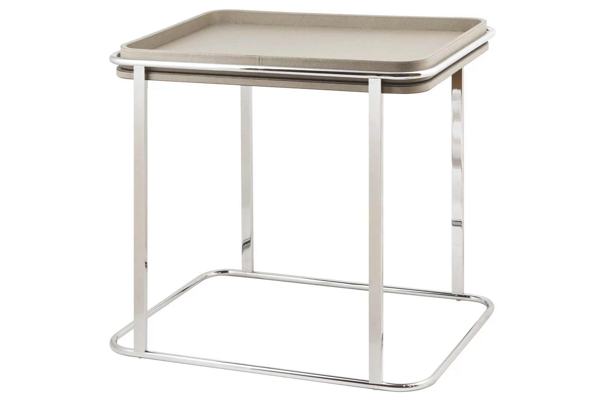 Metal structure available in three finishes with leather covered wood top and removable rectangular tray.