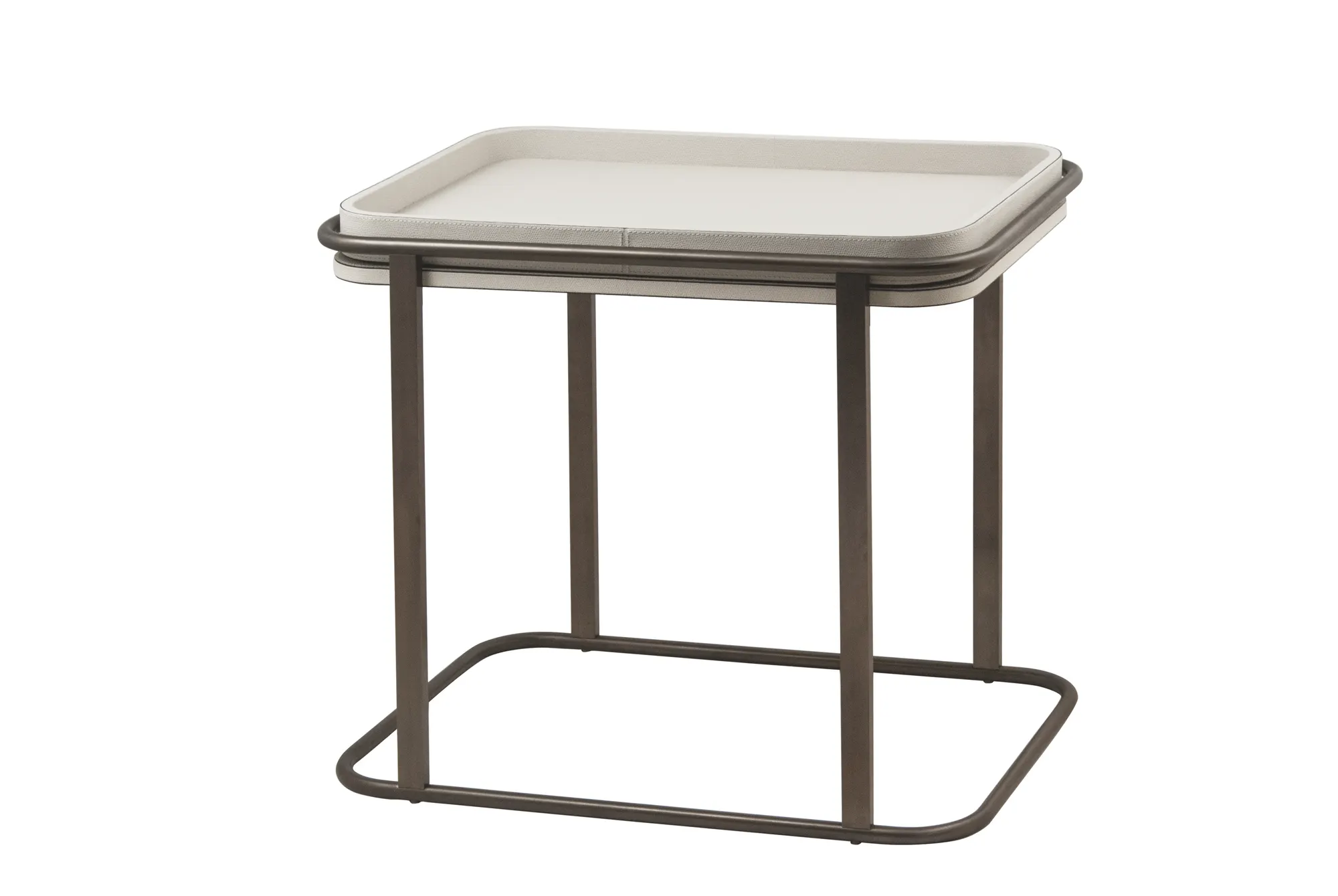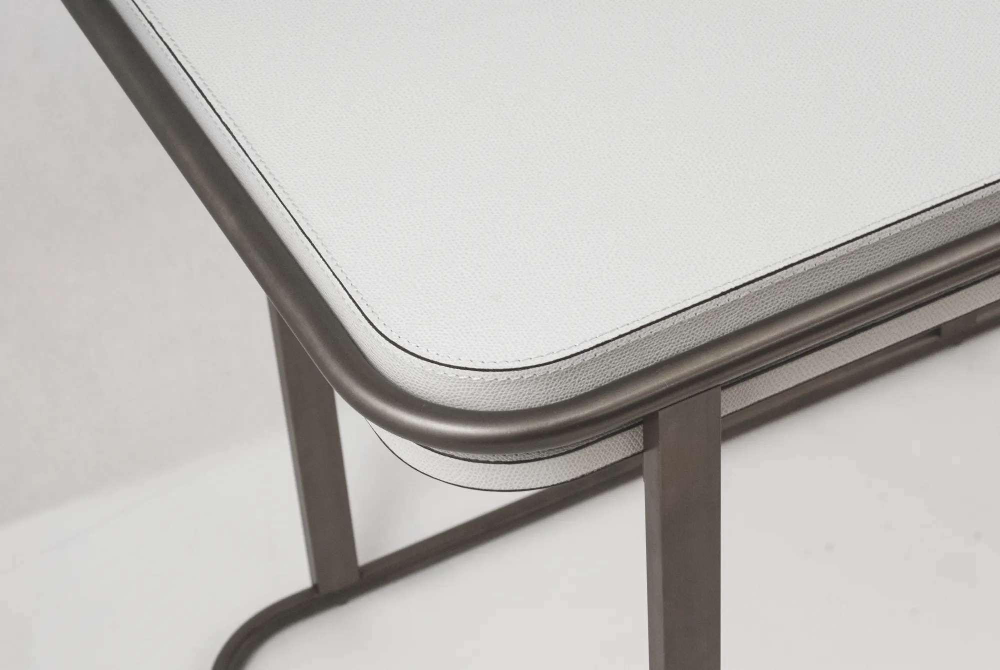 Metal structure available in three finishes with leather covered wood top and removable rectangular tray.
