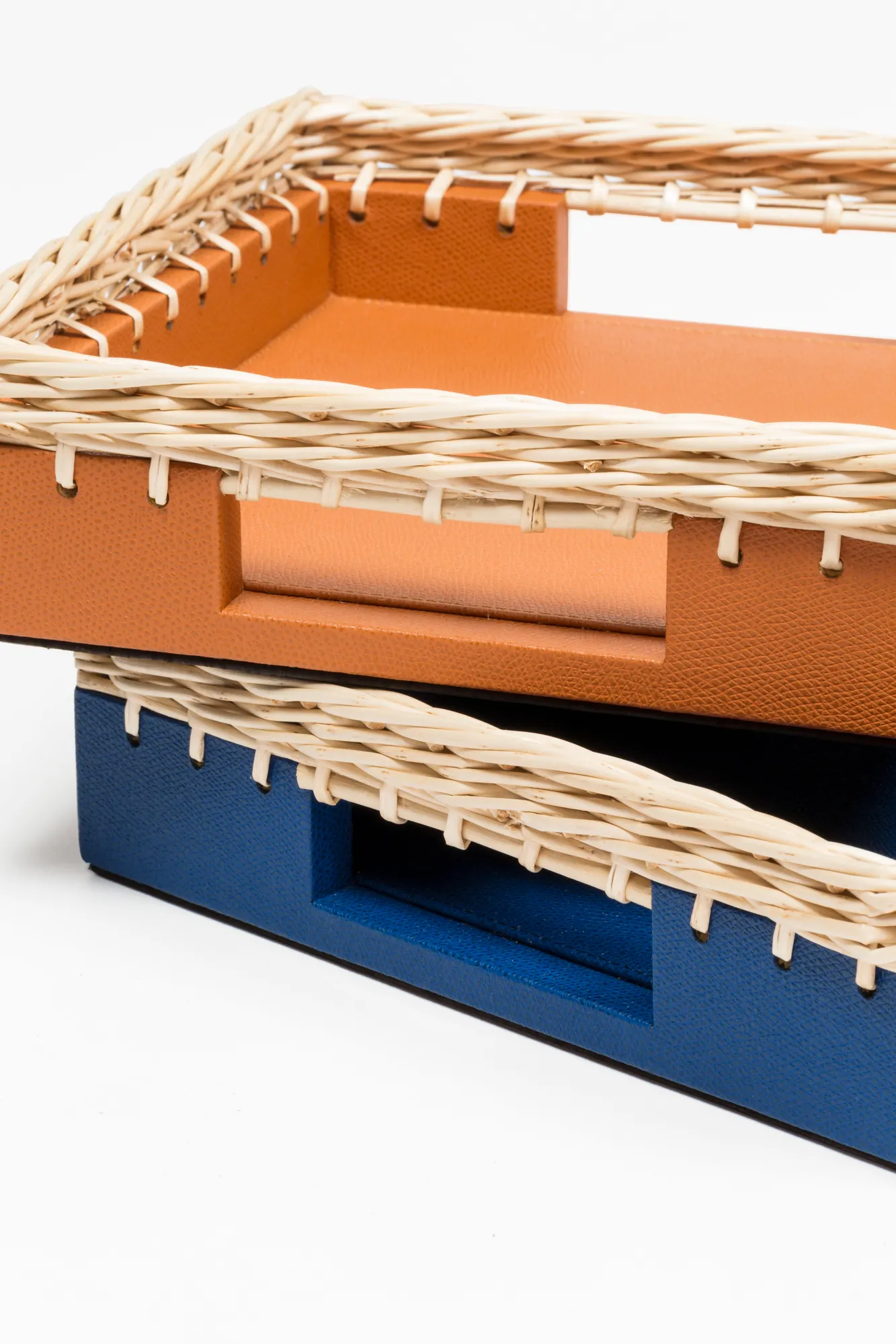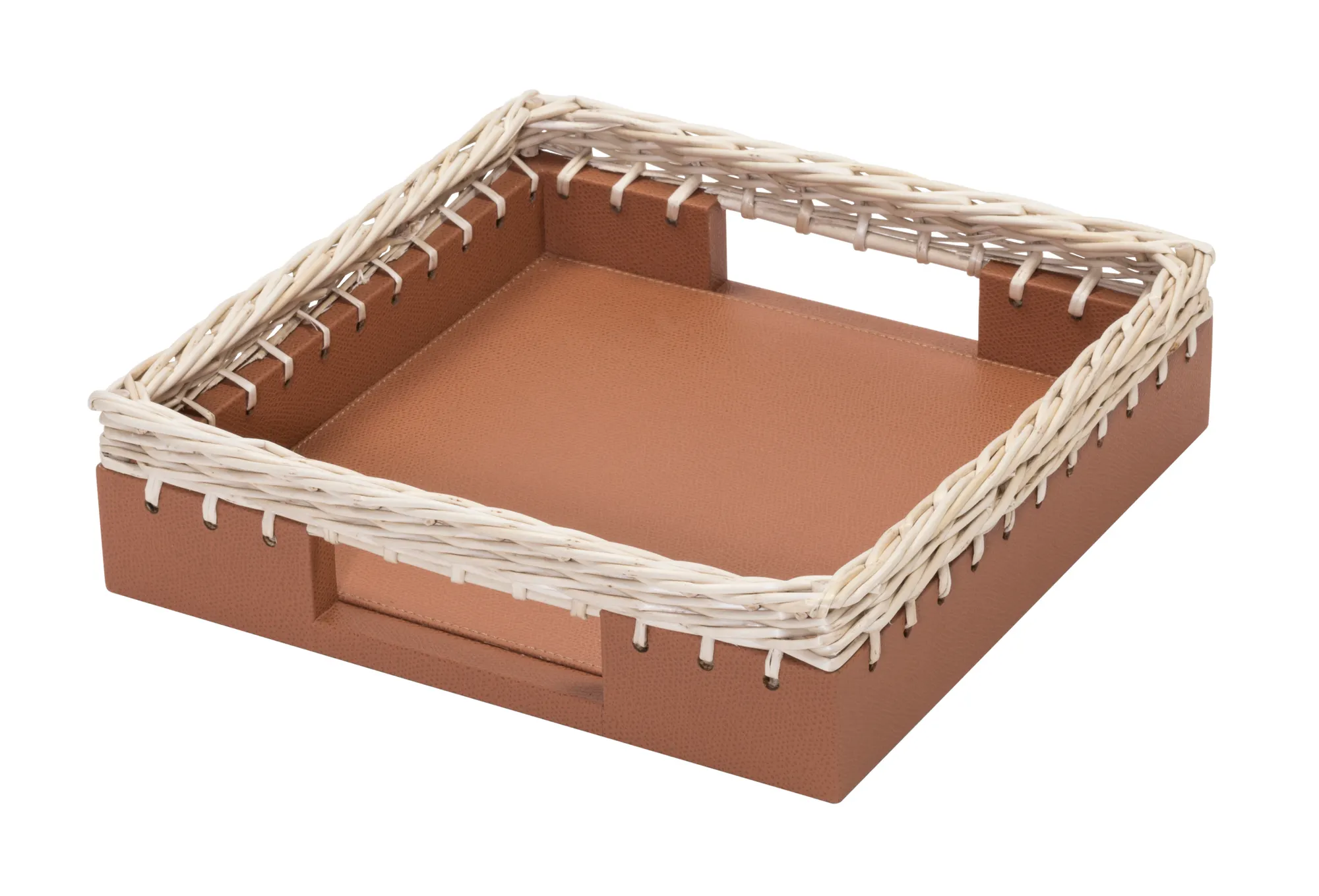 Leather-bound wooden structure enriched by a woven fine willow frame.