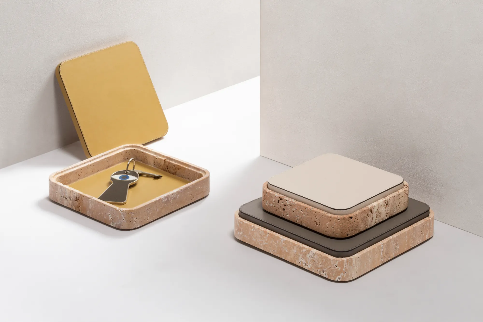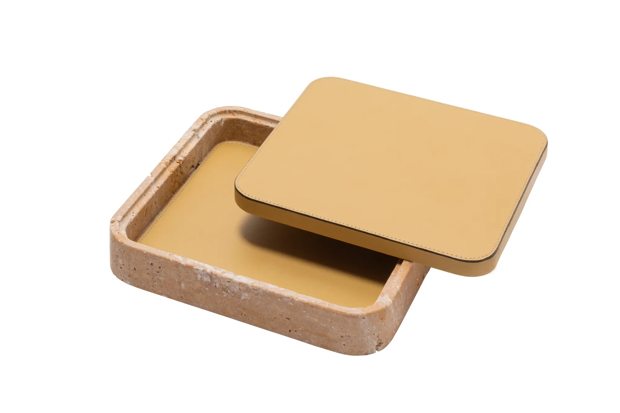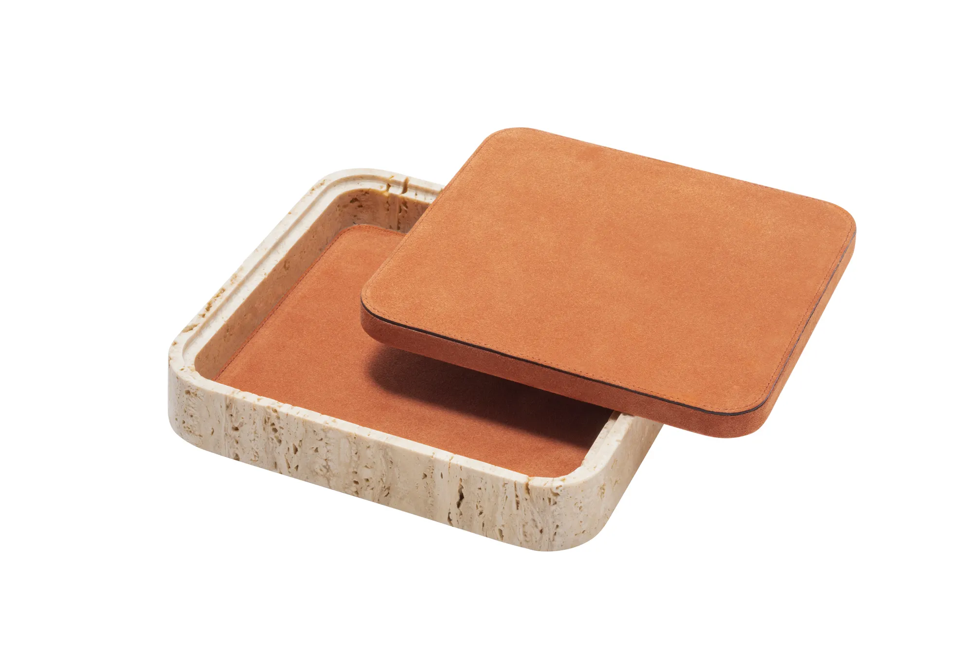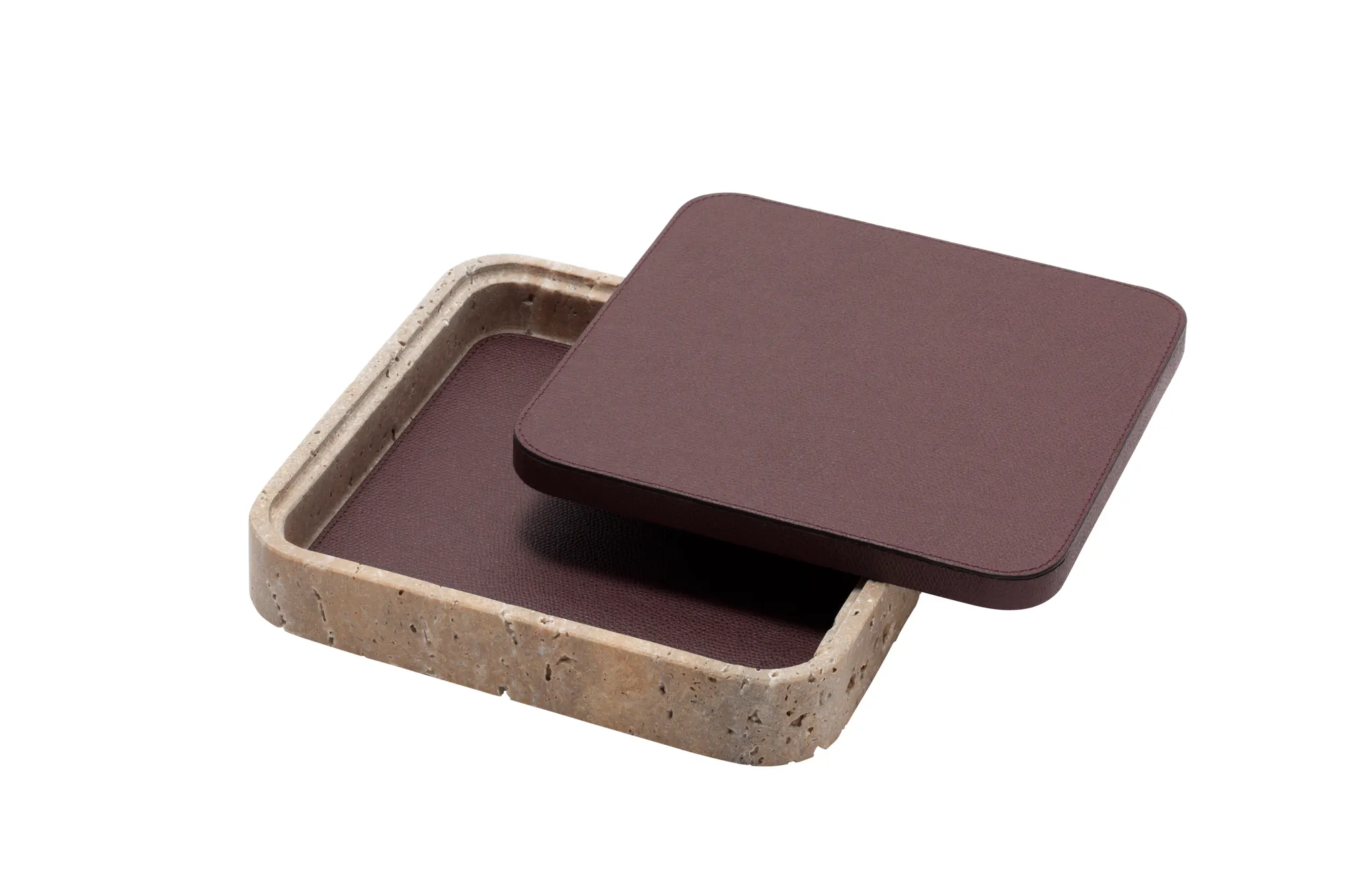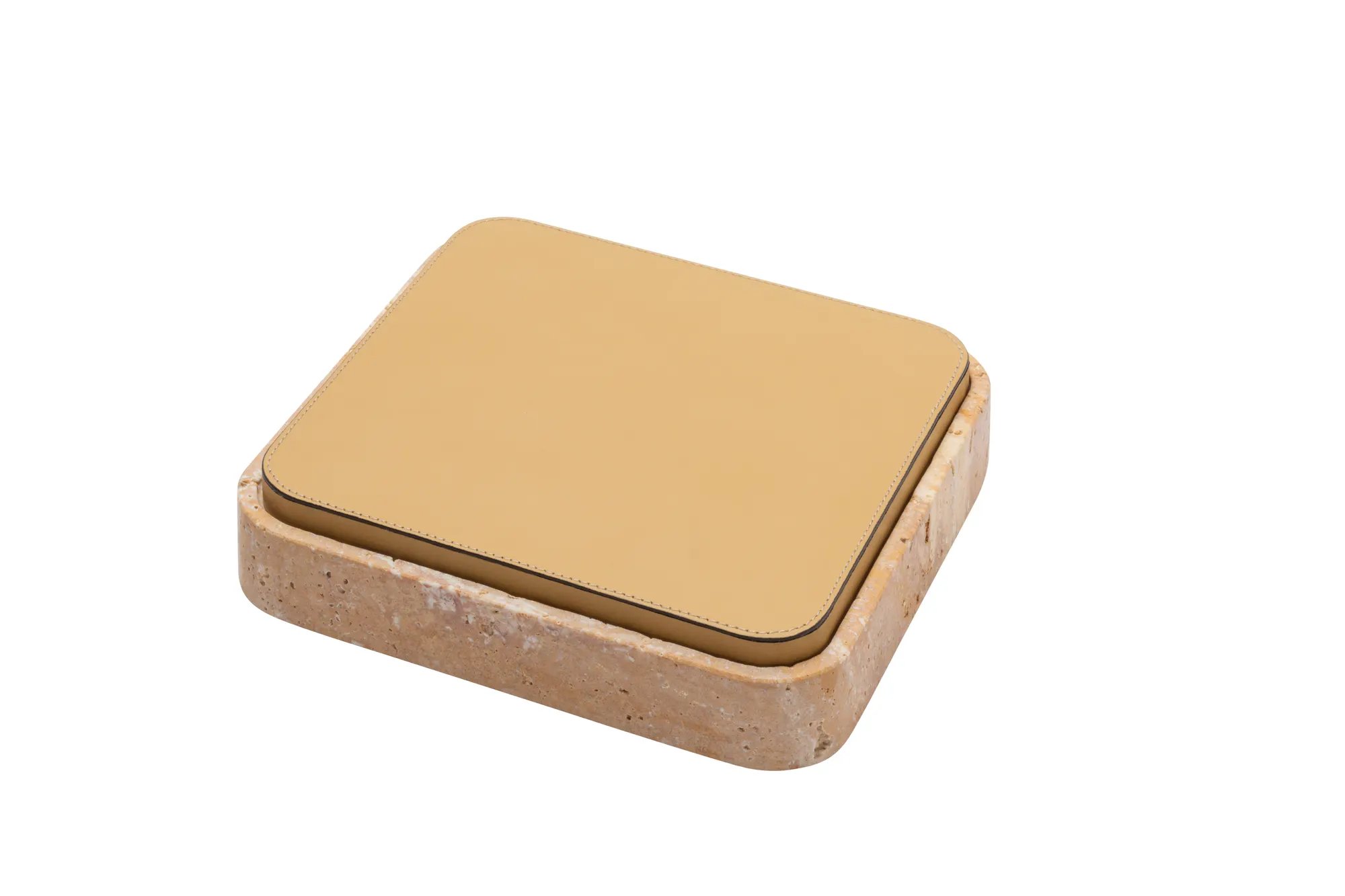 Featuring minimal geometric shapes, these boxes combine the beauty of travertine in several nuances of choice with the finest italian leather. Custom sizes available on request.