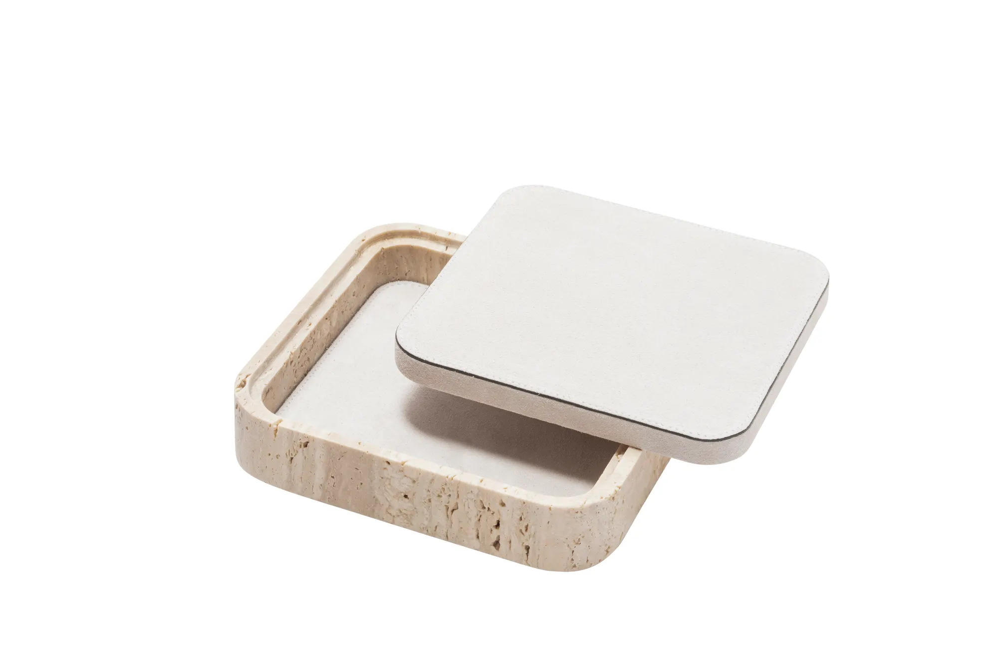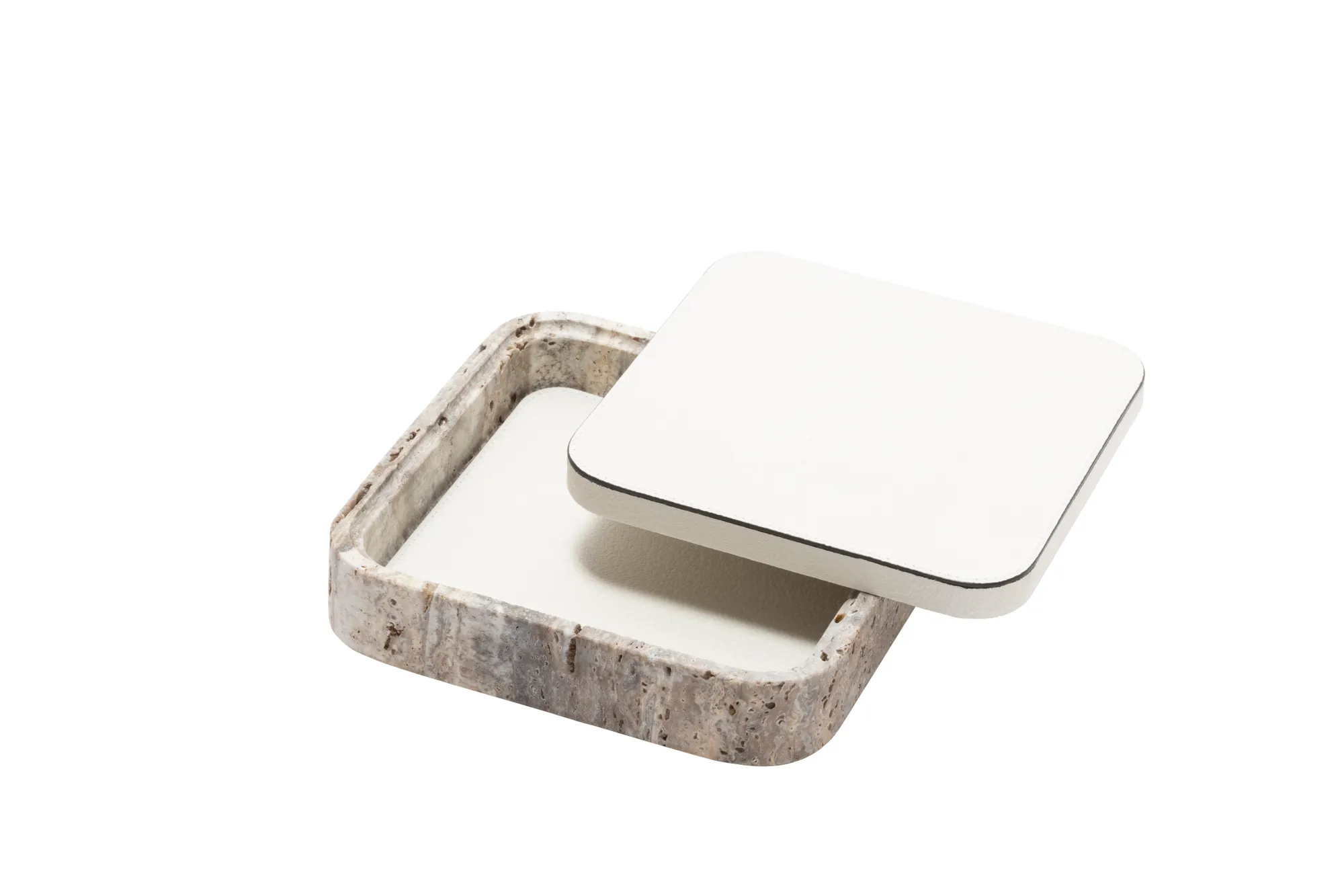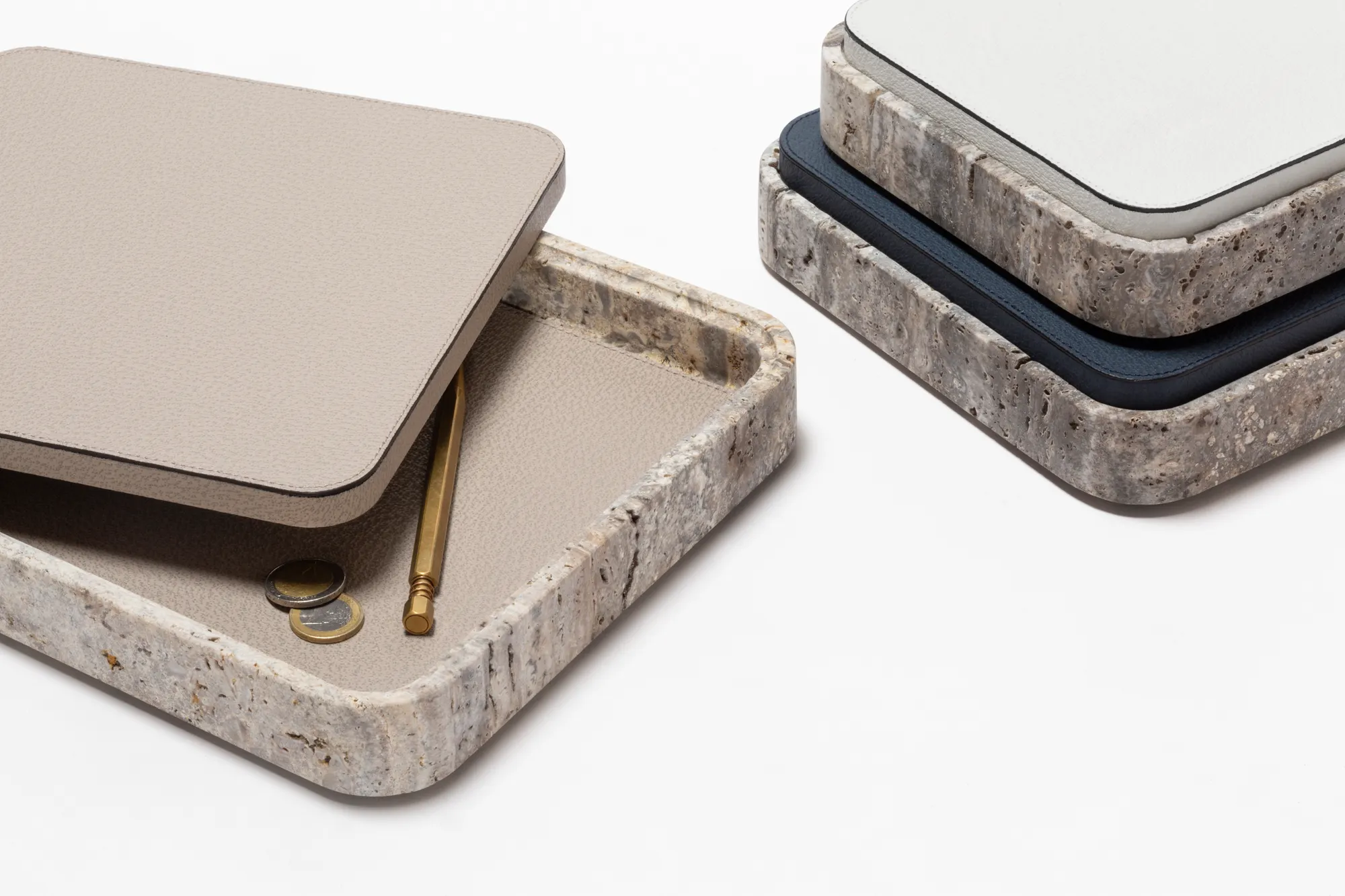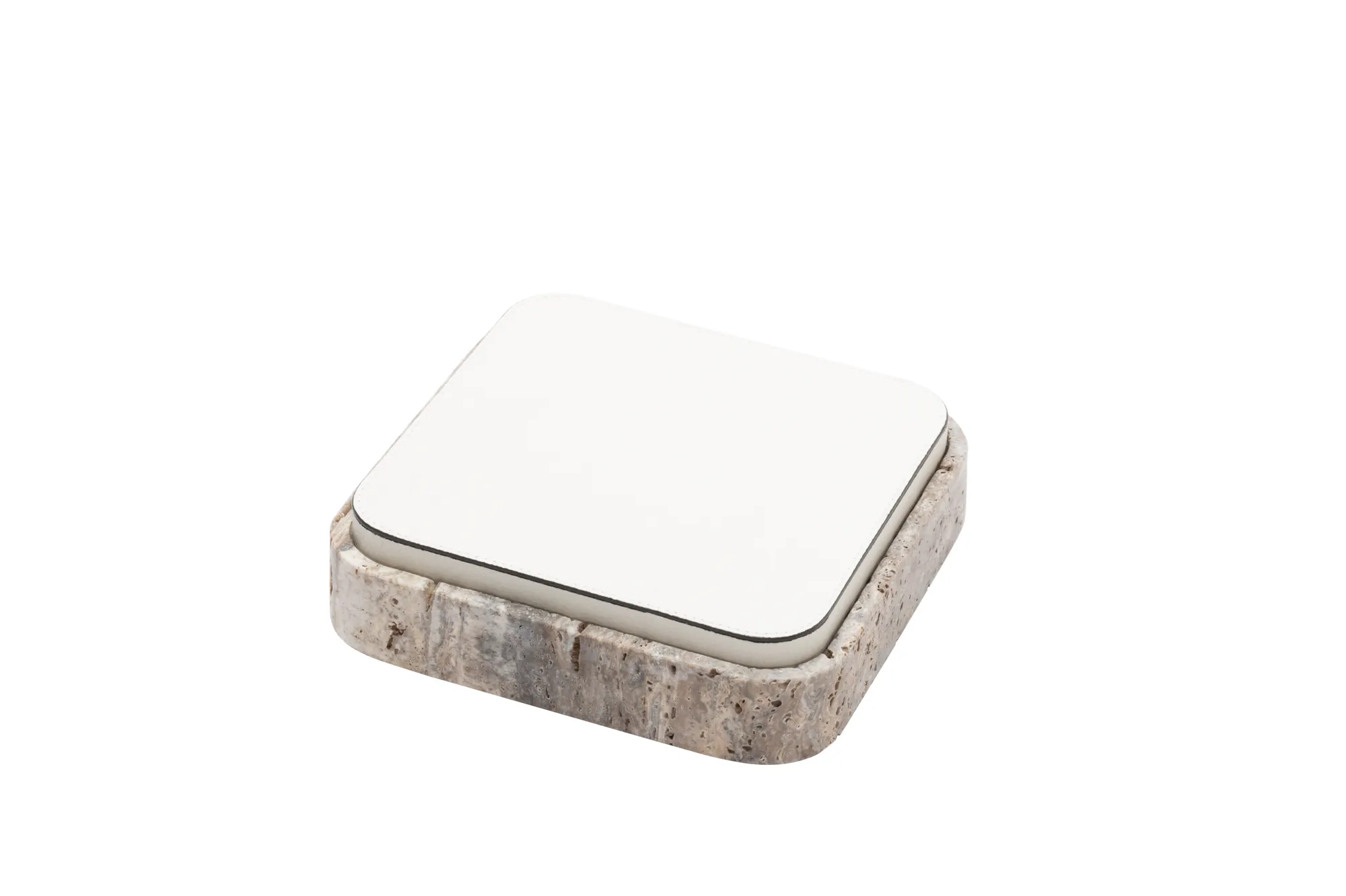 Featuring minimal geometric shapes, these boxes combine the beauty of travertine in several nuances of choice with the finest italian leather. Custom sizes available on request.