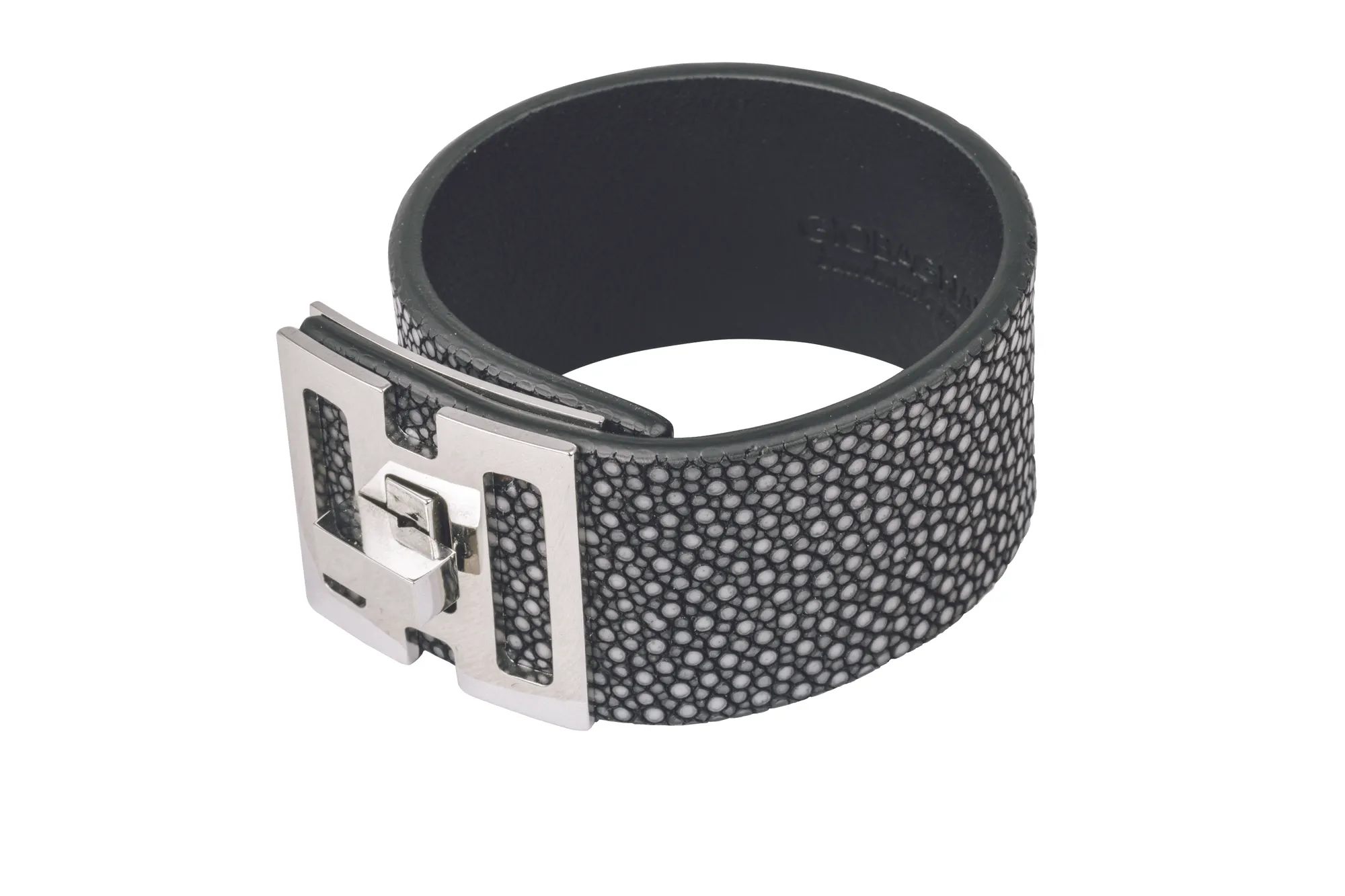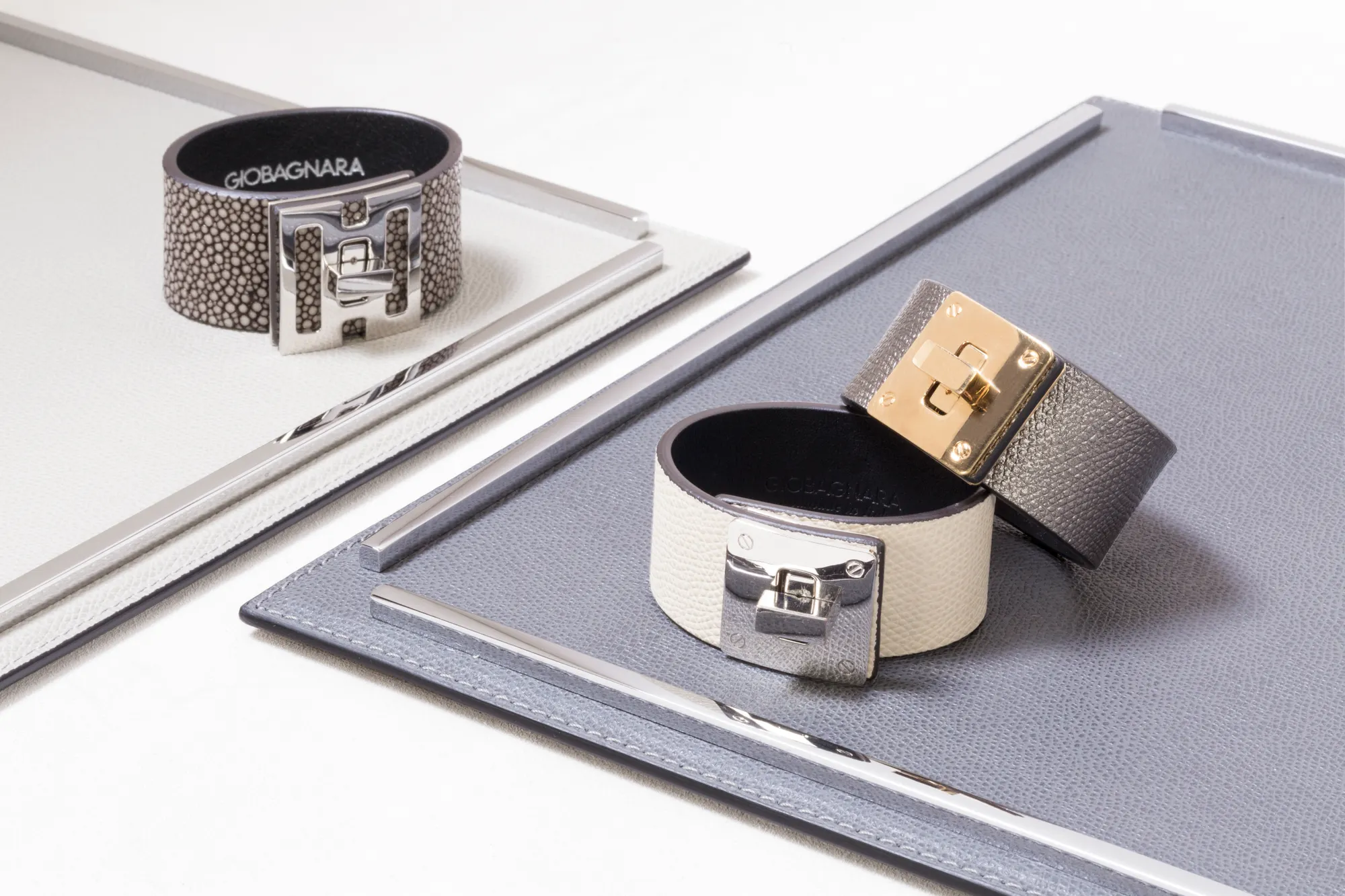 Palladium-plated or gold-plated leather belt bracelet with metal closing. Hypoallergenic. Inner circumference adjustable between 15.5 and 17 cm.