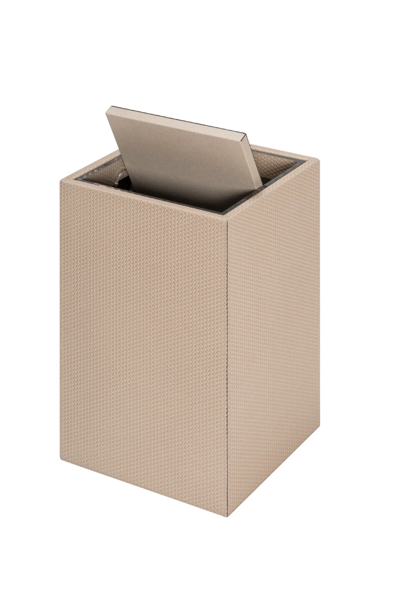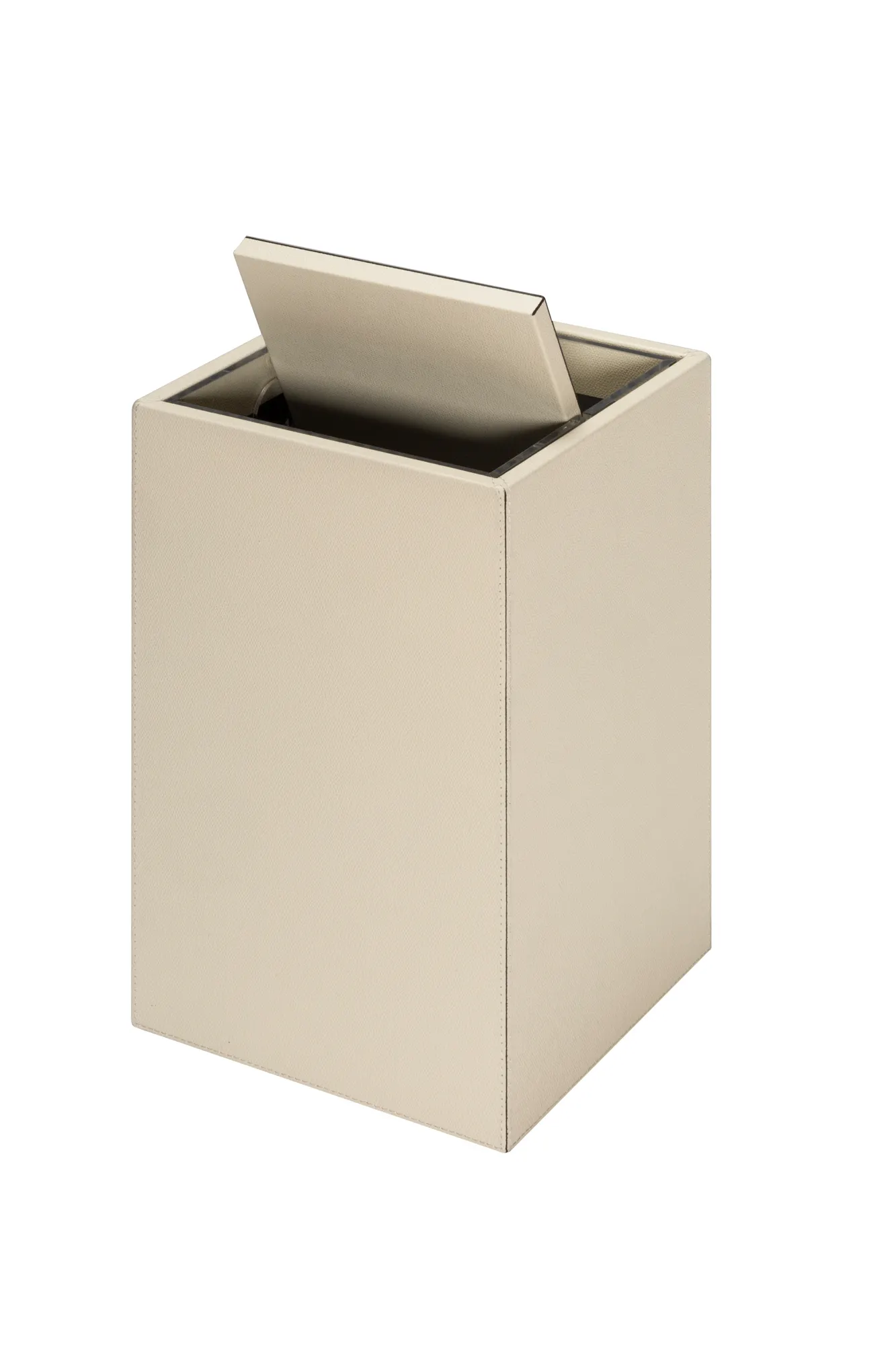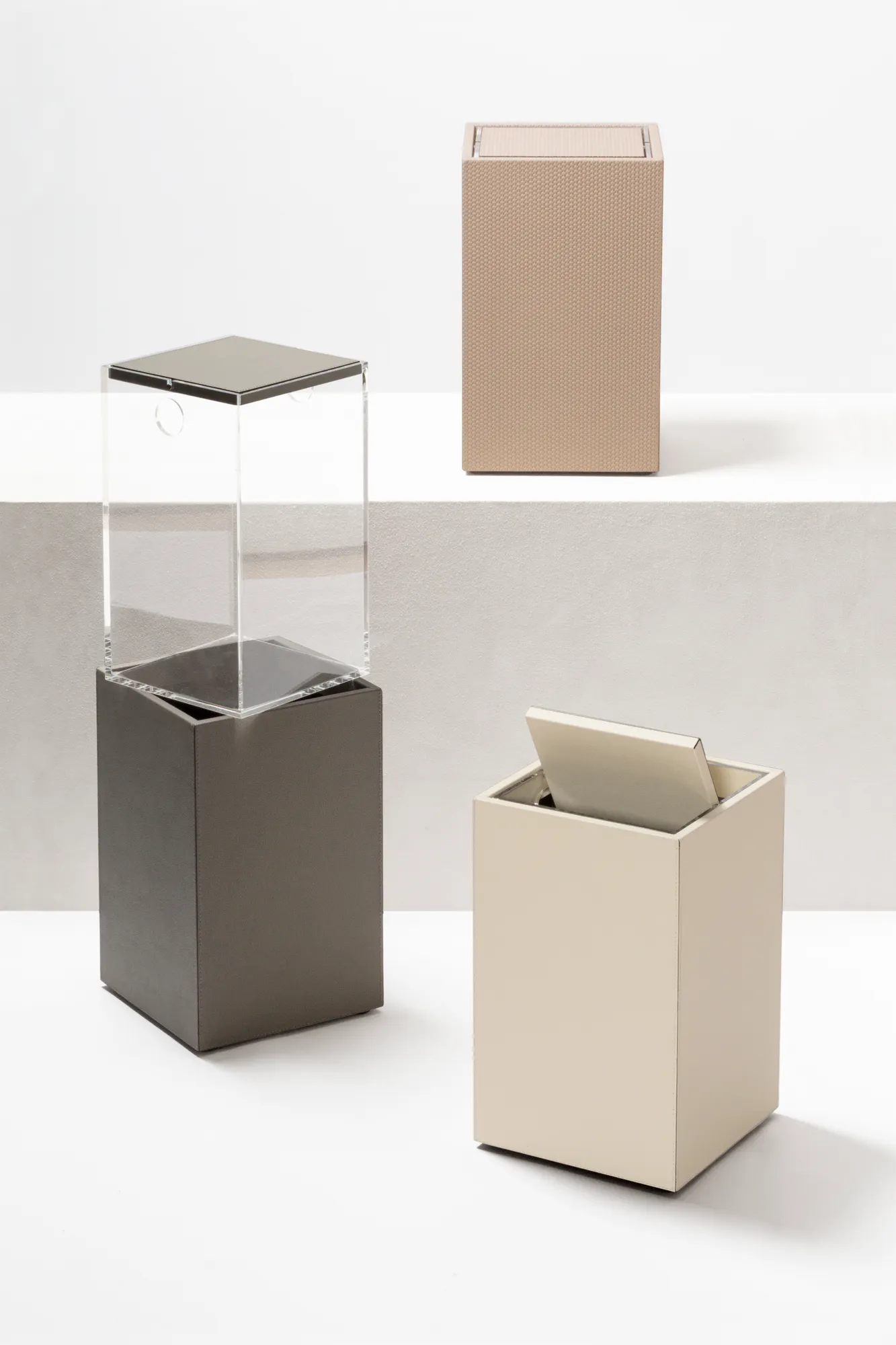 Leather-covered wood structure with non-slip waterproof rubber base underneath. The removable tilting lid and the plexiglass inner structure grant an easy cleaning.