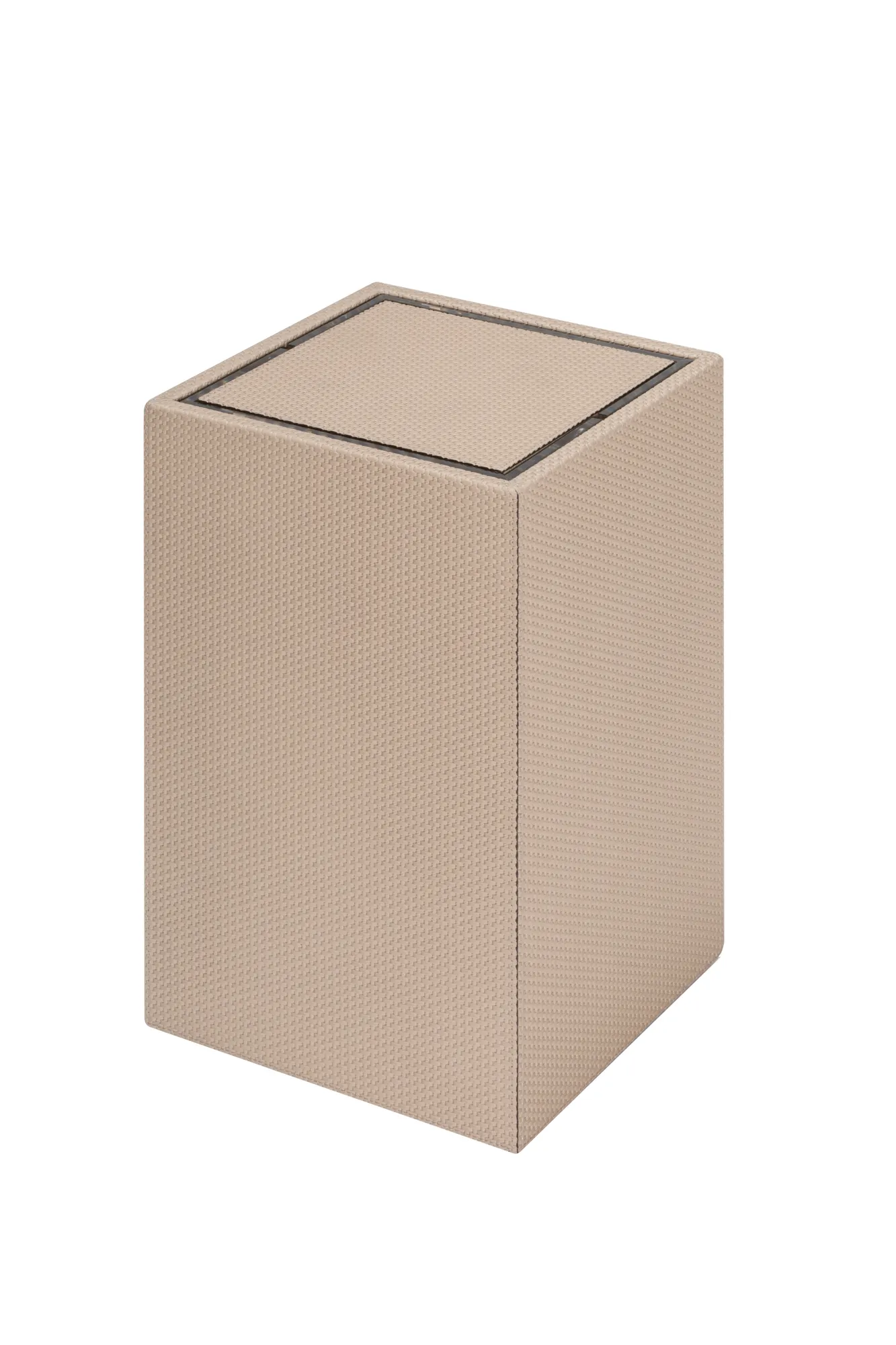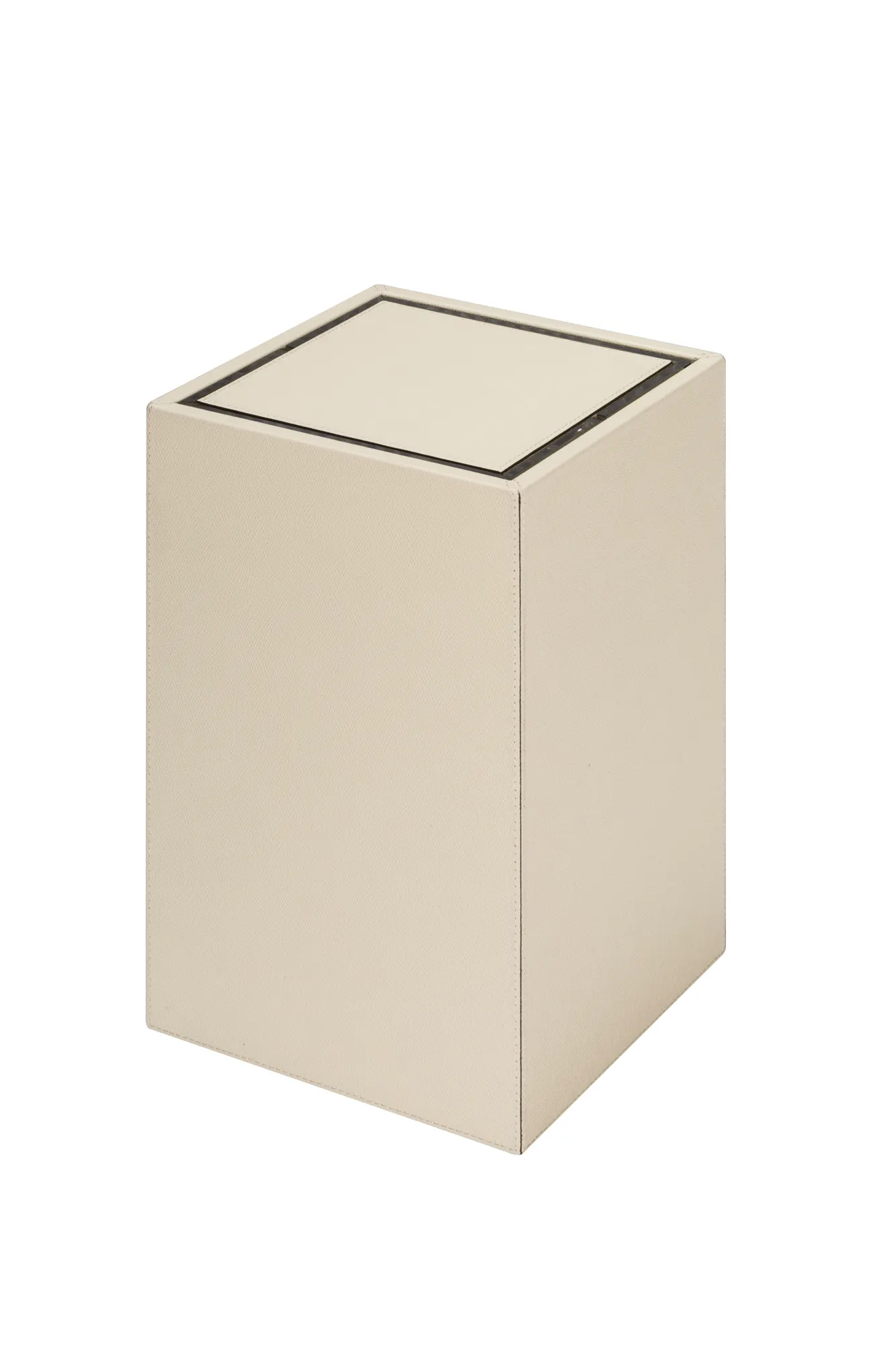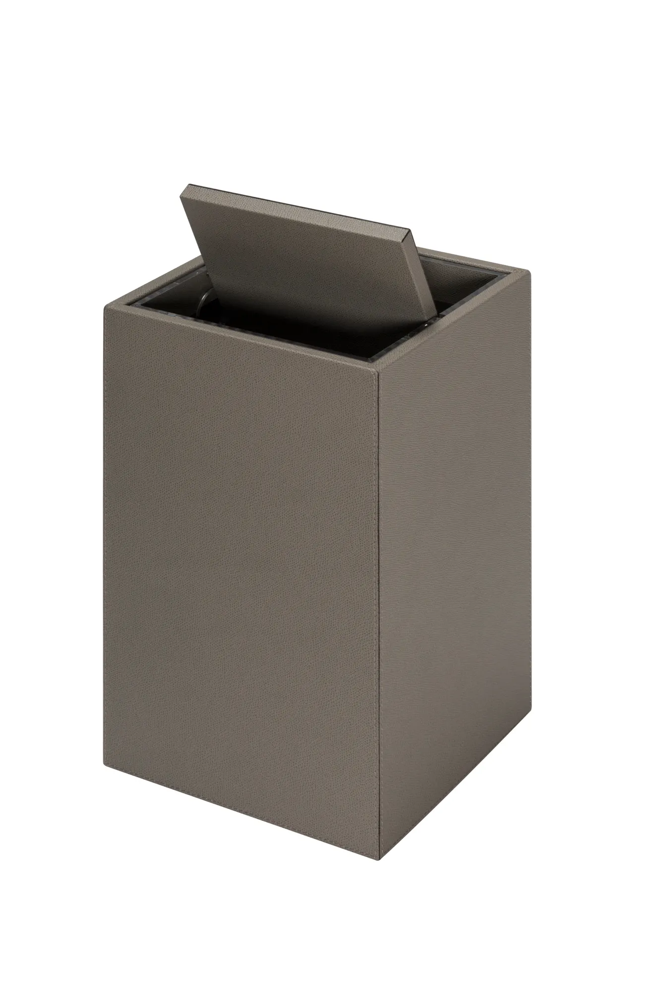 Leather-covered wood structure with non-slip waterproof rubber base underneath. The removable tilting lid and the plexiglass inner structure grant an easy cleaning.