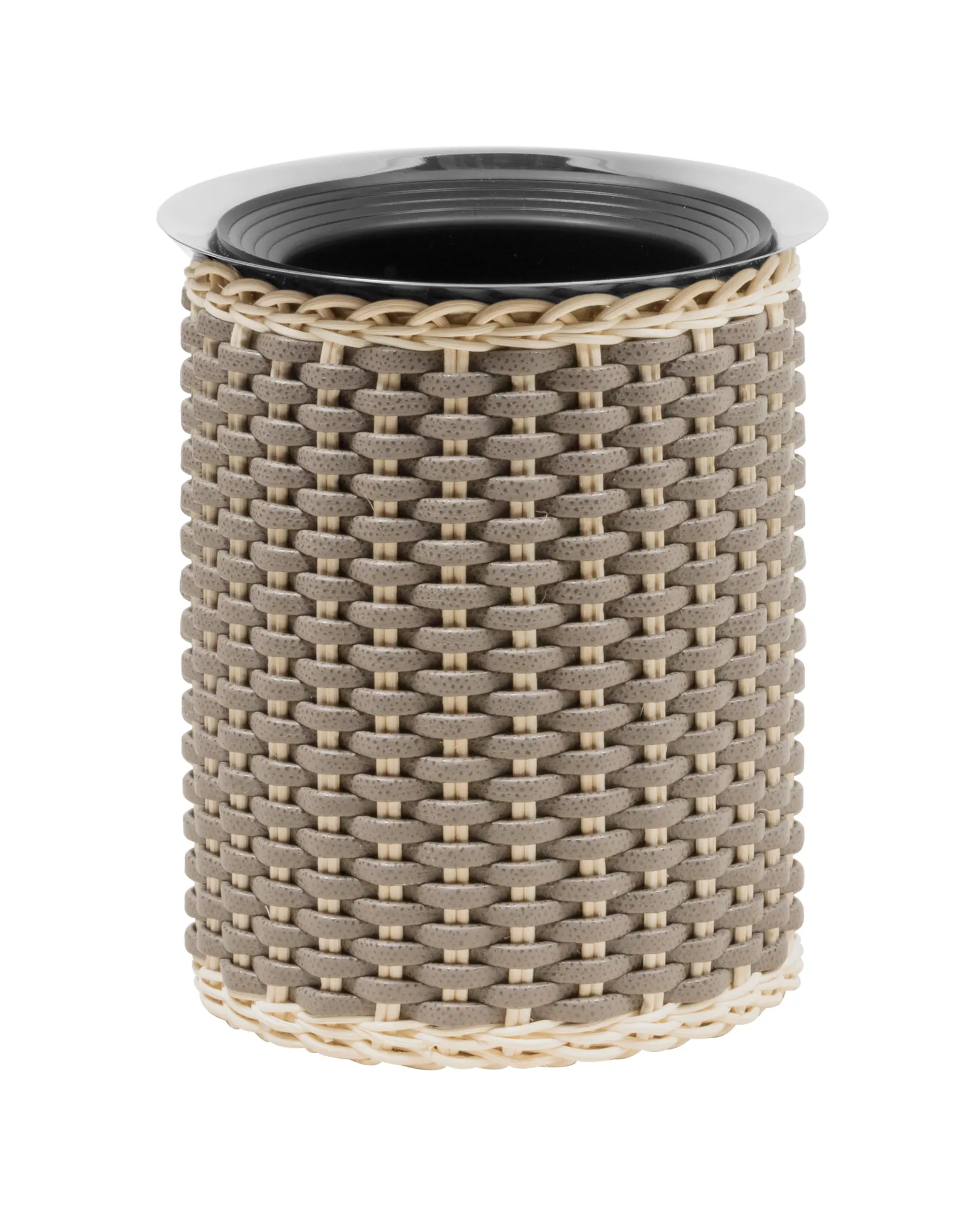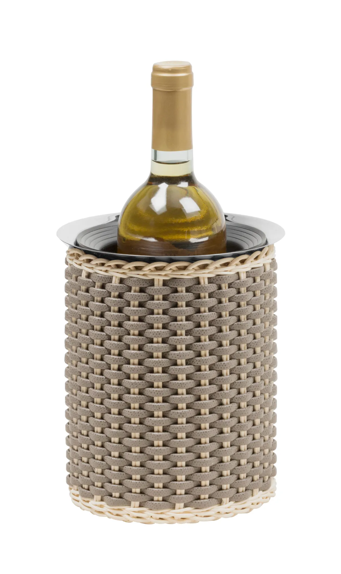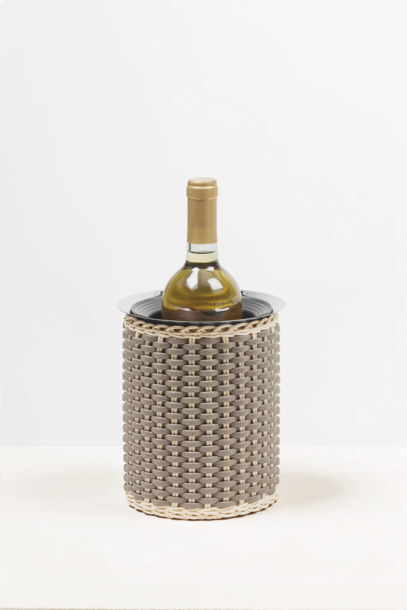 Insulated stainless steel structure covered in woven leather and rattan. Non-slip waterproof rubber base underneath. Works with 4 reusable ice packs, included.