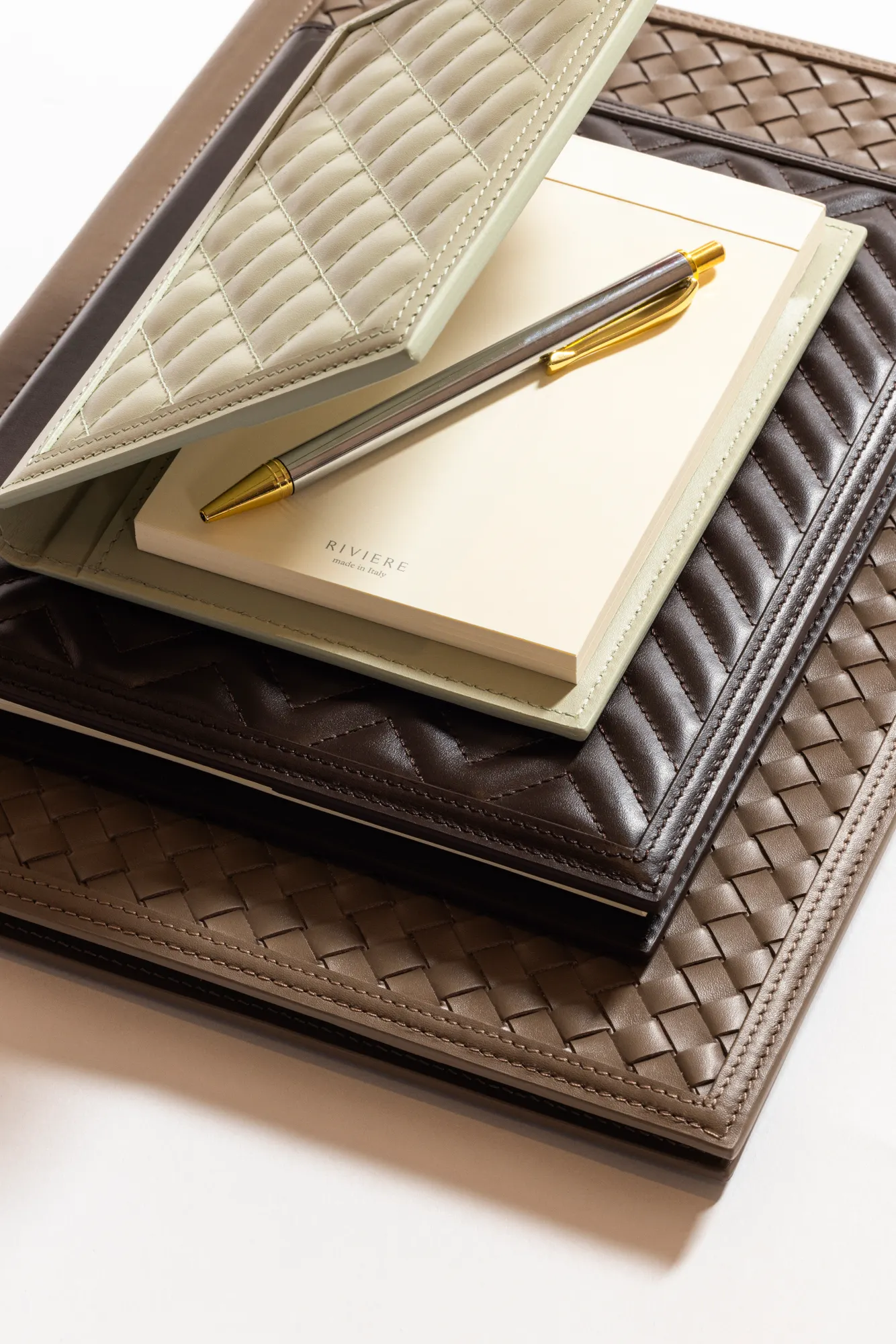 Leather notepad holder featuring a padded handwoven pattern. Side pencil holder with pen. Includes a notepad made of 70 ivory paper sheets.