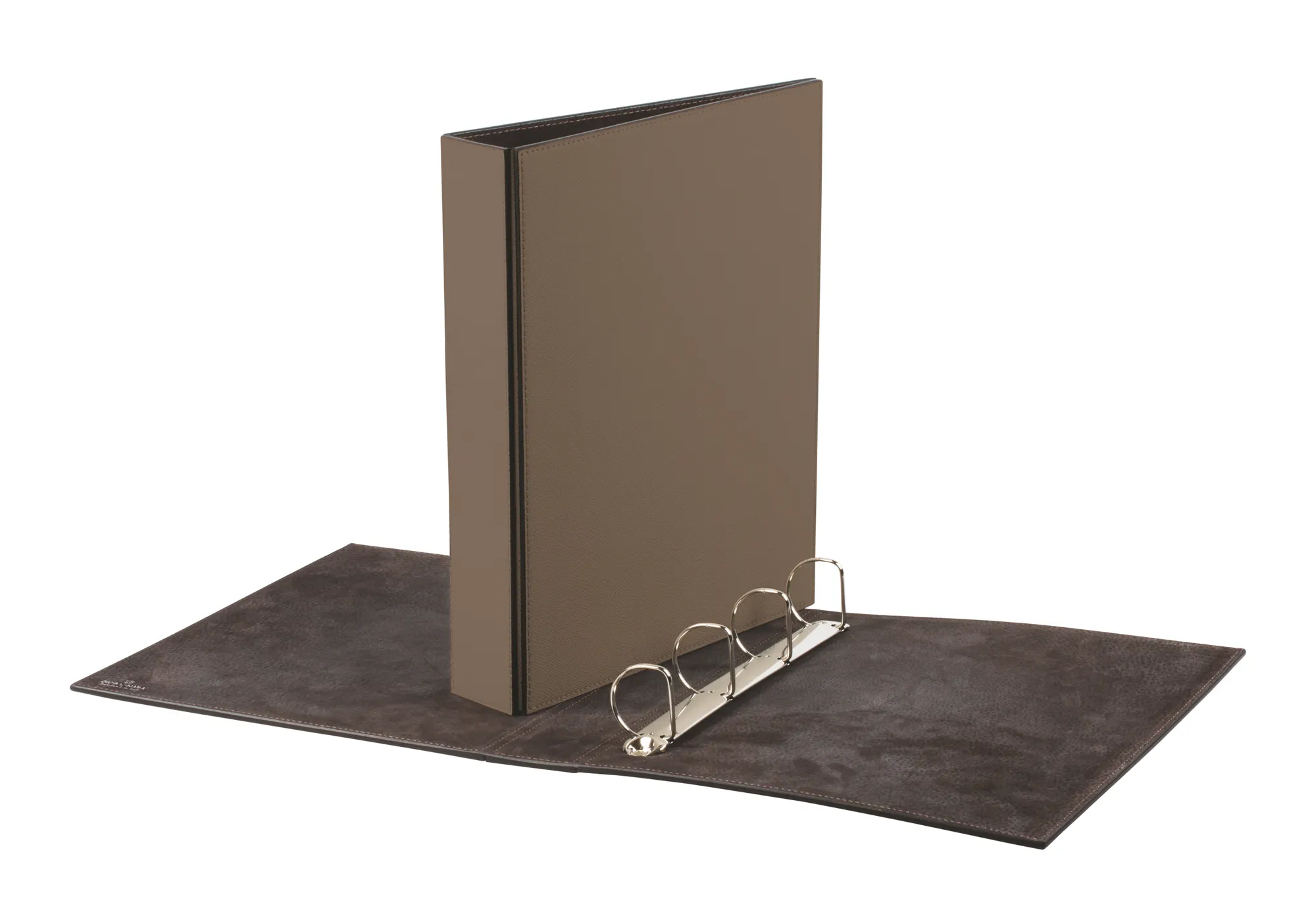 Leather cover and suede lining. 4 D rings Ø 4 cm. Title pocket on spine with plastic protector.