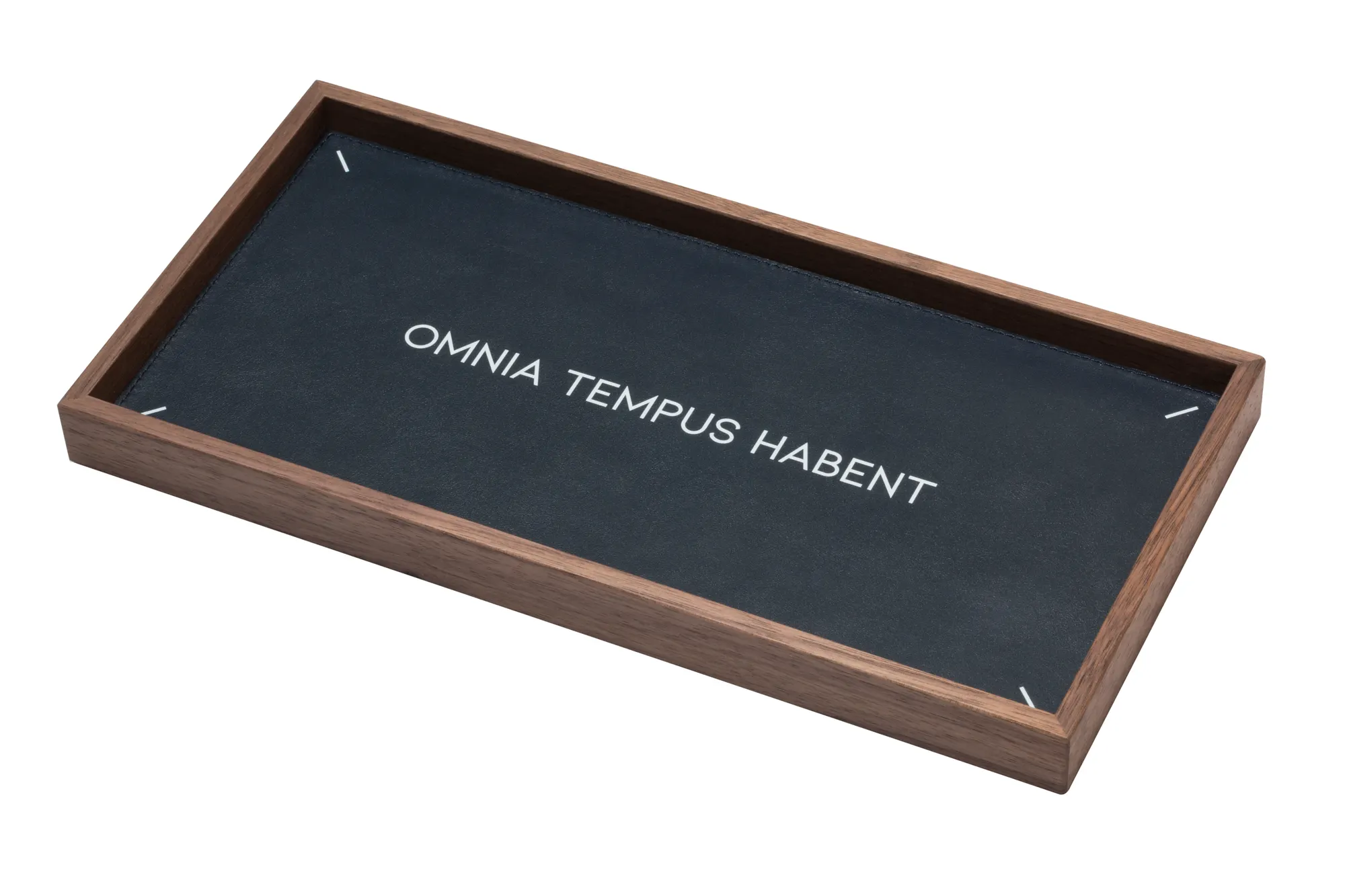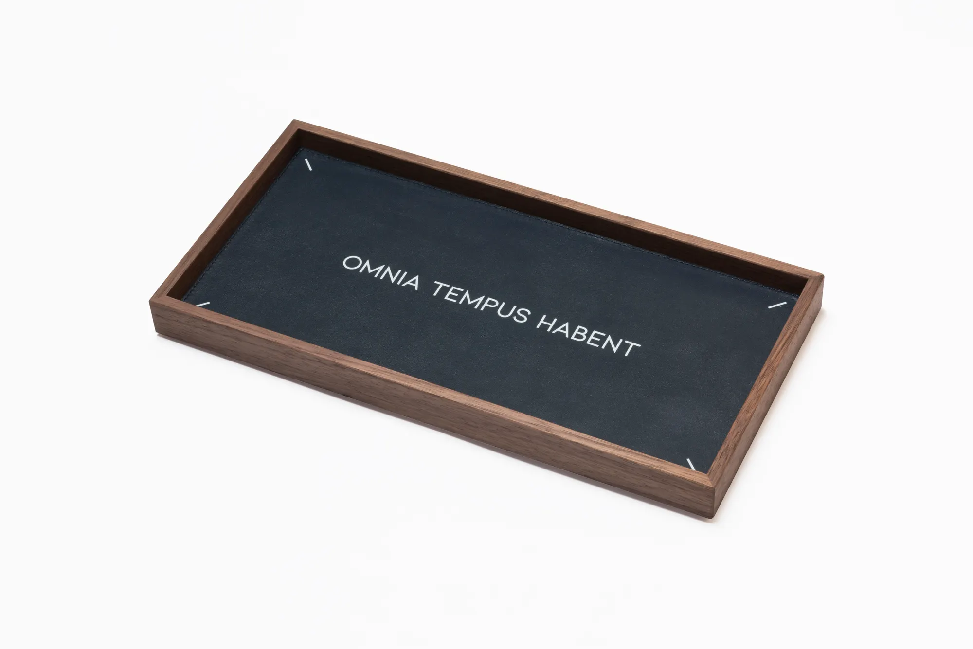 A collection of rectangular small valet trays with various Latin quotes and translations, available in different calfskin nappa finishes.