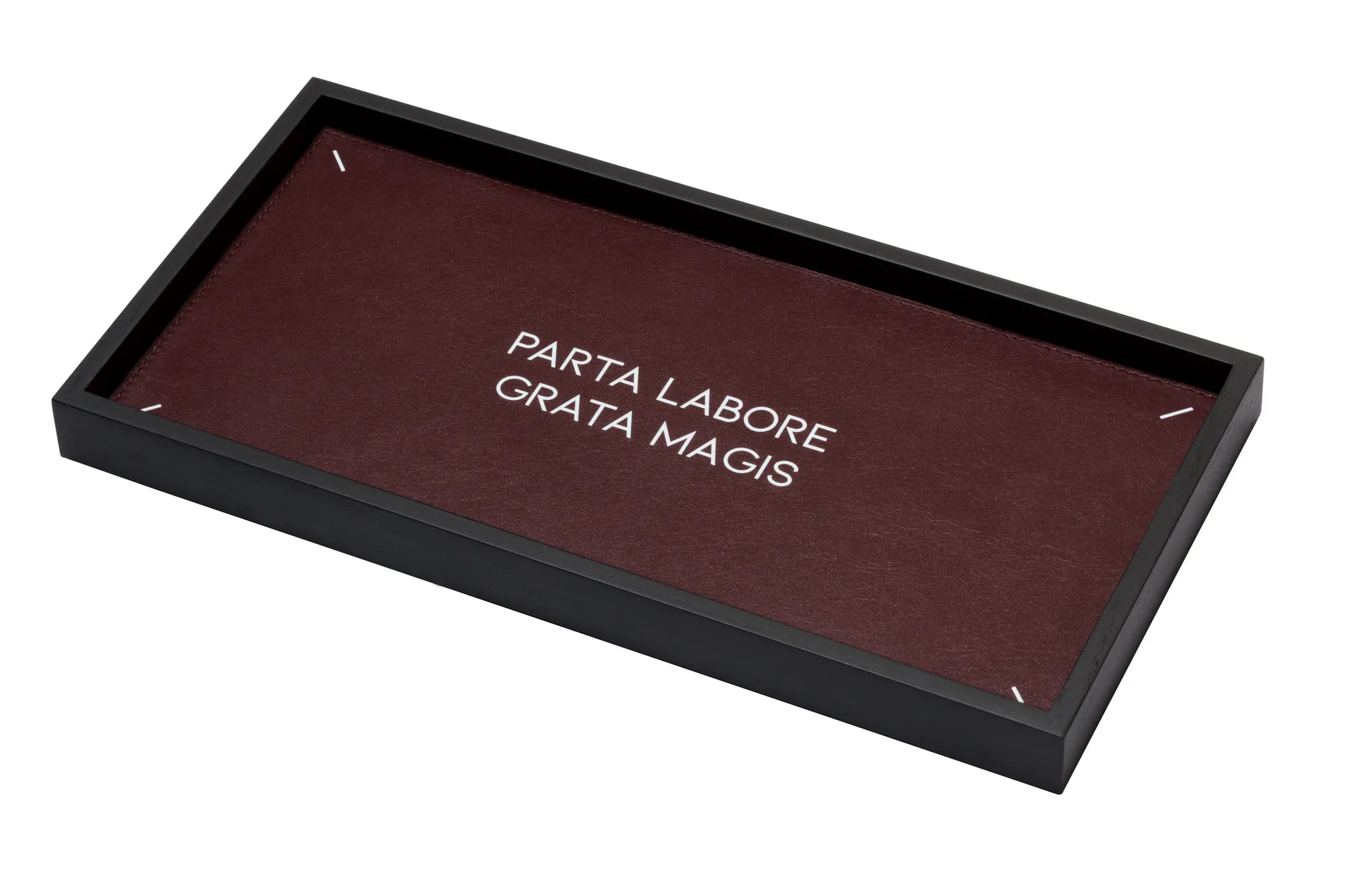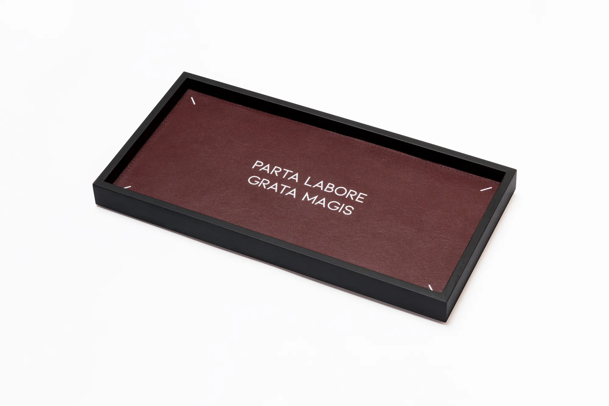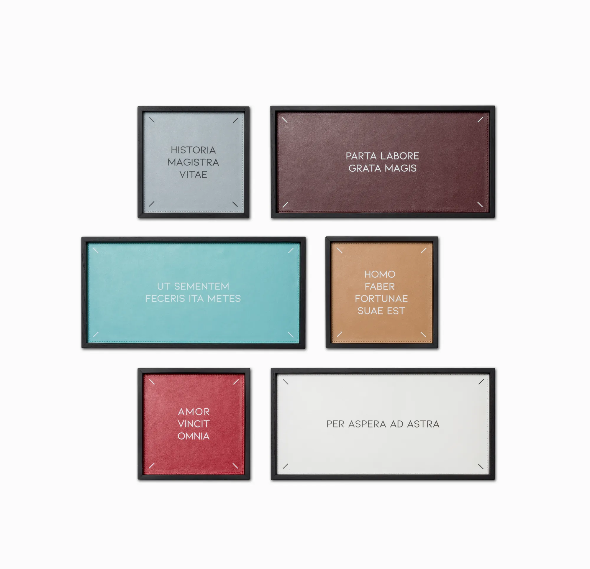 A collection of rectangular small valet trays with various Latin quotes and translations, available in different calfskin nappa finishes.