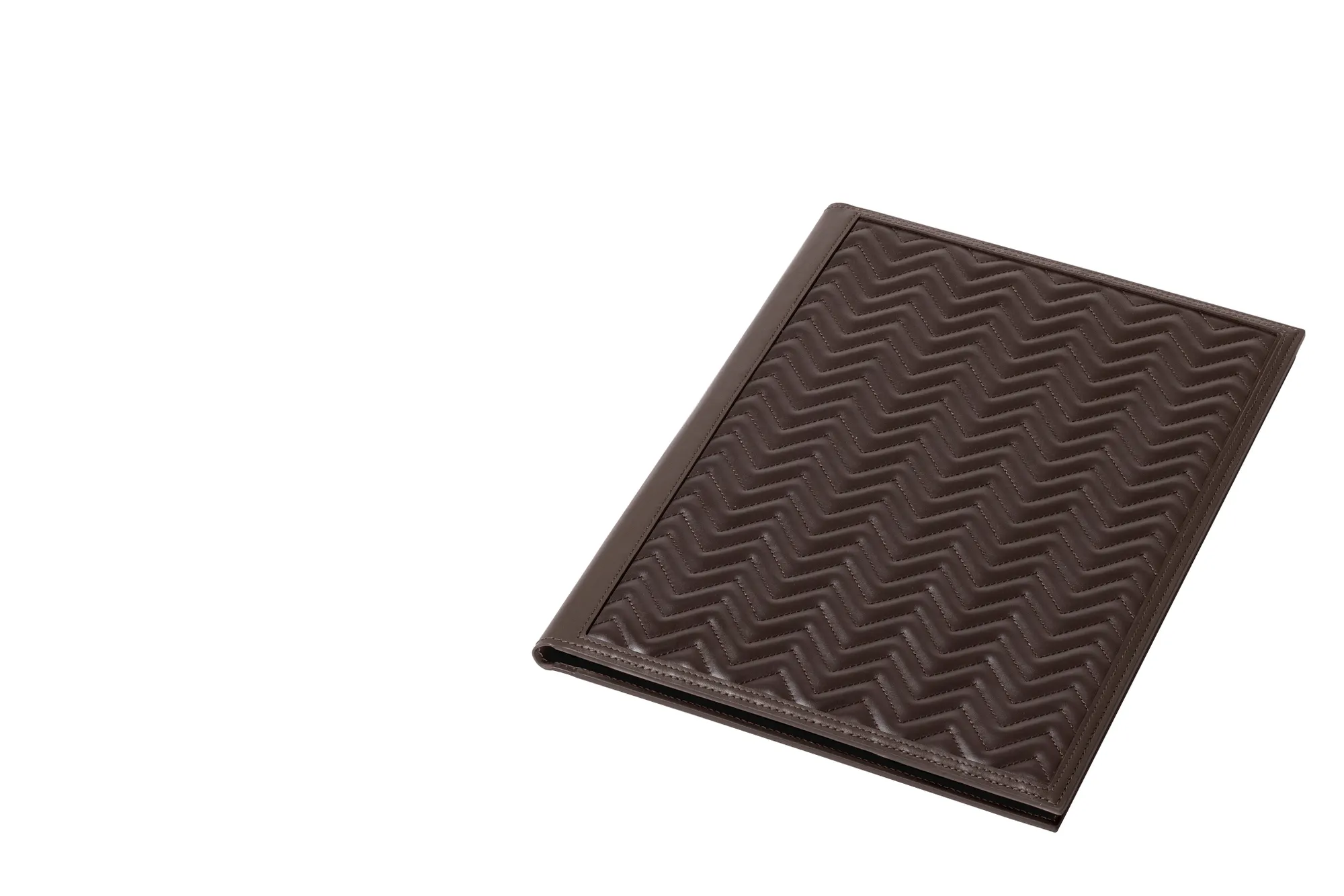 Leather notepad holder featuring a padded quilted herringbone pattern. Side pencil holder with pen. Includes a notepad made of 70 ivory paper sheets.