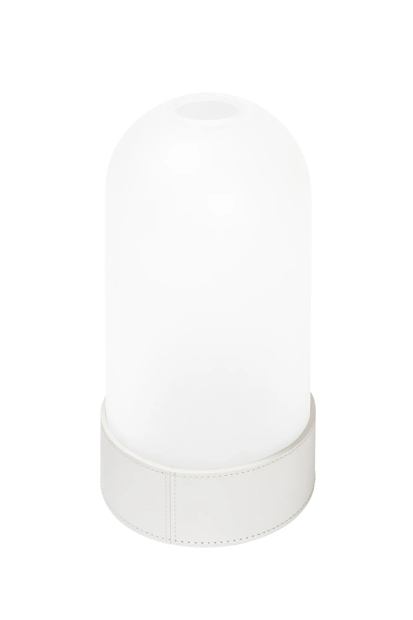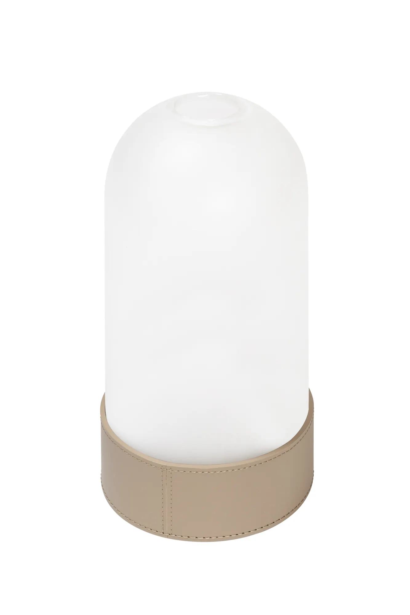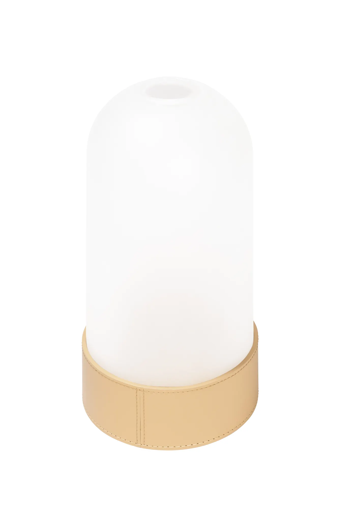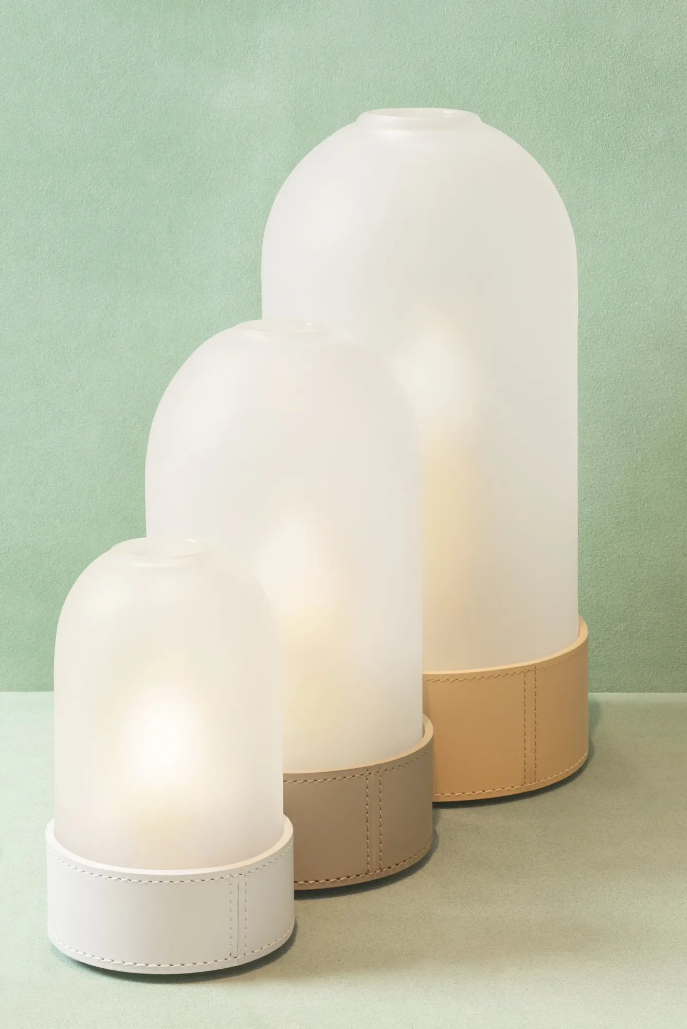 Hotaru lanterns serve as versatile accents able to enhance their surroundings. A finest regenerated leather base with water-resistant and UV-resistant finish hosts a removable frosted borosilicate glass cap which emanates a subtle, diffused glow creating enchanting atmospheres.