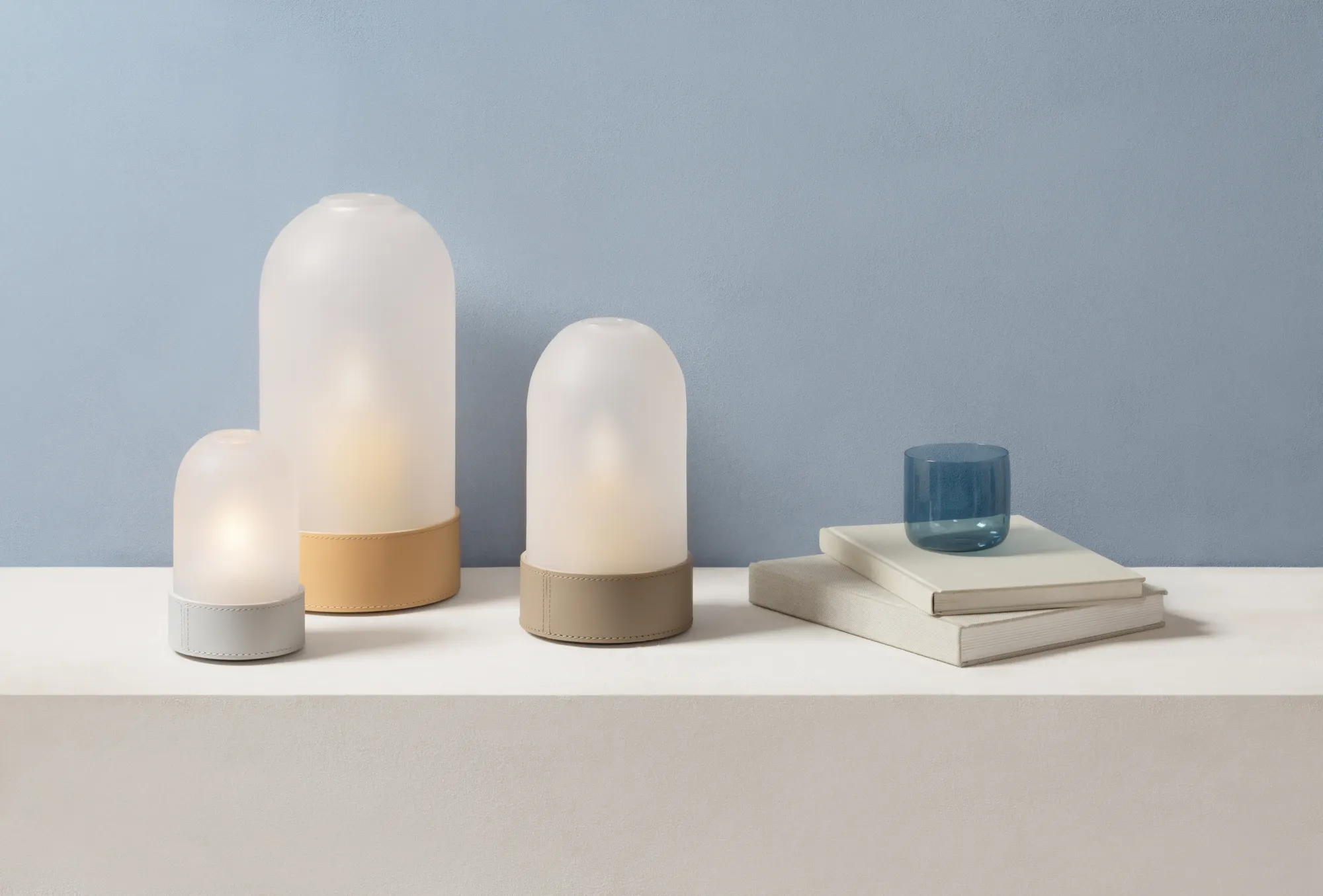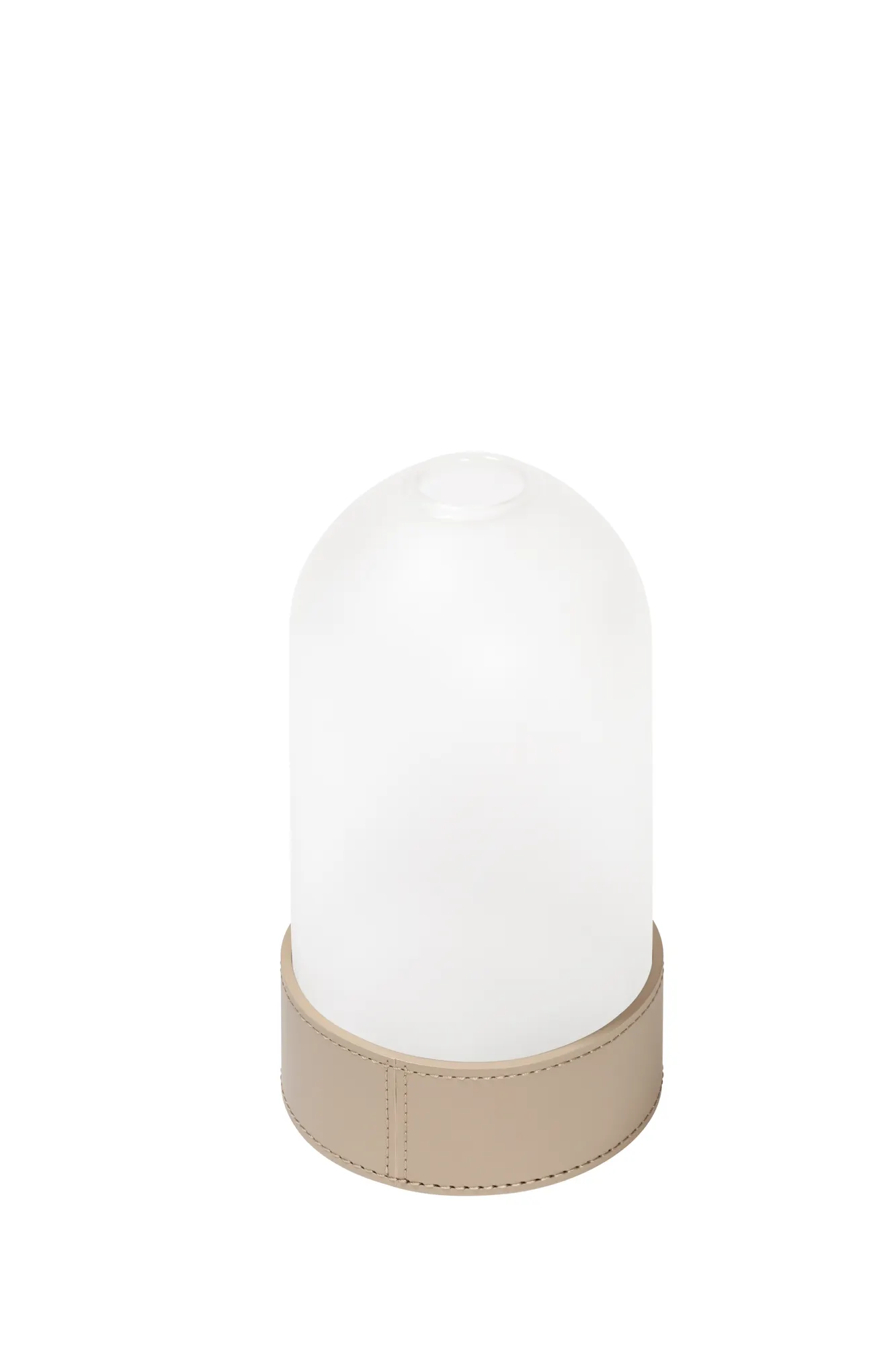 Hotaru lanterns serve as versatile accents able to enhance their surroundings. A finest regenerated leather base with water-resistant and UV-resistant finish hosts a removable frosted borosilicate glass cap which emanates a subtle, diffused glow creating enchanting atmospheres.