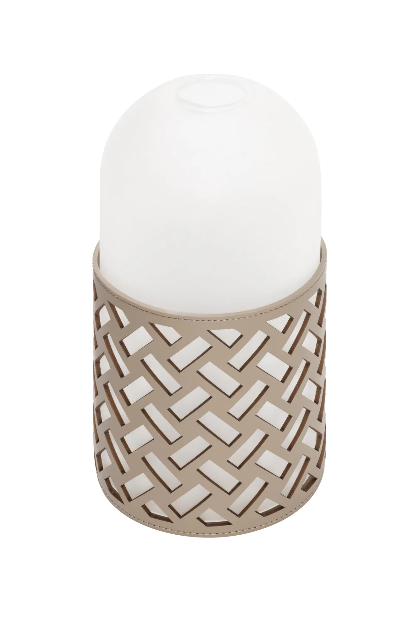 Hotaru lanterns serve as versatile accents able to enhance their surroundings. A finest regenerated leather base featuring a perforated unique dynamic motif and provided with a water-resistant and UV-resistant finish hosts a removable frosted borosilicate glass cap which emanates a subtle, diffused glow creating enchanting atmospheres.