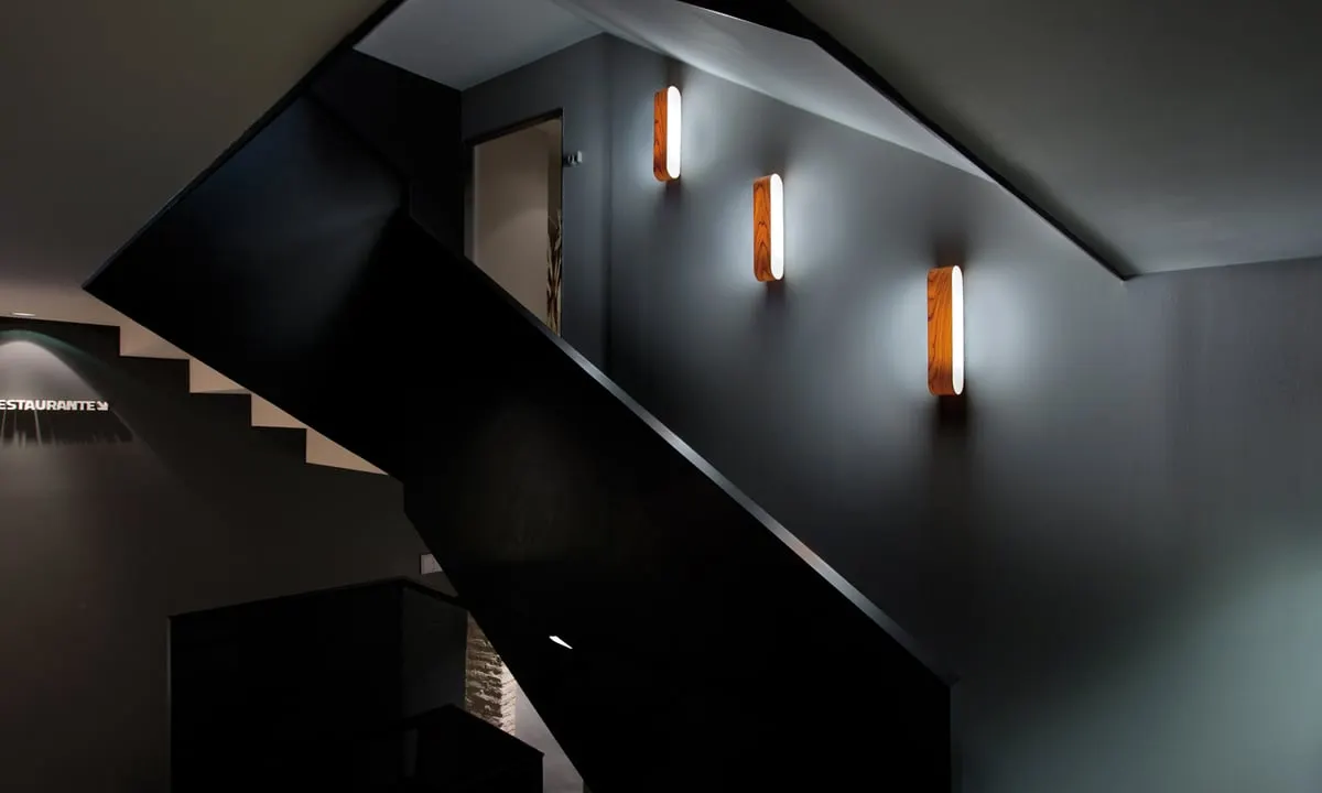 I-CLUB SMALL THE SYMMETRICAL LIGHT. Designed by Burkhard Dämmer, I-Club epitomises the use of clean lines in good design. The symmetrical beauty of this lamp is evident across each of its forms. The I-Club Small Wall is ideally sized to trace the sloping wall of a stairwell—evenly spaced apart—or to illuminate a treasured painting. A small lamp to brighten cosy spaces. The I-Club Small Wall is available in the following wood veneers: Natural Cherry, Ivory White, Natural Beech, Yellow, Orange, Red, Blue, Grey, Pale Rose, and Sea Blue.