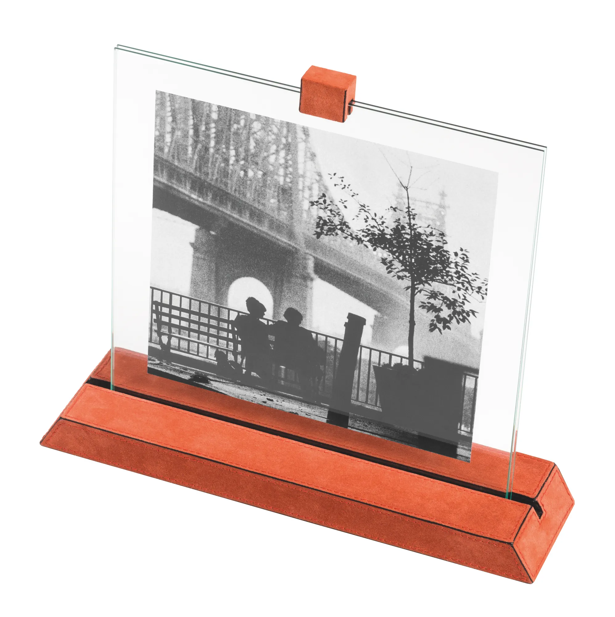 Leather covered wood base hosting a polished glass frame. Pictures can fit horizontally or vertically.