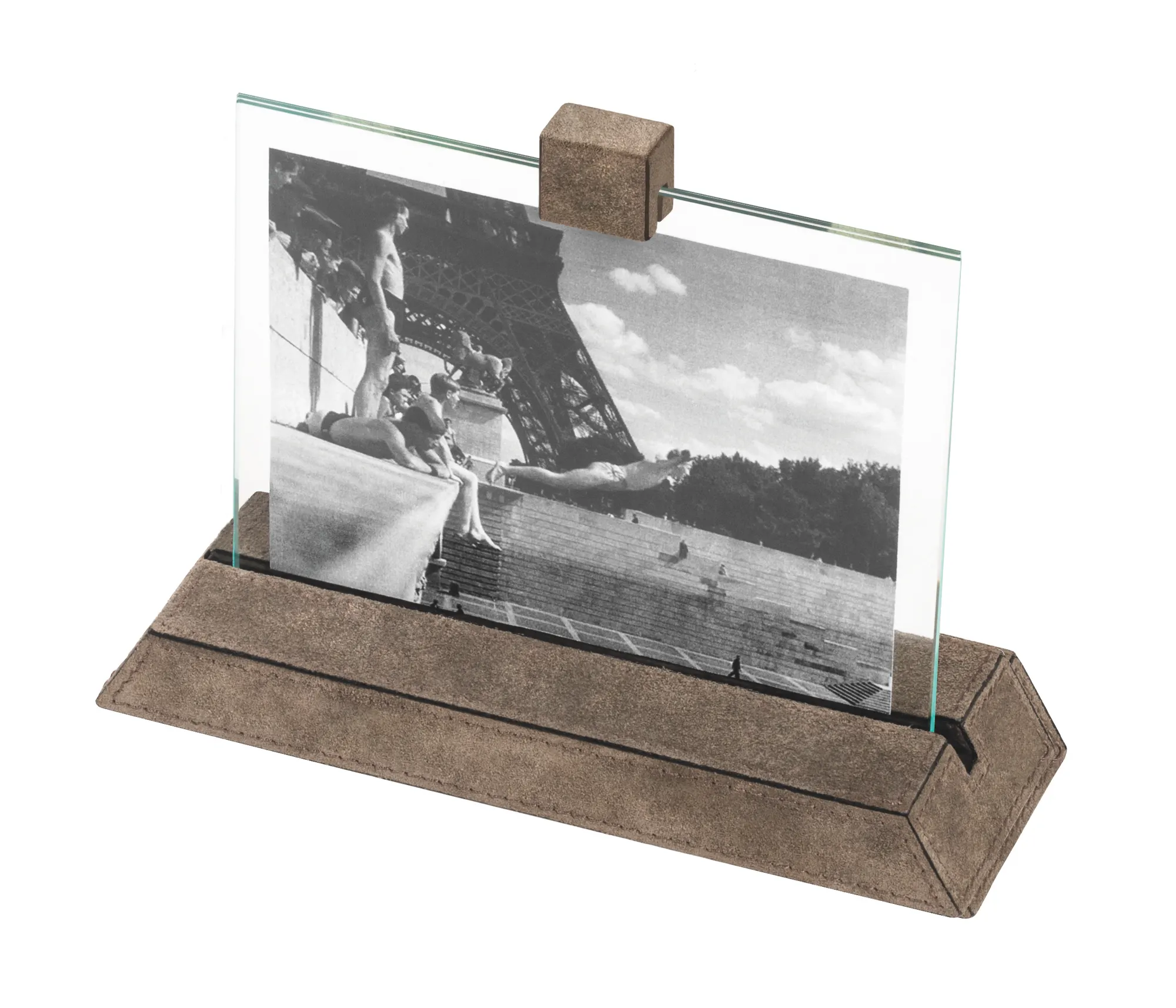 Leather covered wood base hosting a polished glass frame. Pictures can fit horizontally or vertically.