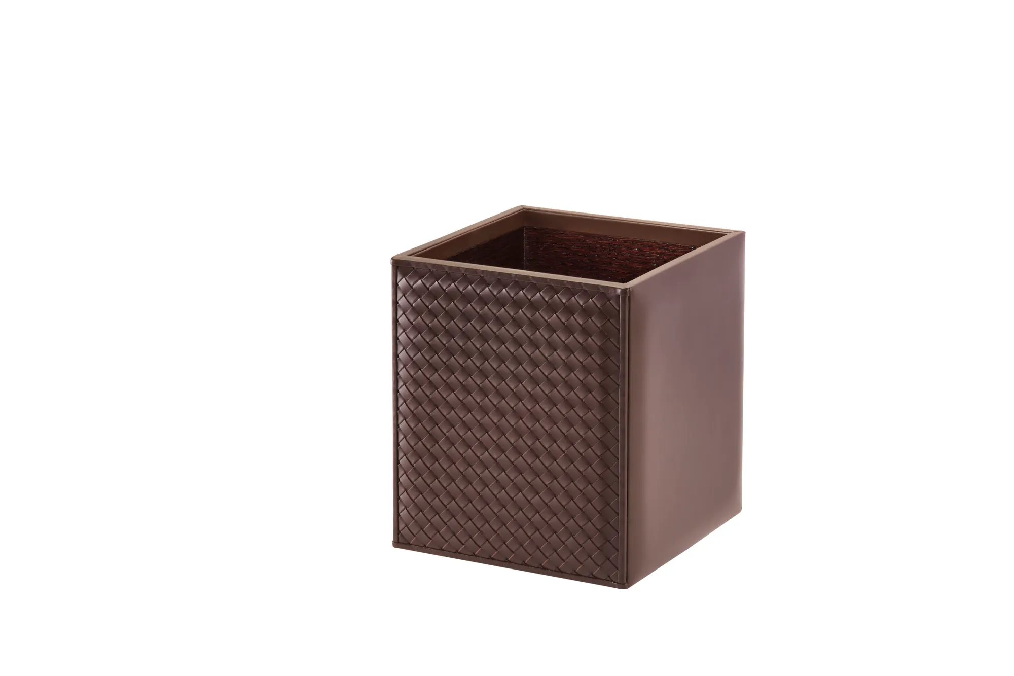 Waste basket, handwoven leather on two sides, lining in varnished wood.