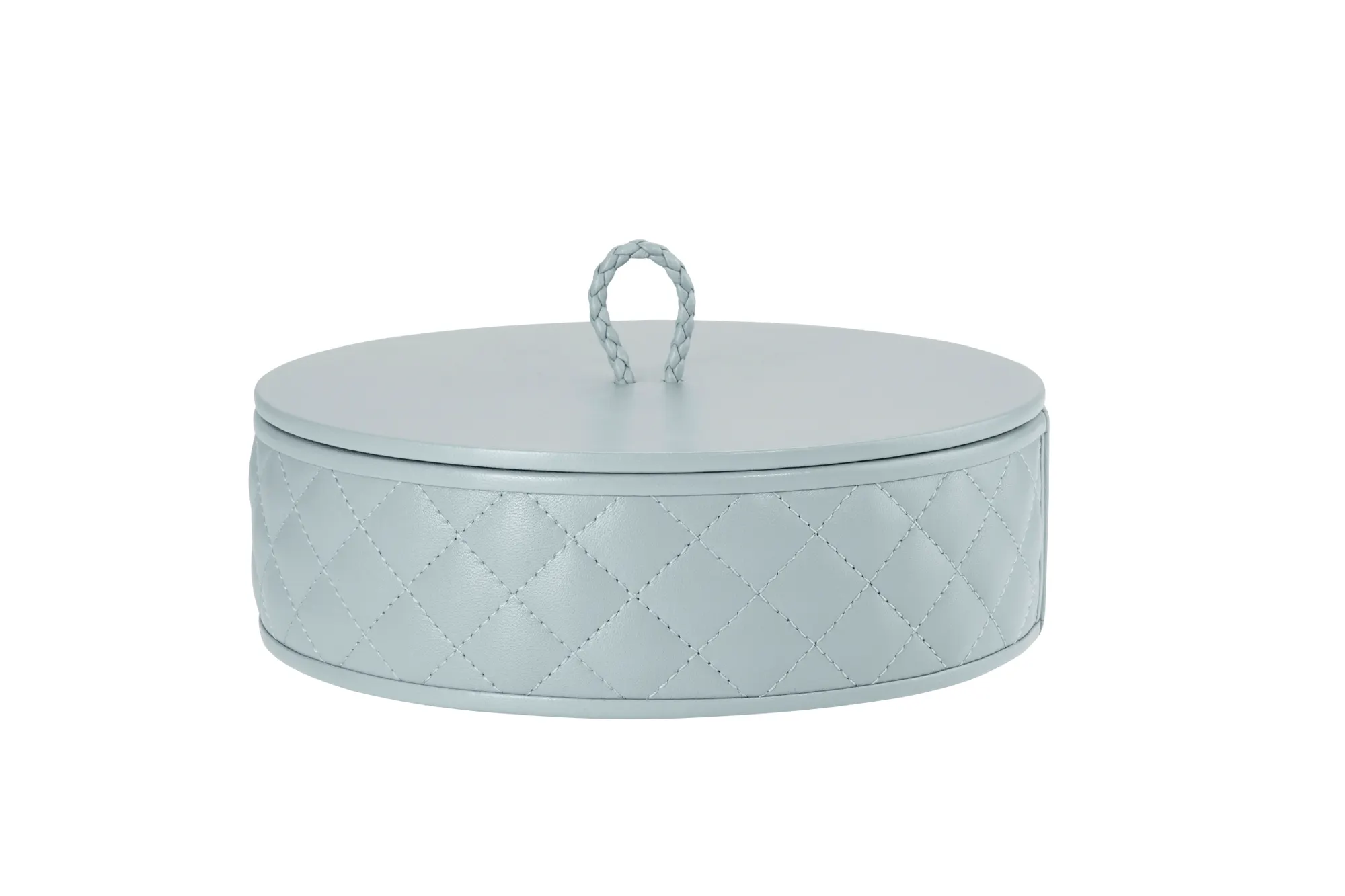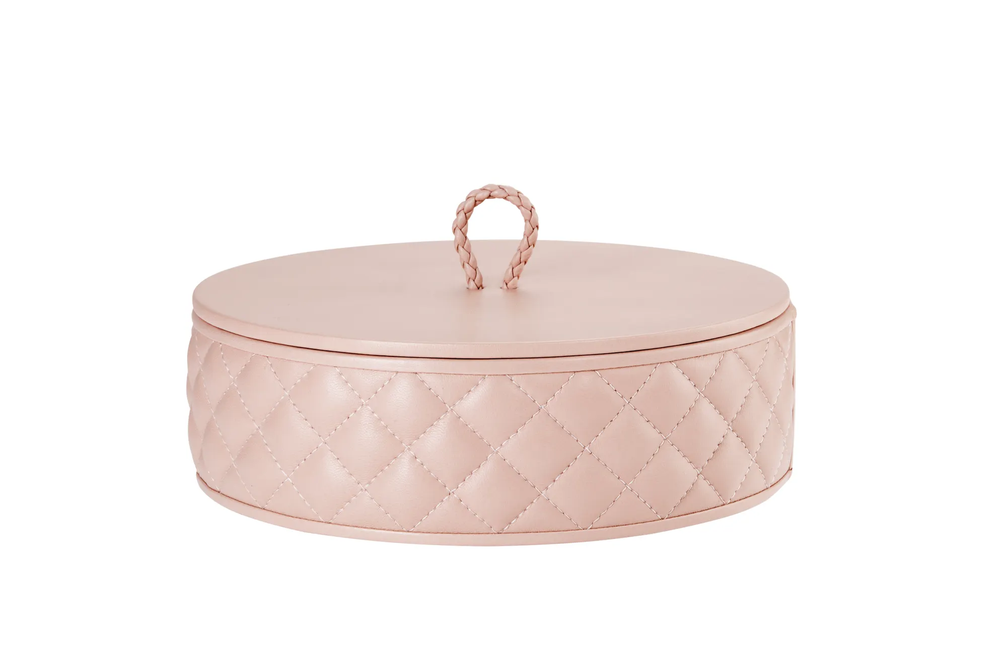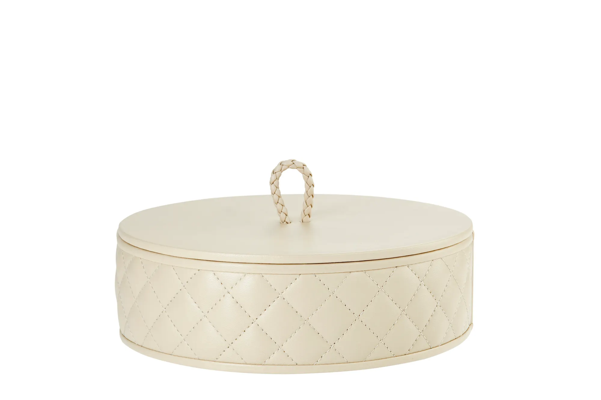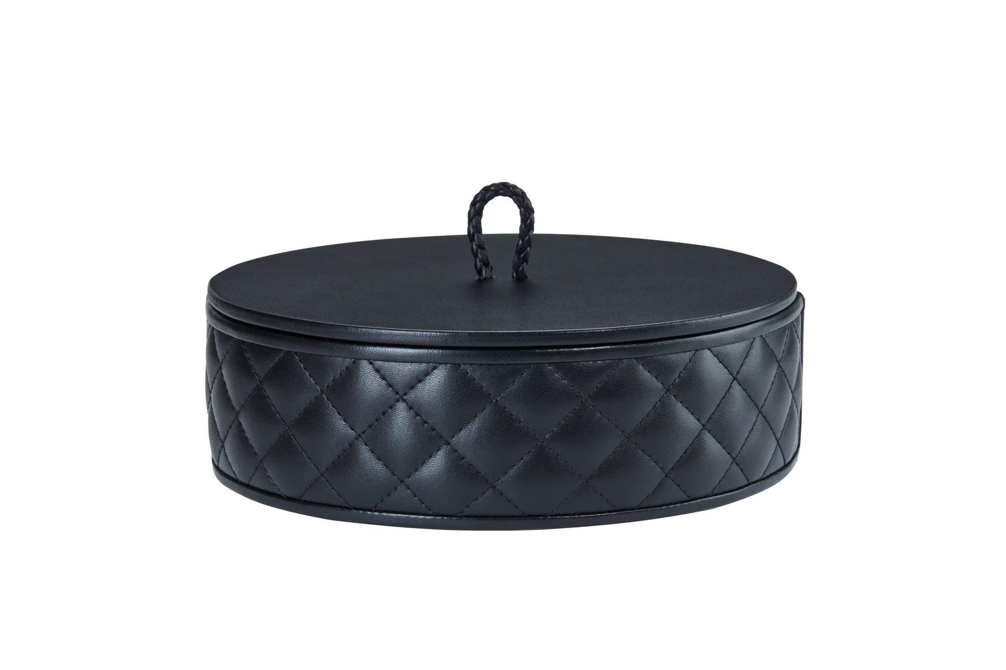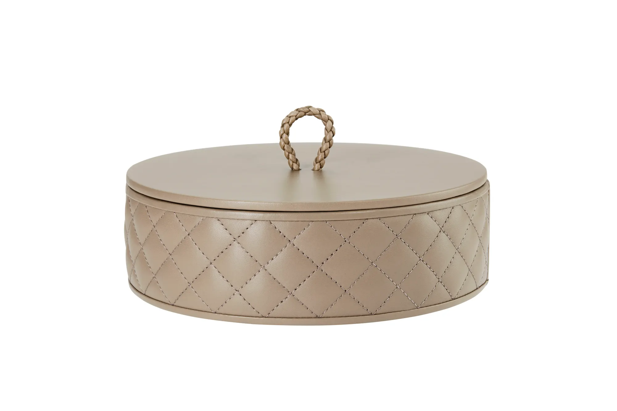 Round leather box with lid, quilted diamonds padded finish.