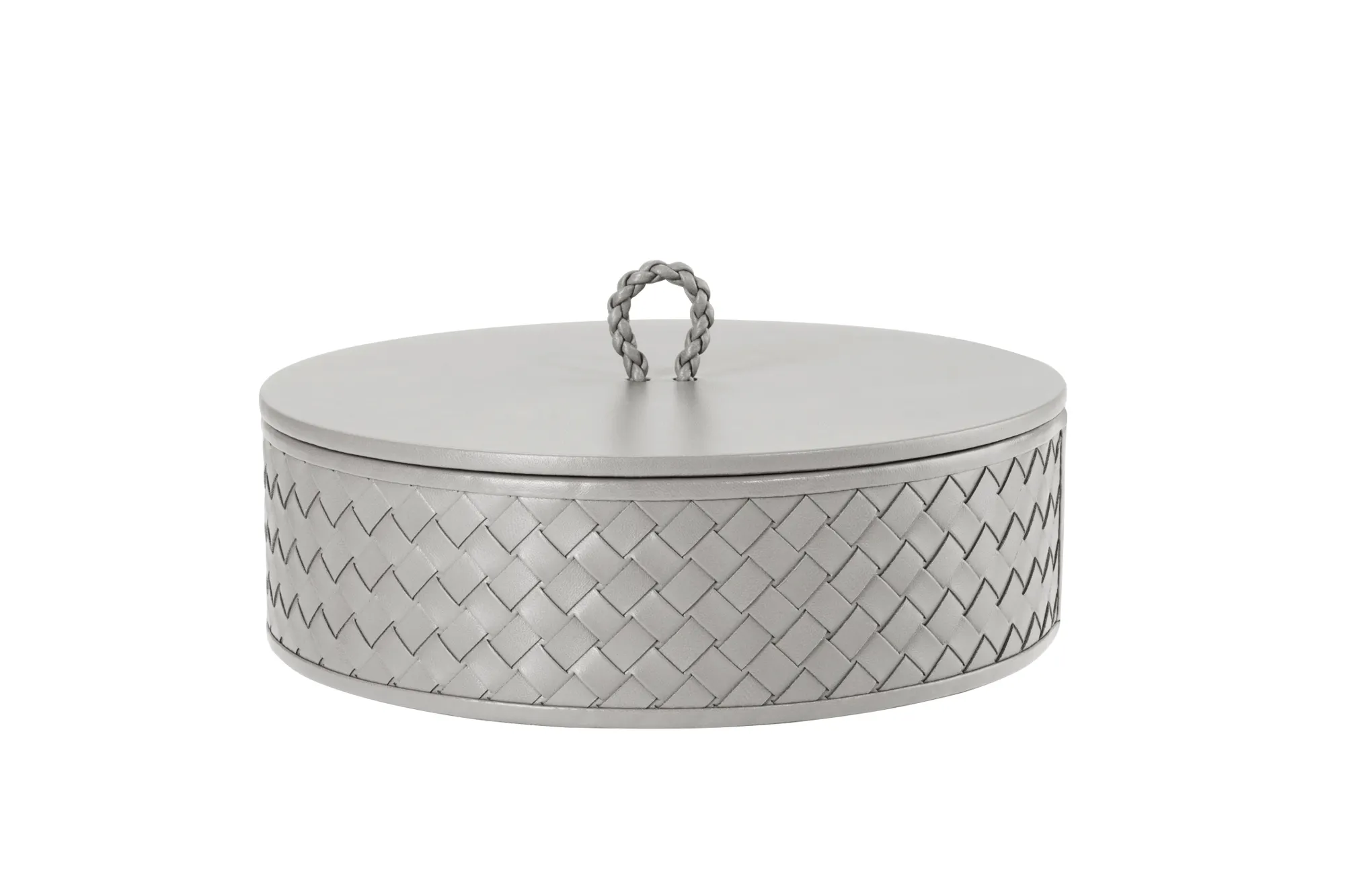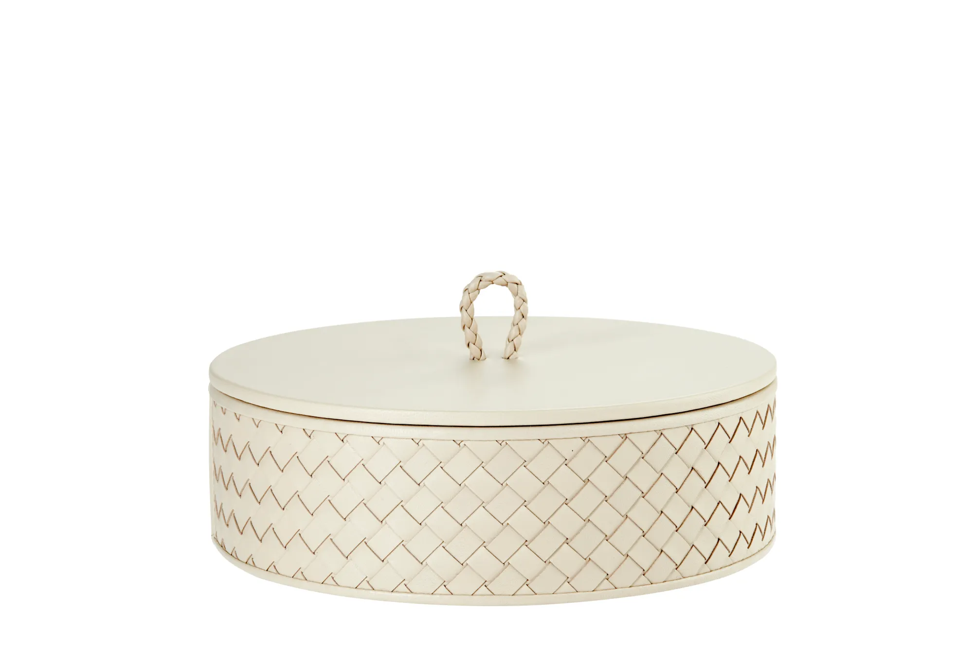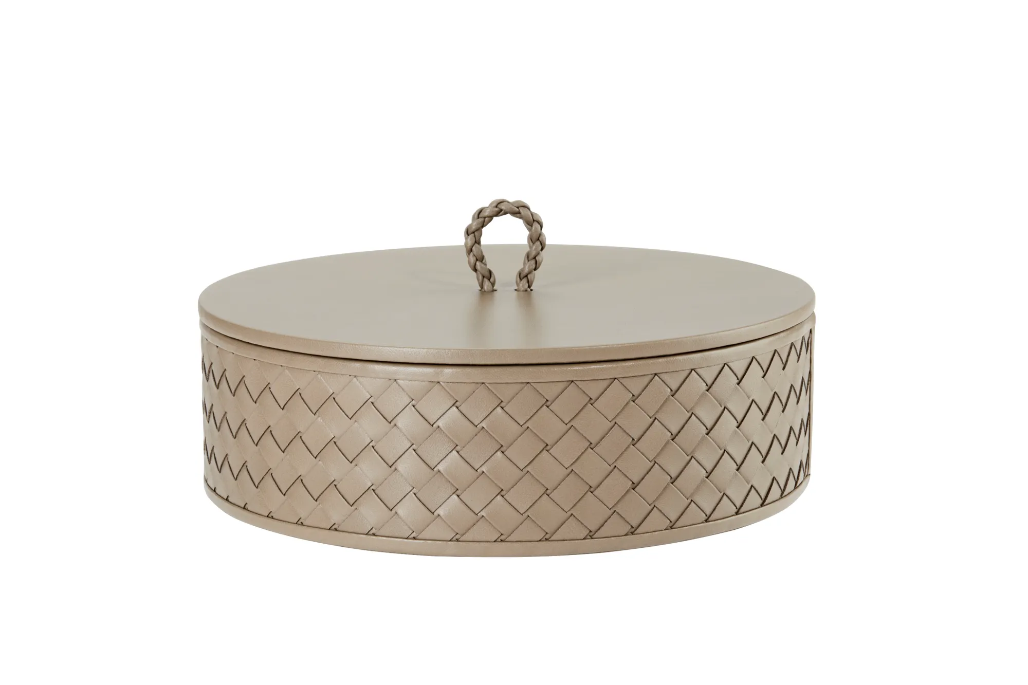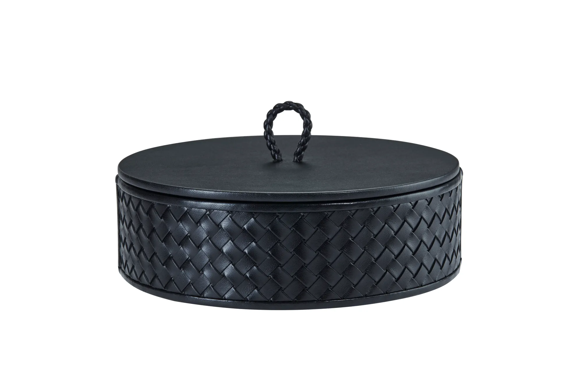 Round leather box with lid, handwoven finish.