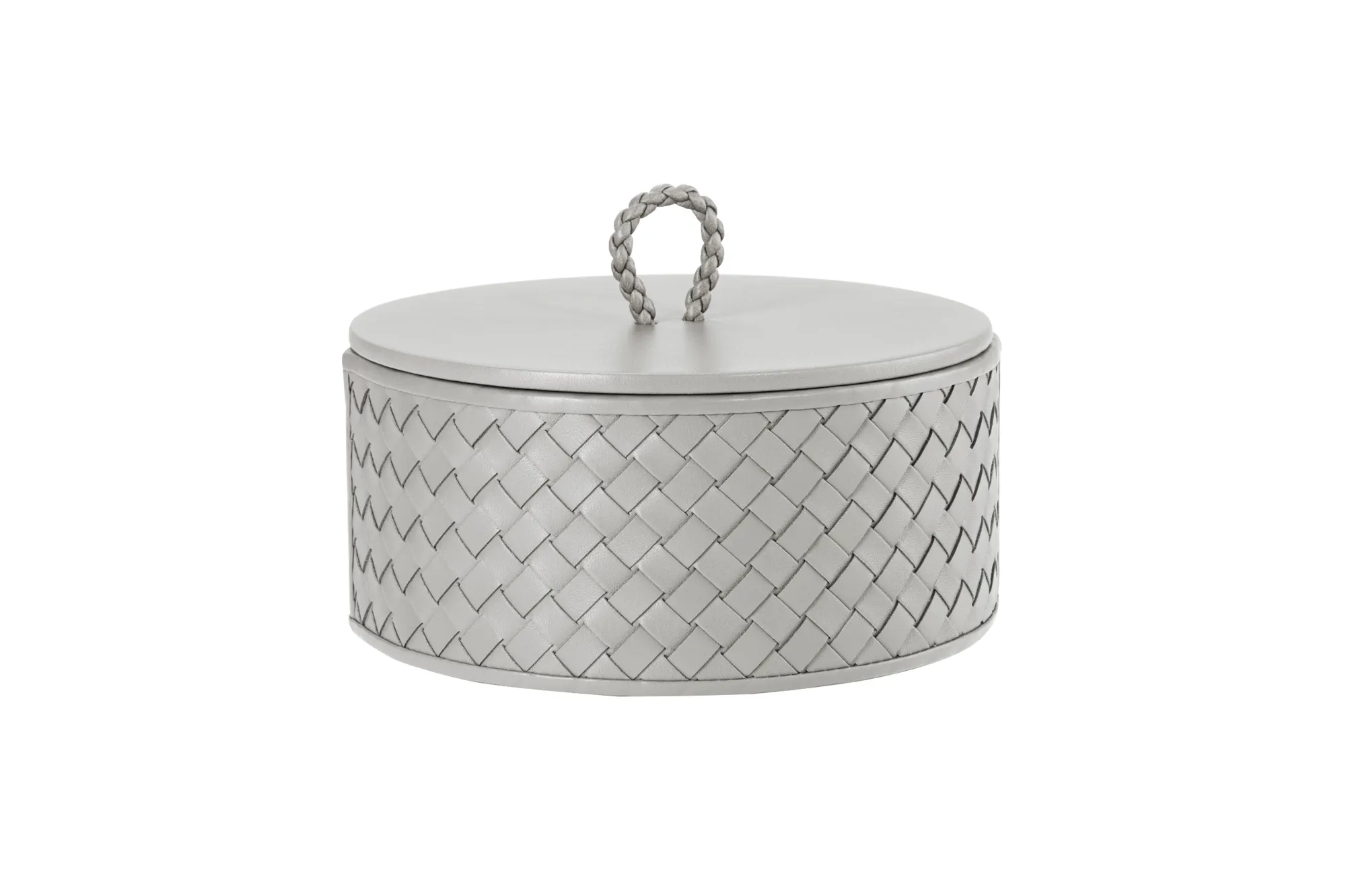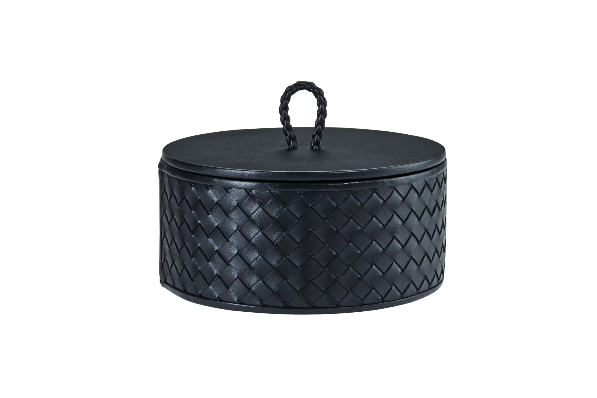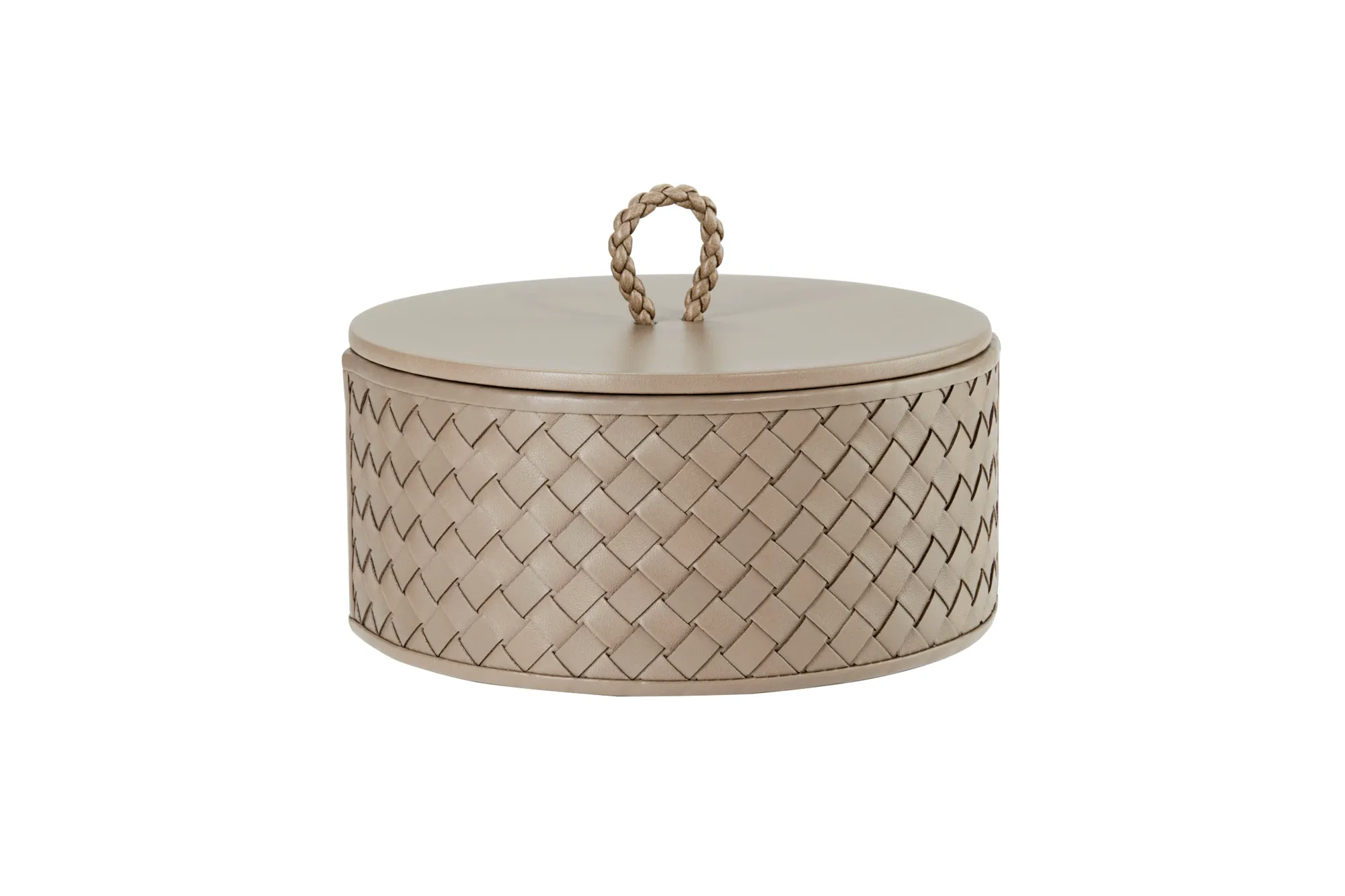 Round leather box with lid, handwoven finish.