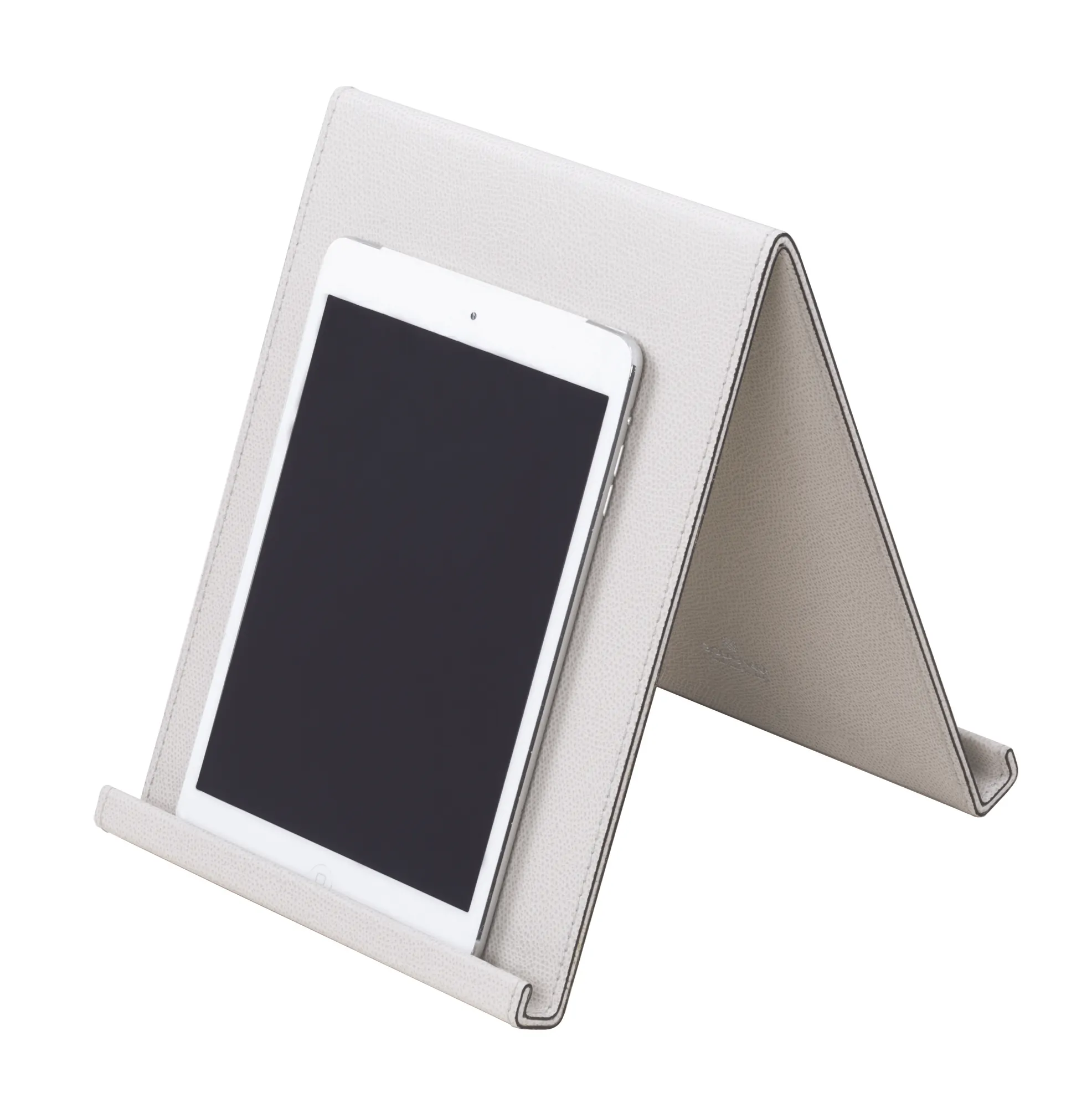 All-leather structure. Leather covered metal structure. Can host 2 tablets or sheets on both sides.