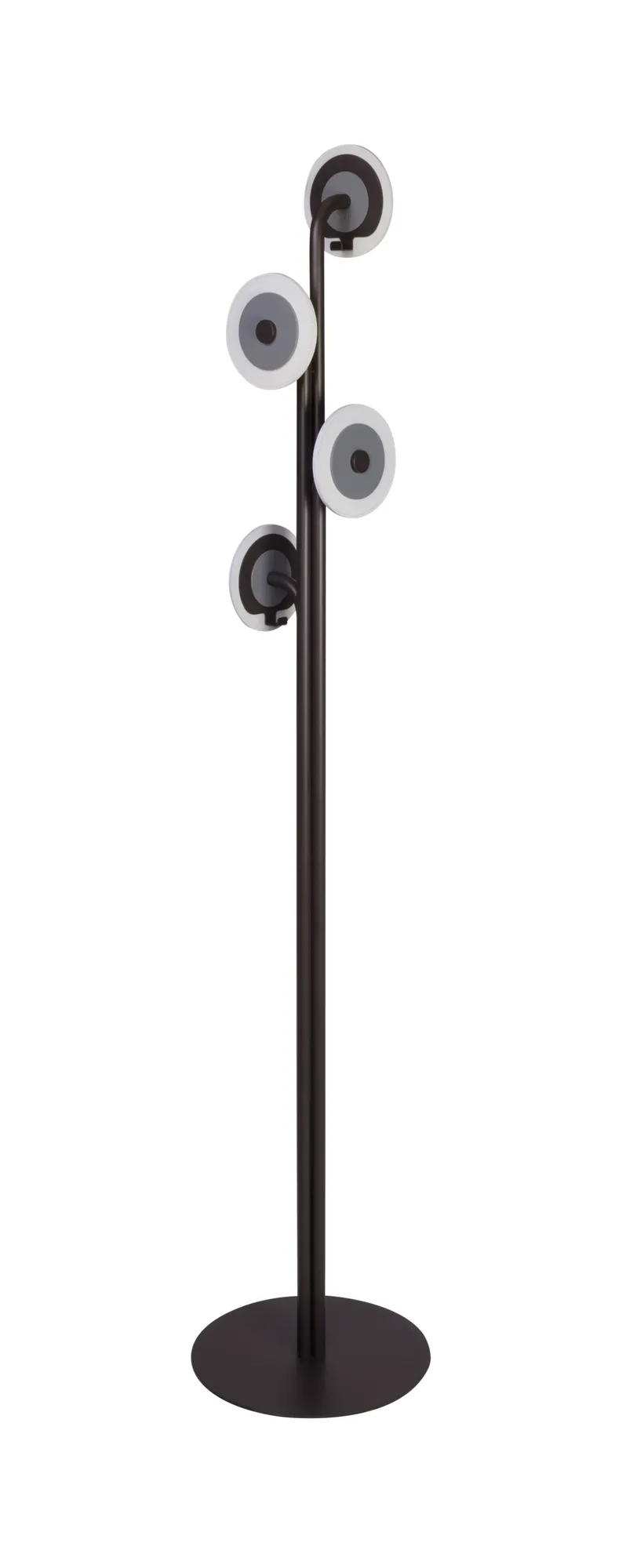 Four flowers made of overlayed Tecnocuoio discs seem to blossom from the coated metal structure that rises from the ground. The discs width grants the hanged clothes a suitable support without losing their shape. It is possible to choose any color combination from our chart for the clothes valet's bicolor version.