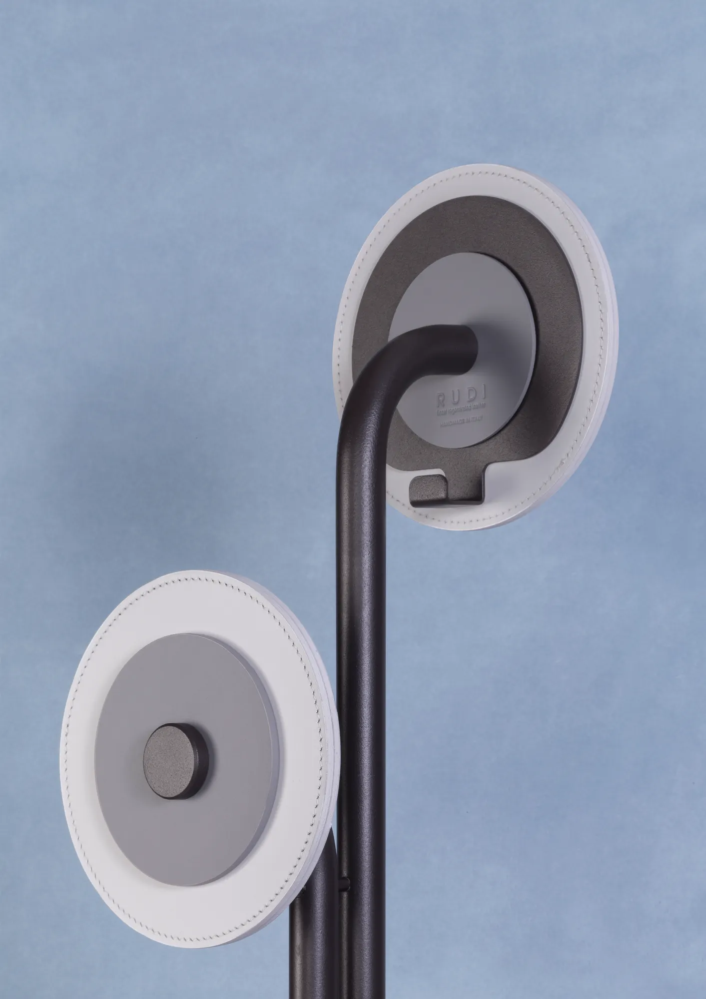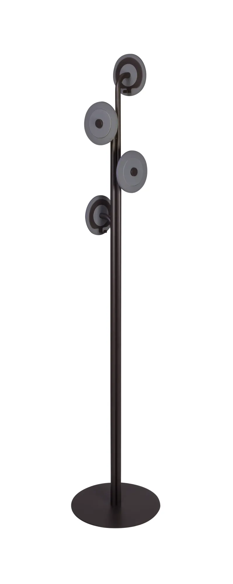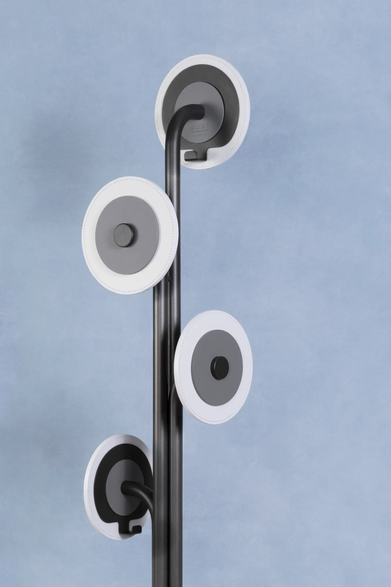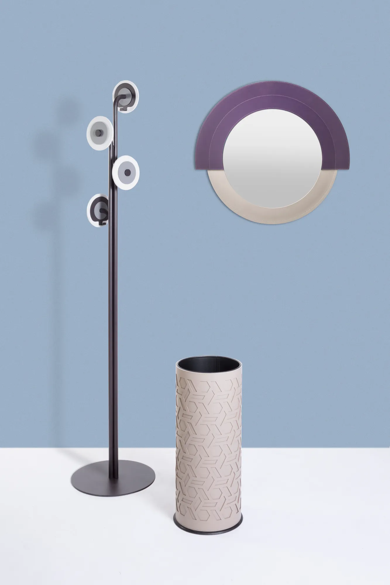 Four flowers made of overlayed Tecnocuoio discs seem to blossom from the coated metal structure that rises from the ground. The discs width grants the hanged clothes a suitable support without losing their shape. It is possible to choose any color combination from our chart for the clothes valet's bicolor version.