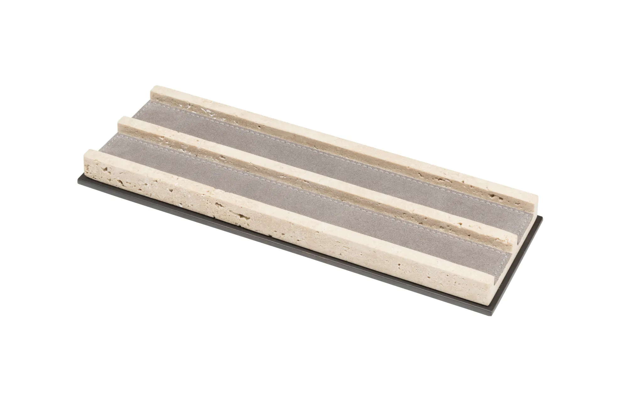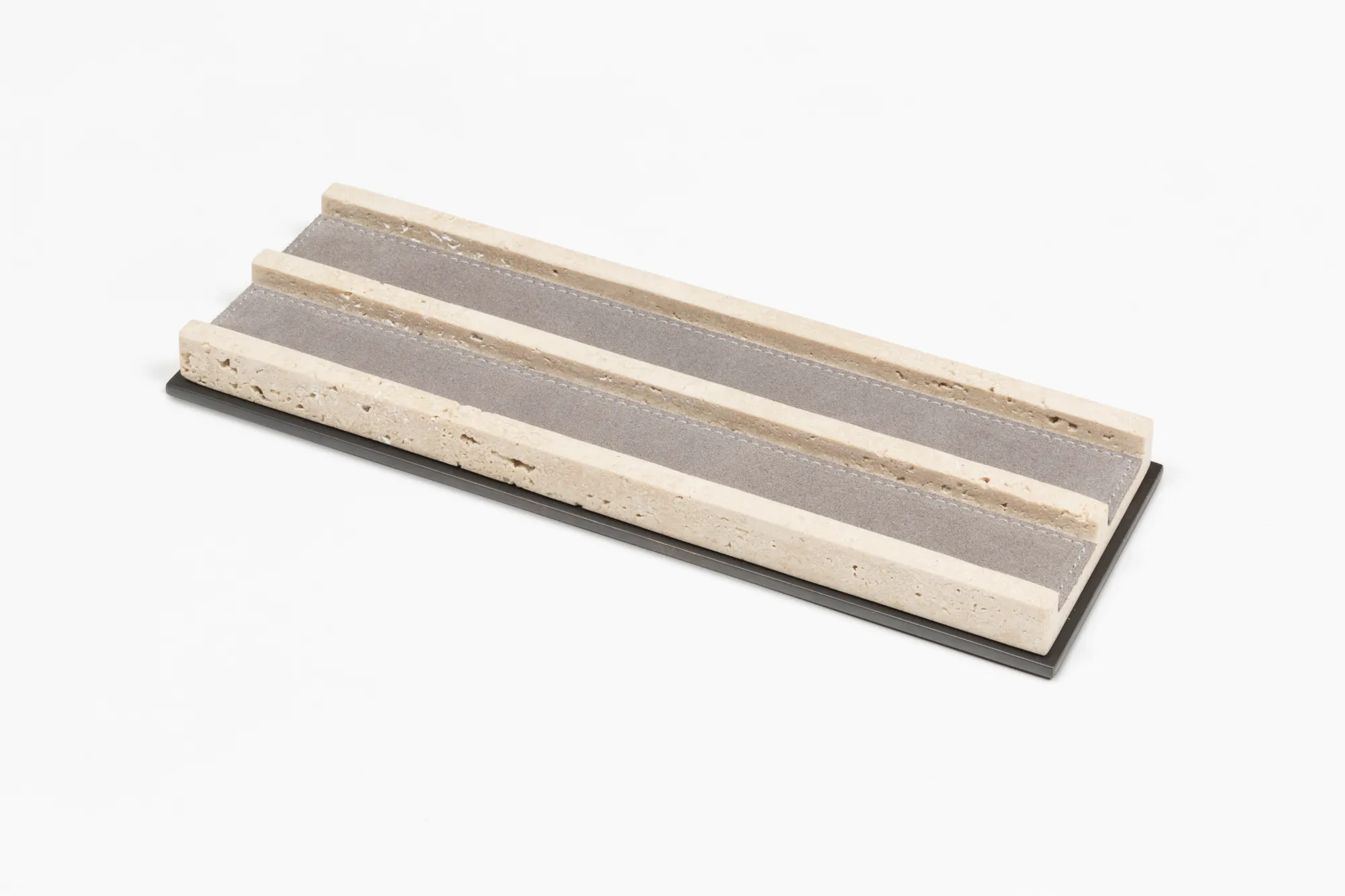 Travertine structure with leather inserts and brass base frame available in different finishes. Non-slip waterproof rubber base underneath.