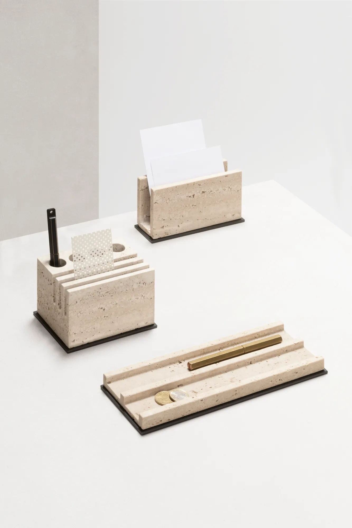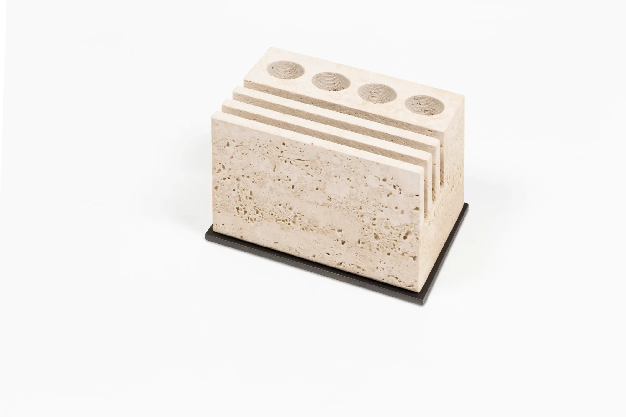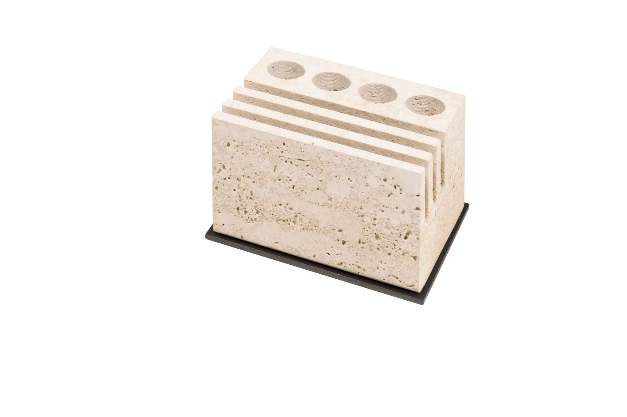 Travertine structure with brass base frame available in different finishes. Non-slip waterproof rubber base underneath.