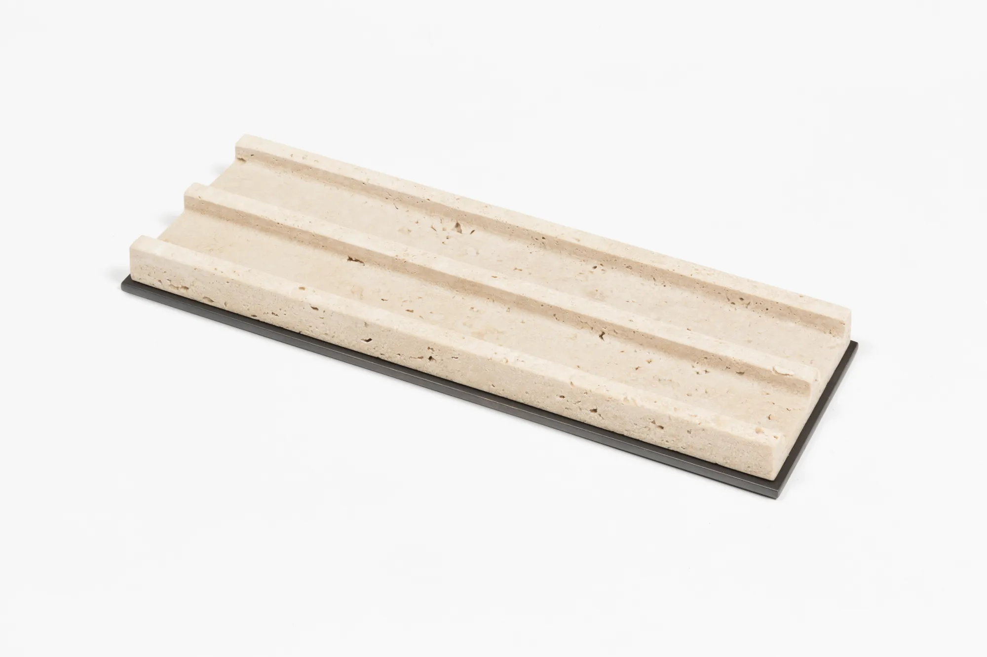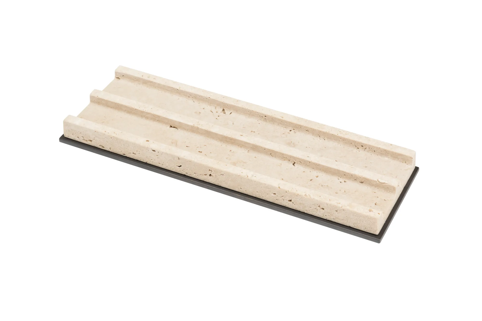 Travertine structure with brass base frame available in different finishes. Non-slip waterproof rubber base underneath.