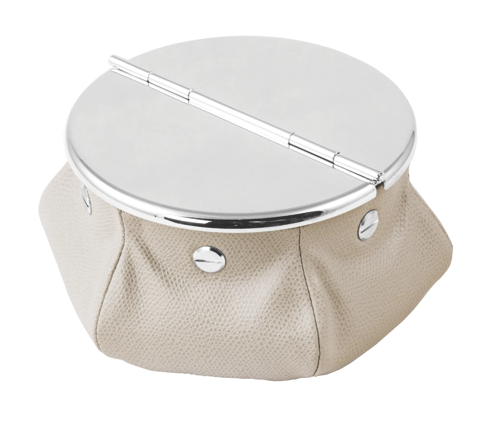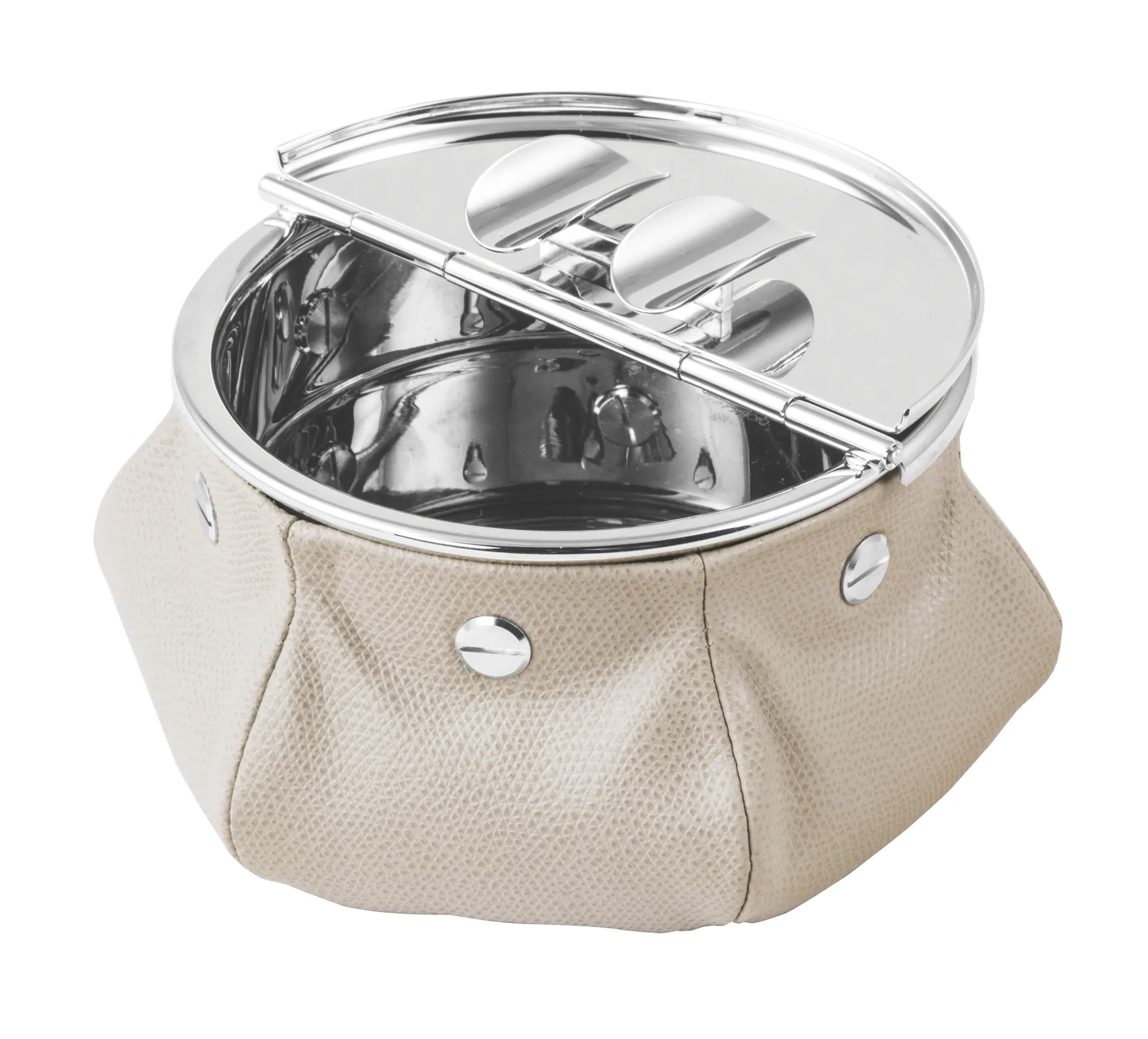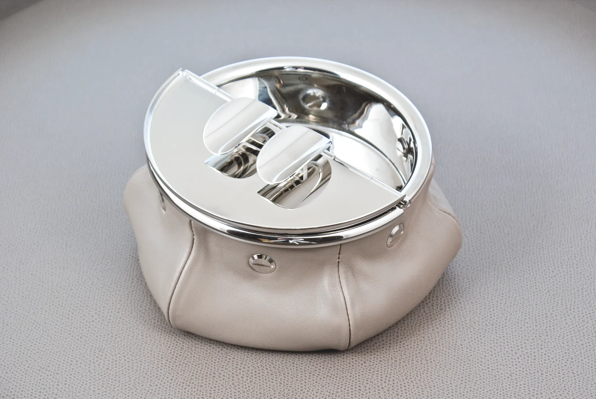 Windproof brass ashtray with palladium finishing, fixed on a leather bag filled with 1 kg metal micro spheres that give high stability. Perfect for jets and yachts. Total weight 1.2 kg.