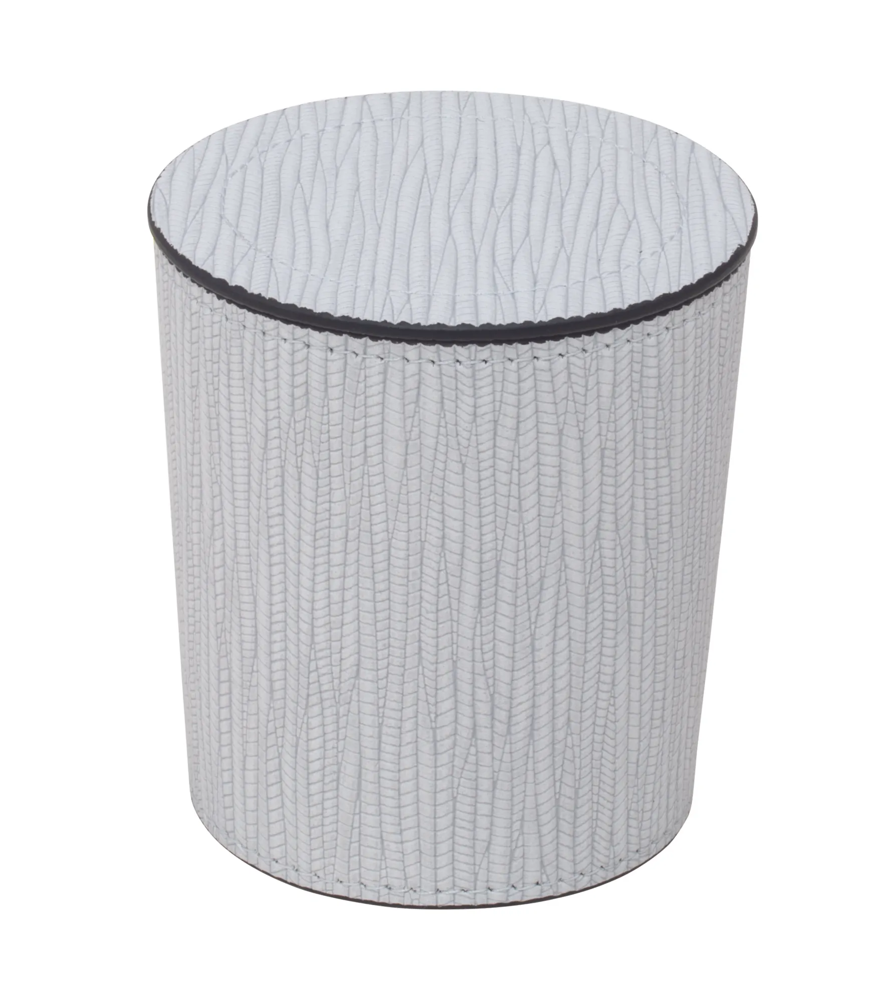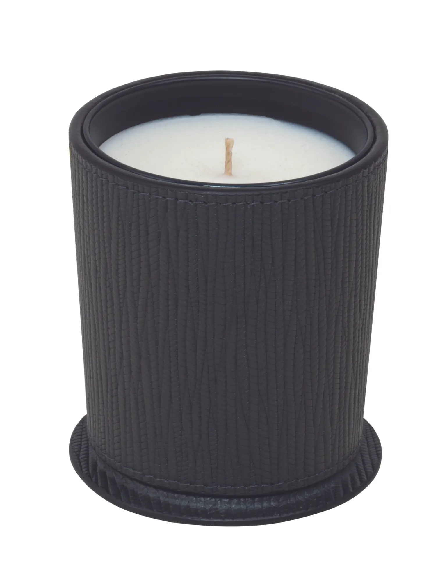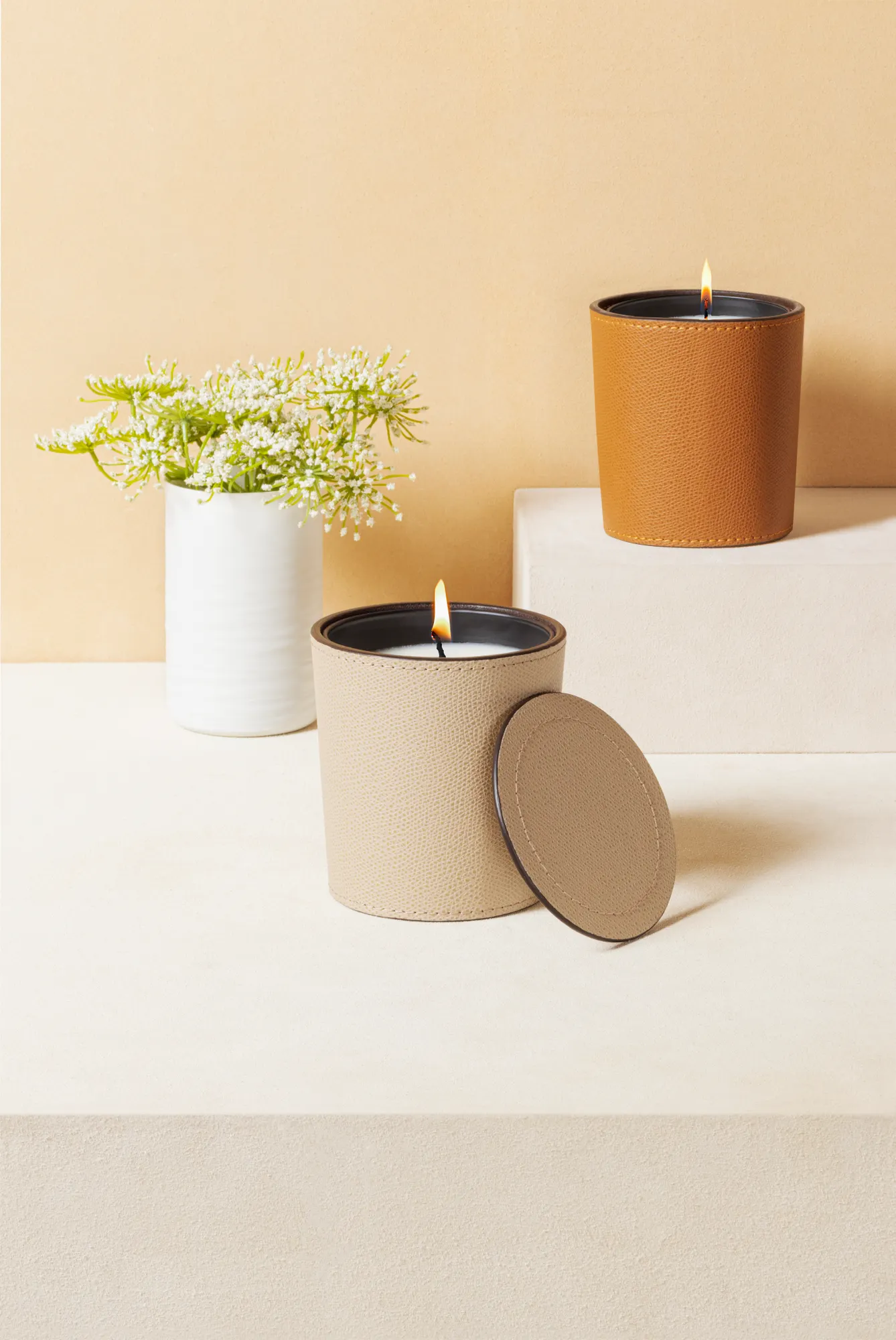 All-leather candle holder with cover usable as a base when the candle's lit. 300g vegetal and mineral wax candle in personalized blue glass. High quality fresh aroma.