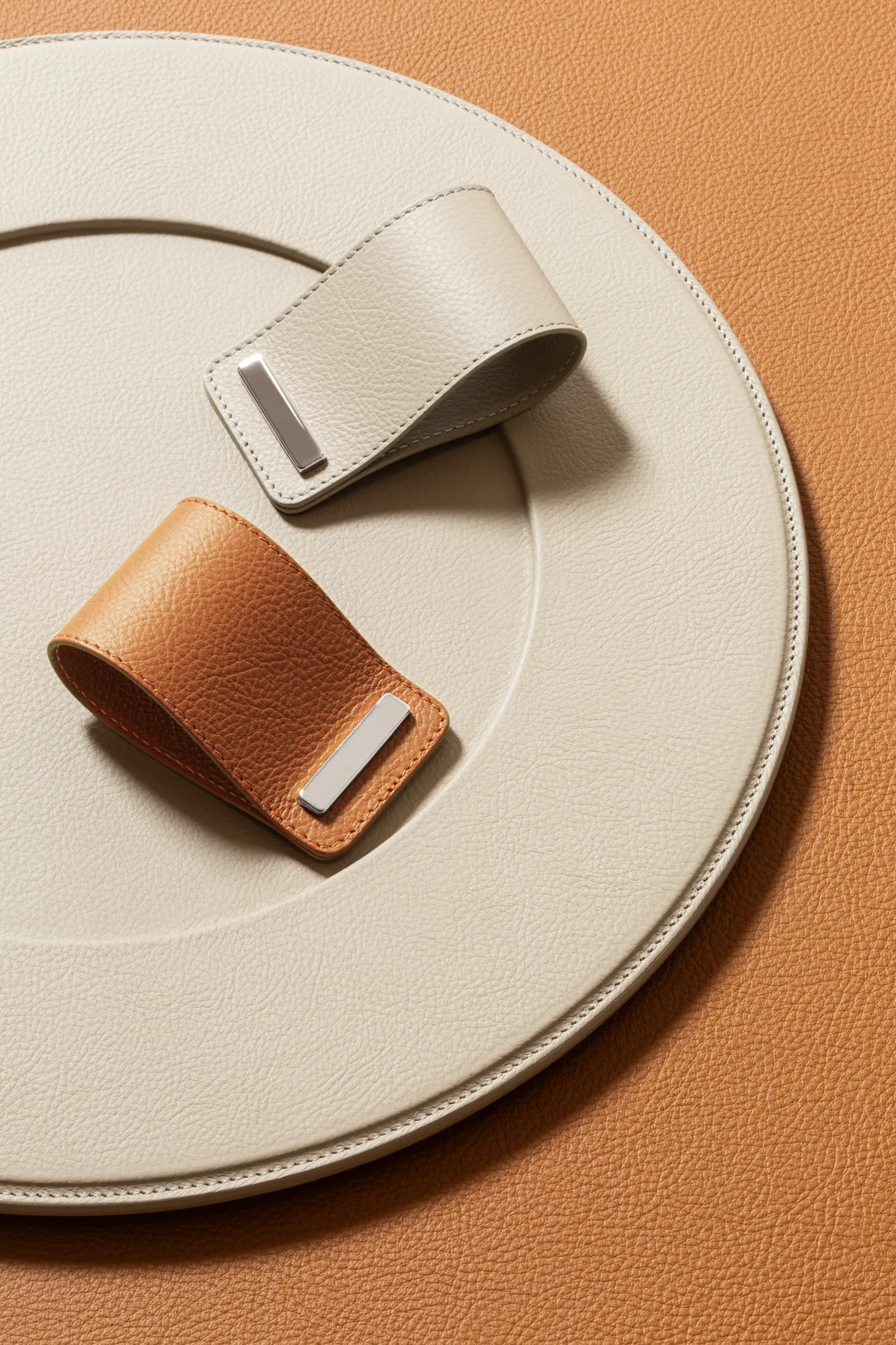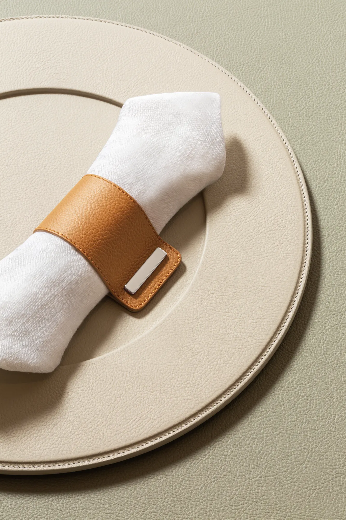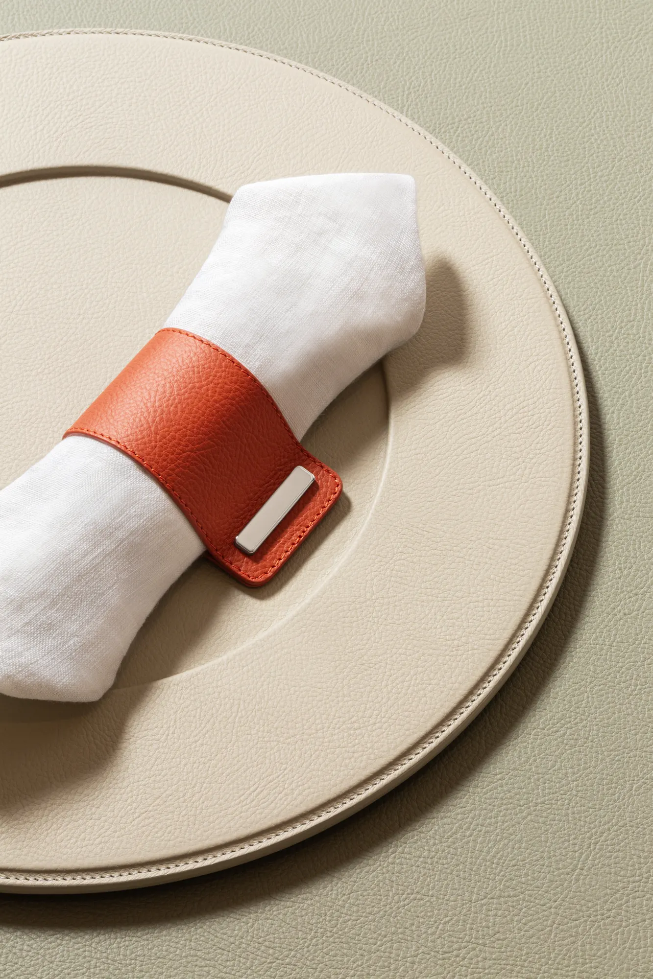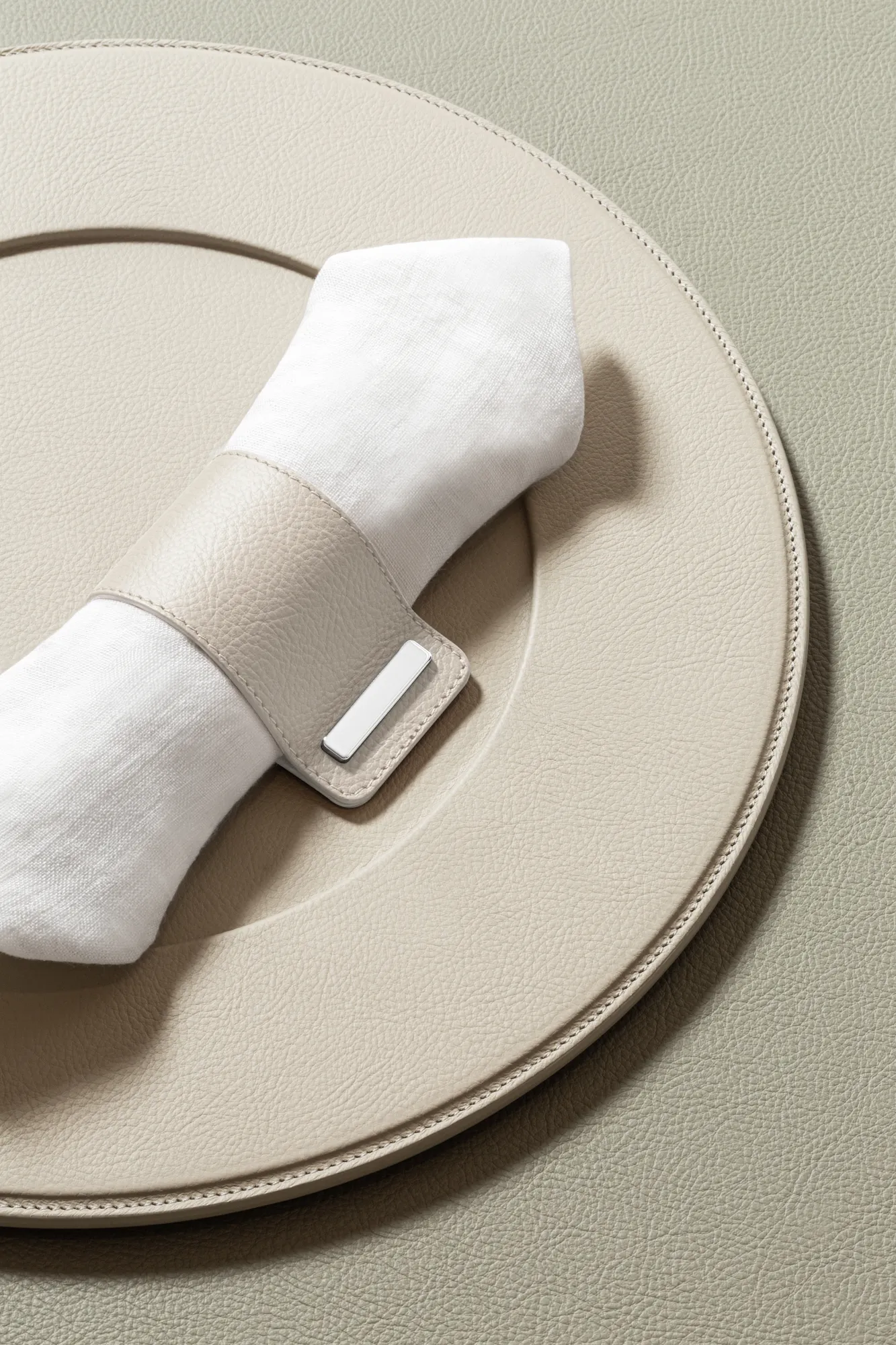 Featuring an all-leather structure with polished chrome closing, this napkin ring adds a subtle yet striking element to any table decor, elevating even the simplest of settings. Entirely made in Pelle Frau®.