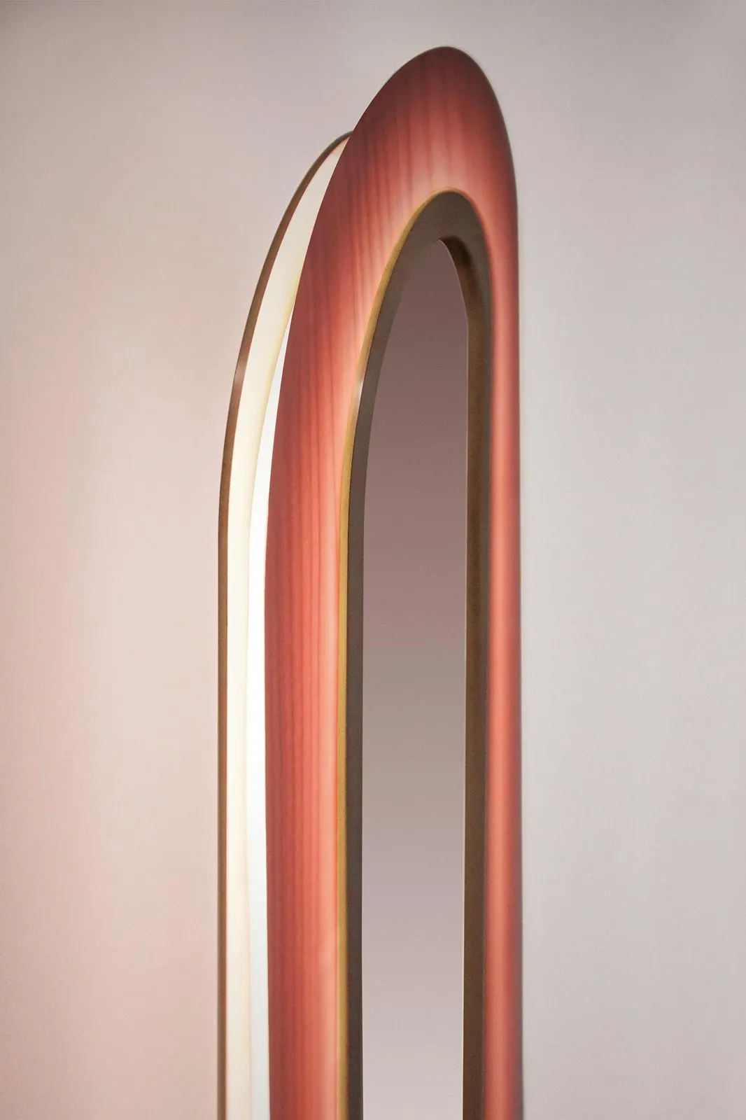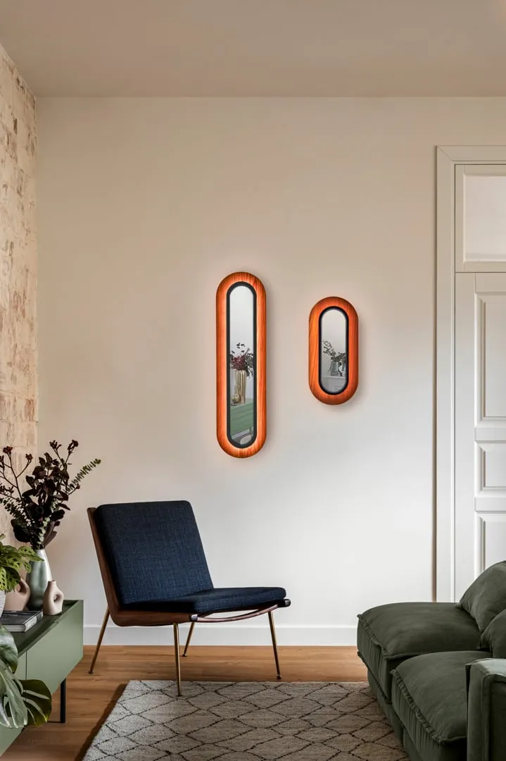 LENS OVAL THE SMOOTH LIGHT. Designed by MUT, Lens is a family of circular and oval lamps whose wood veneer shades diffuse light, while framing an aperture or mirror. With Lens, MUT crafted an original lamp that is both balanced and effortless, with a fluent design. The Lens Oval Wall incorporates a central mirror that reflects the lamp’s surroundings. Placed vertically or horizontally, this lamp is an elegant addition to any room. The Lens Oval Wall is available in the following wood veneers: Natural Cherry, Ivory White, Natural Beech, Yellow, Orange, Red, Blue, Grey, Pale Rose, and Sea Blue. The metal finishes are Black, Matt Ivory or Gold