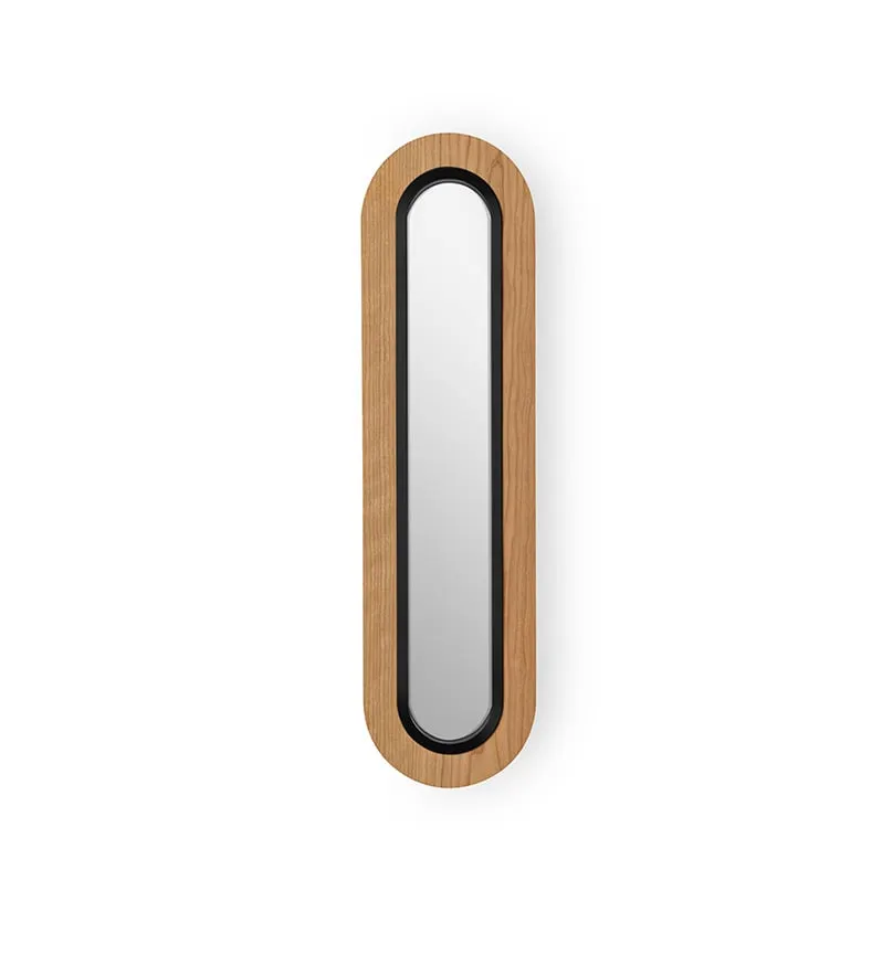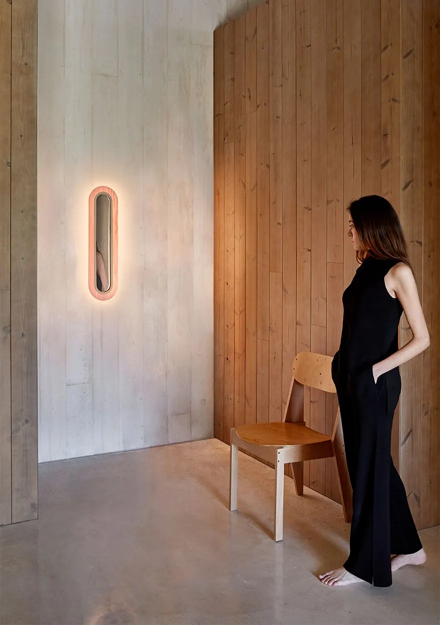 LENS SUPEROVAL THE SMOOTH LIGHT. Designed by MUT, Lens is a family of circular and oval lamps whose wood veneer shades diffuse light, while framing an aperture or mirror. With Lens, MUT crafted an original lamp that is both balanced and effortless, with a fluent design. The Lens Super Oval Wall’s elongated oval shade and mirror make a smart looking glass and an elegant addition to any room. The Lens Super Oval Wall is available in the following wood veneers: Natural Cherry, Ivory White, Natural Beech, Yellow, Orange, Red, Blue, Grey, Pale Rose, and Sea Blue. The metal finishes are Black, Matt Ivory or Gold