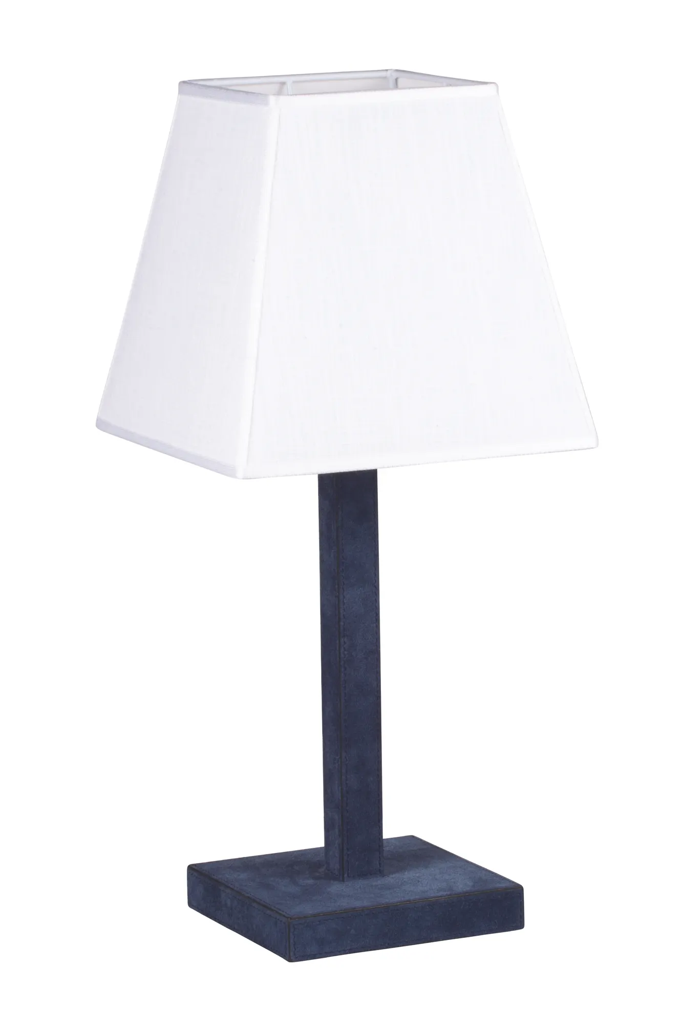 Leather covered wood structure and metal base. White linen lampshade with fireproof diffuser.
