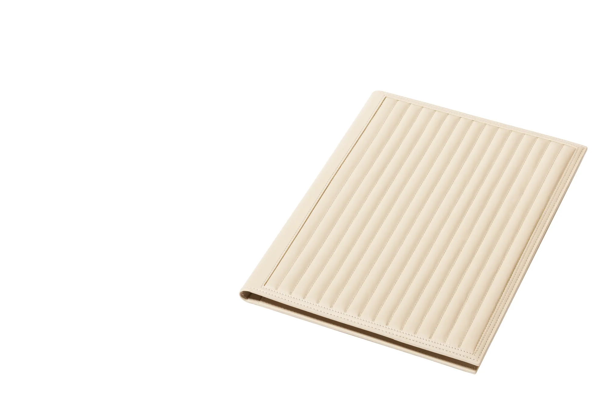 Leather notepad holder featuring a padded quilted lines pattern. Side pencil holder with pen. Includes a notepad made of 70 ivory paper sheets.