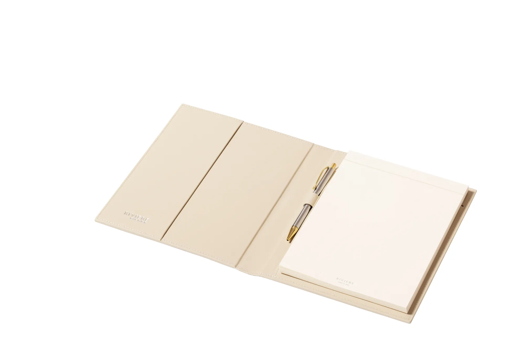 Leather notepad holder featuring a padded quilted lines pattern. Side pencil holder with pen. Includes a notepad made of 70 ivory paper sheets.