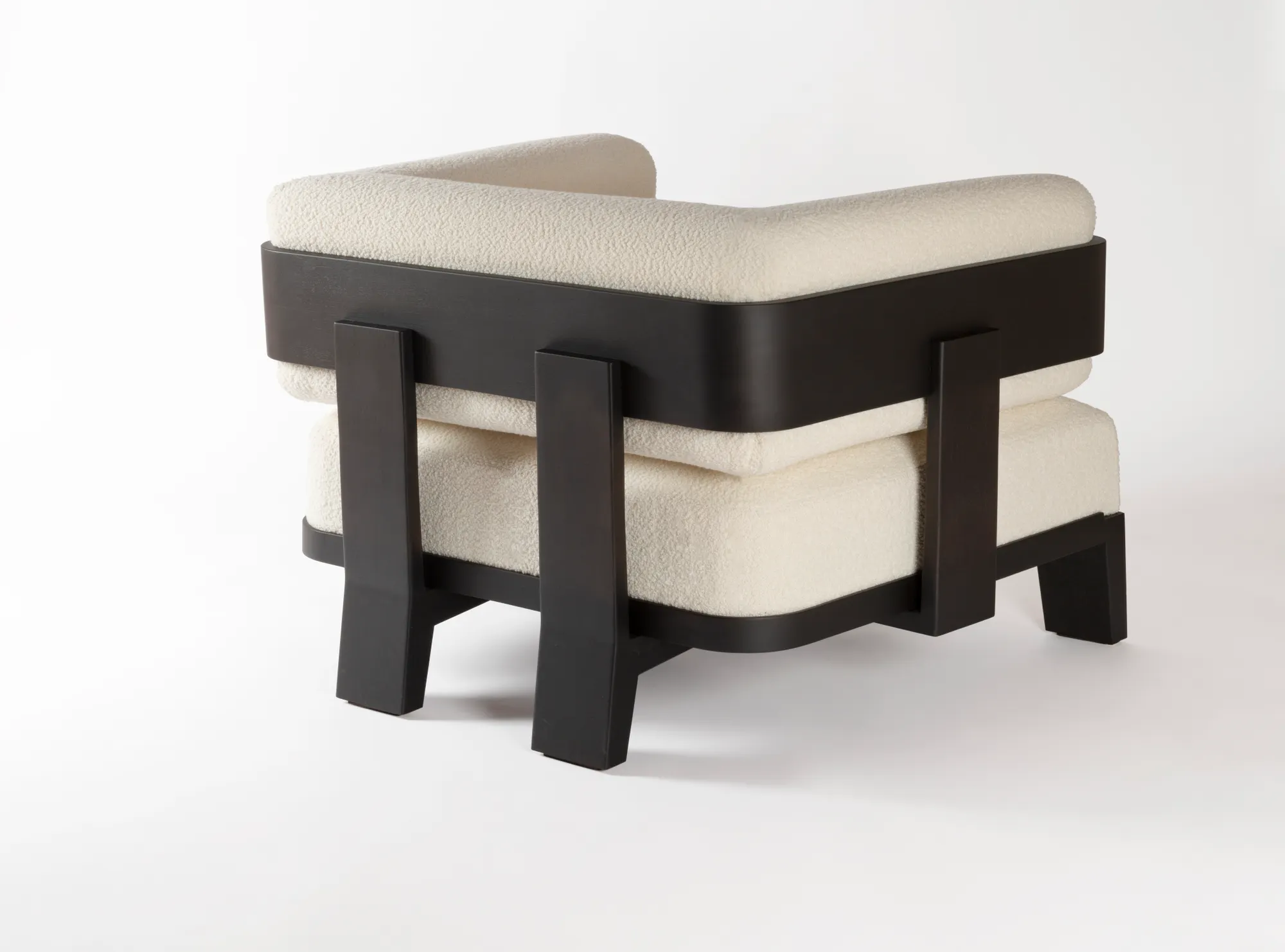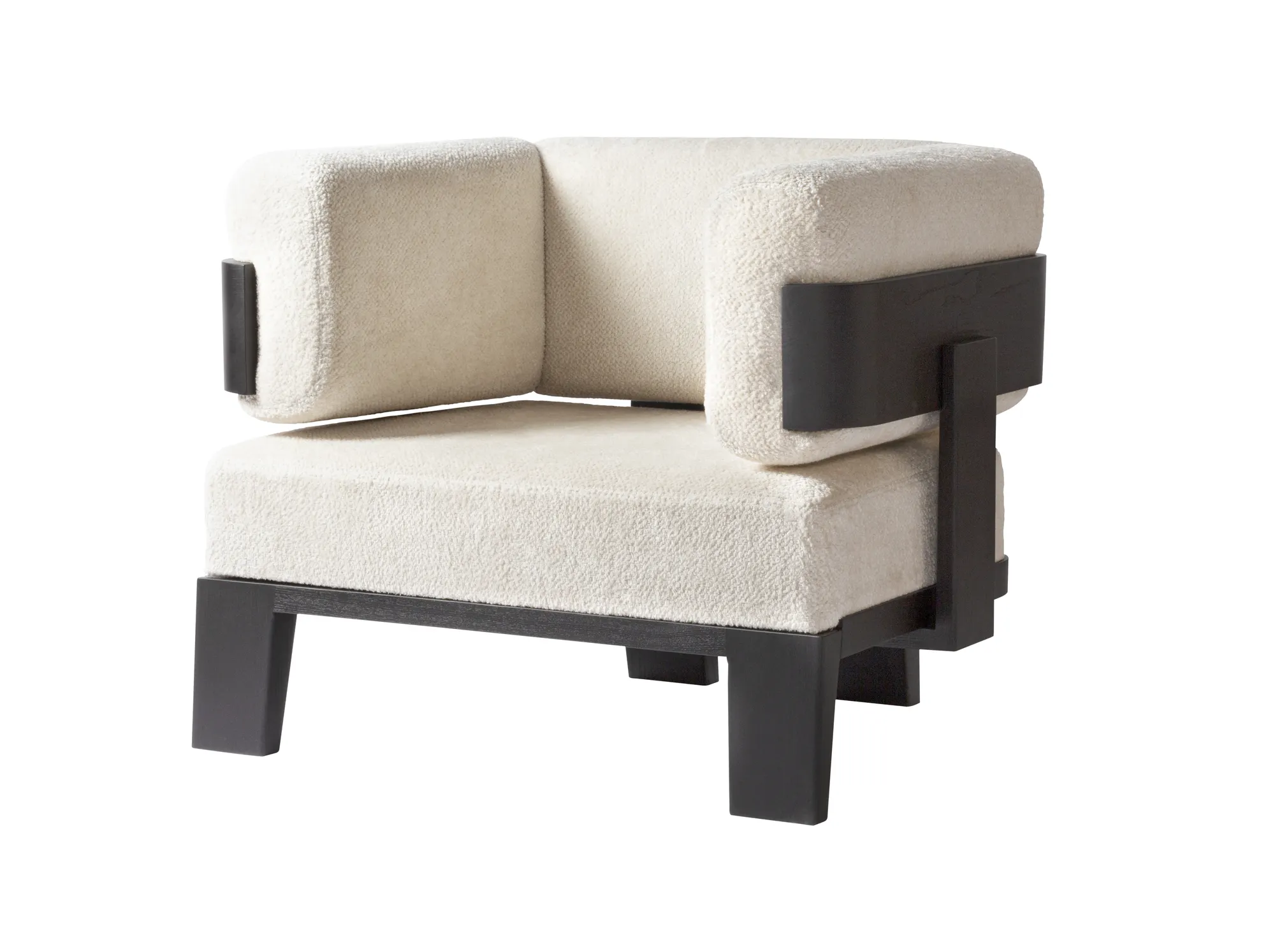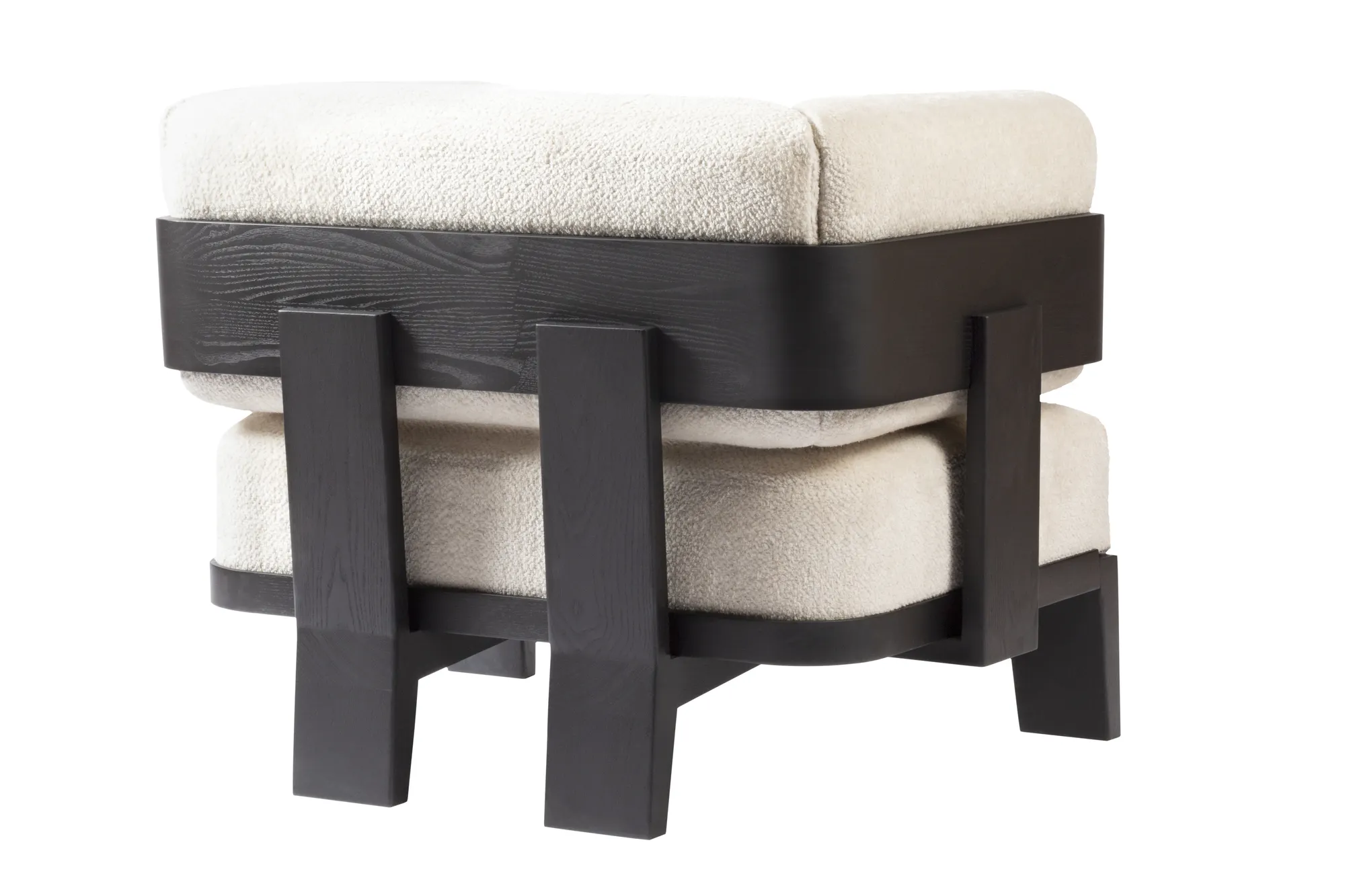 Llana is a collection that brings together massive volumes boasting a striking presence and an enveloping design able to generate warm atmospheres. Featuring clean lines and elegantly studied details, shapes naturally blend together to create unique, iconic pieces, while the rigidity of wood meets the soft comfort of the upholstered cushions, boasting eye-pleasing contrasts of materials which are Glenn Sestig's signature touch. Materials: upholstered cushions dressed with custom fabric, base in Canaletto walnut wood. Choose between two available wood finishes. Custom sizes available on request.