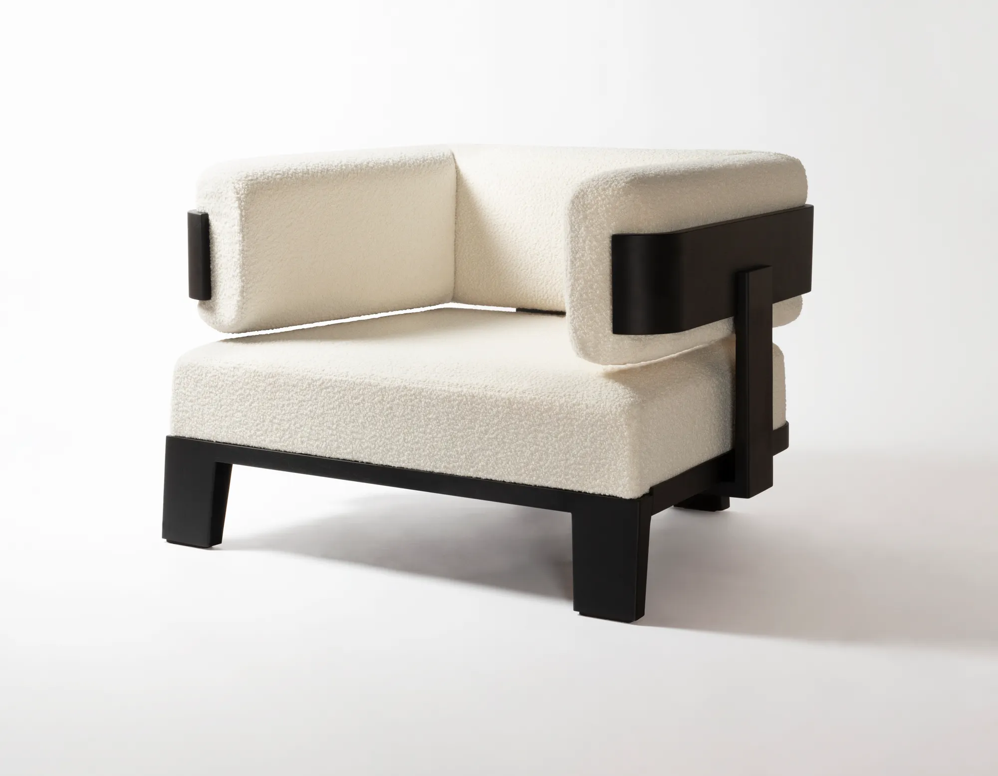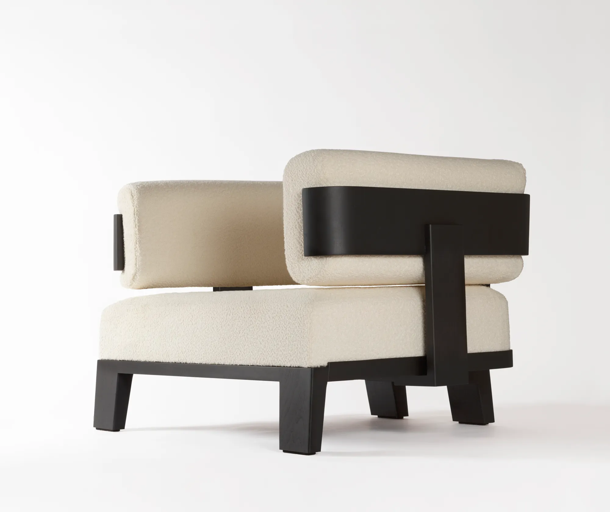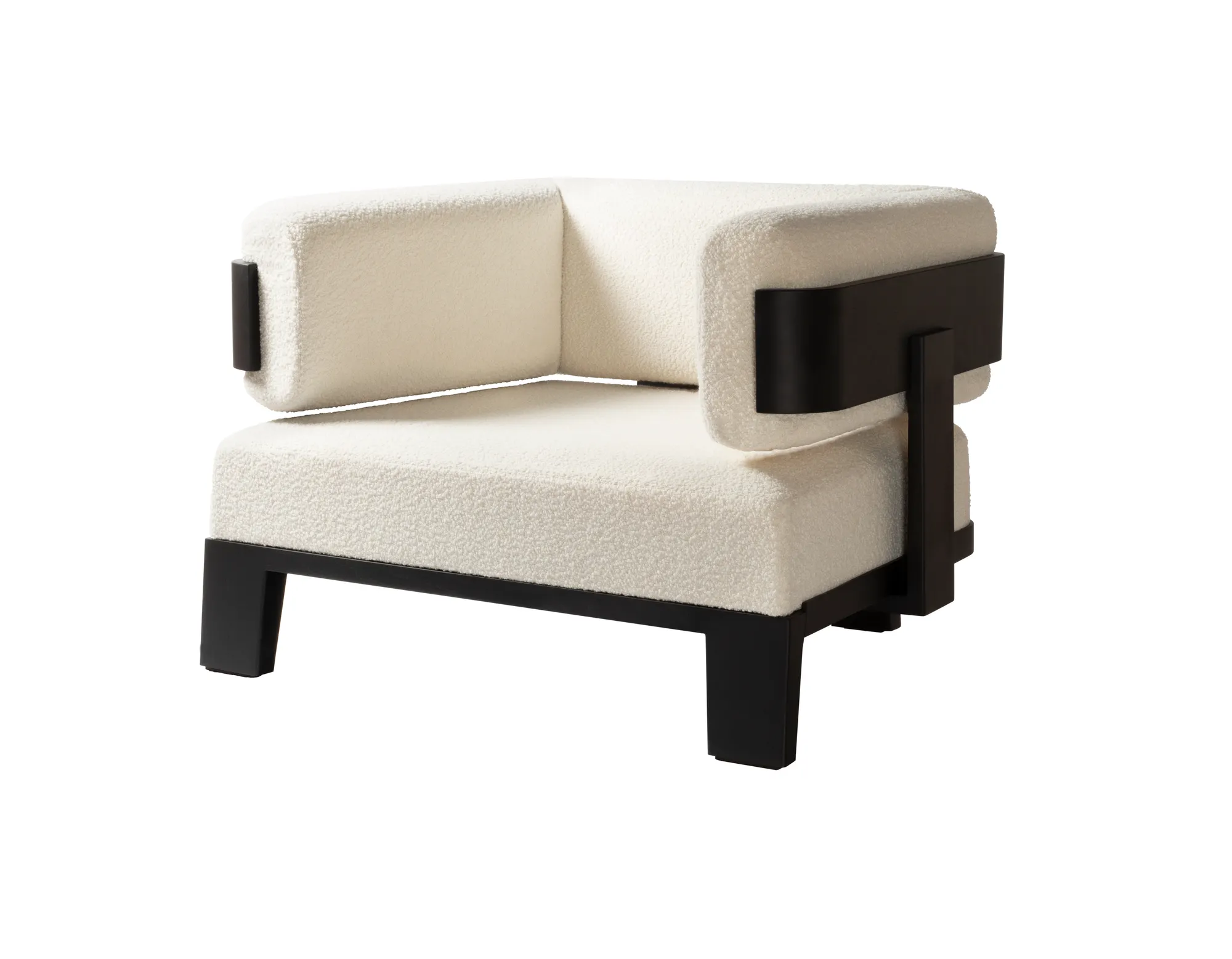 Llana is a collection that brings together massive volumes boasting a striking presence and an enveloping design able to generate warm atmospheres. Featuring clean lines and elegantly studied details, shapes naturally blend together to create unique, iconic pieces, while the rigidity of wood meets the soft comfort of the upholstered cushions, boasting eye-pleasing contrasts of materials which are Glenn Sestig's signature touch. Materials: upholstered cushions dressed with custom fabric, base in Canaletto walnut wood. Choose between two available wood finishes. Custom sizes available on request.