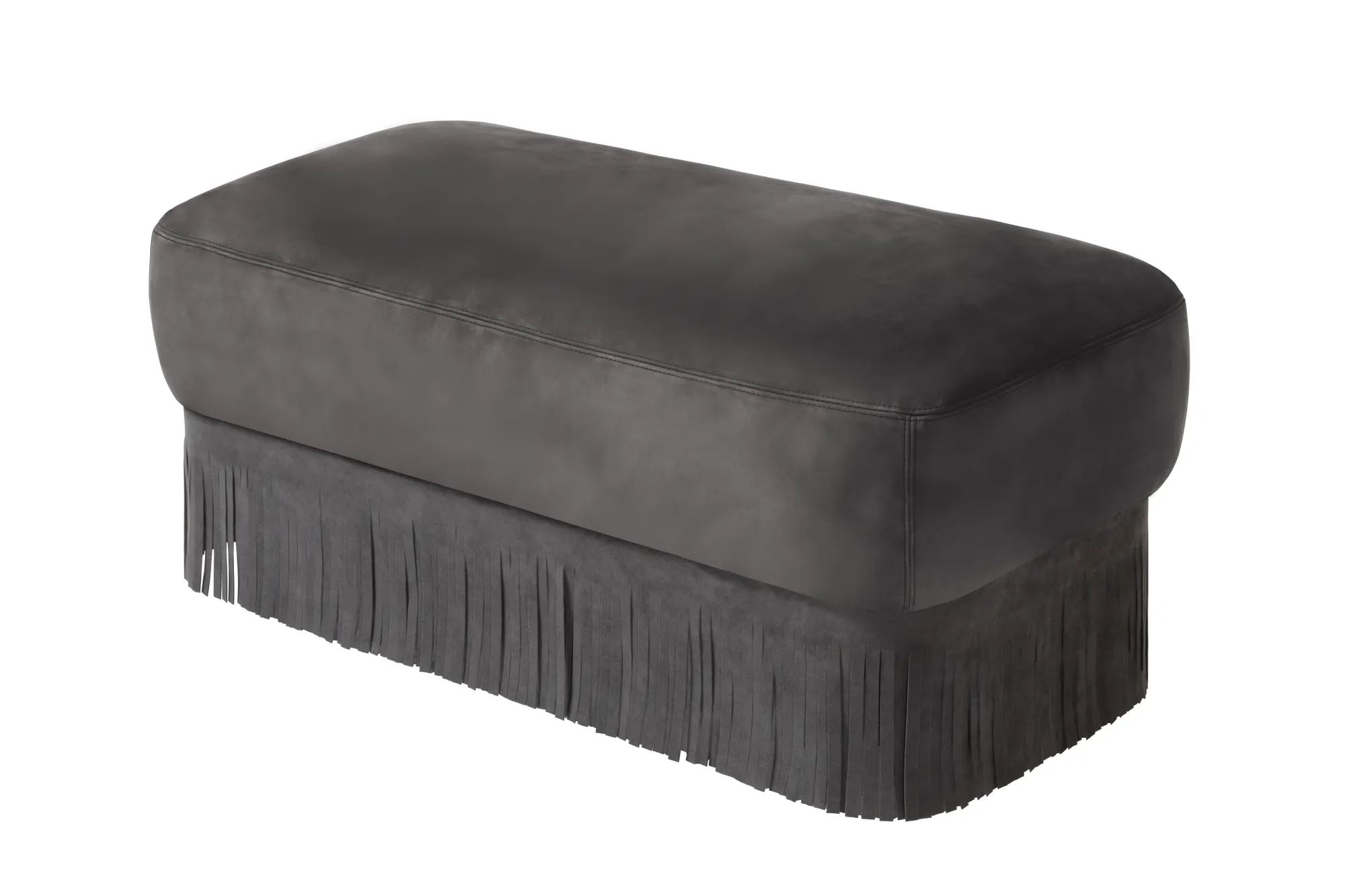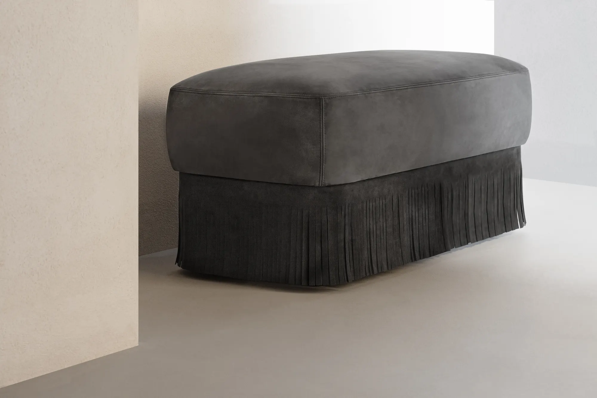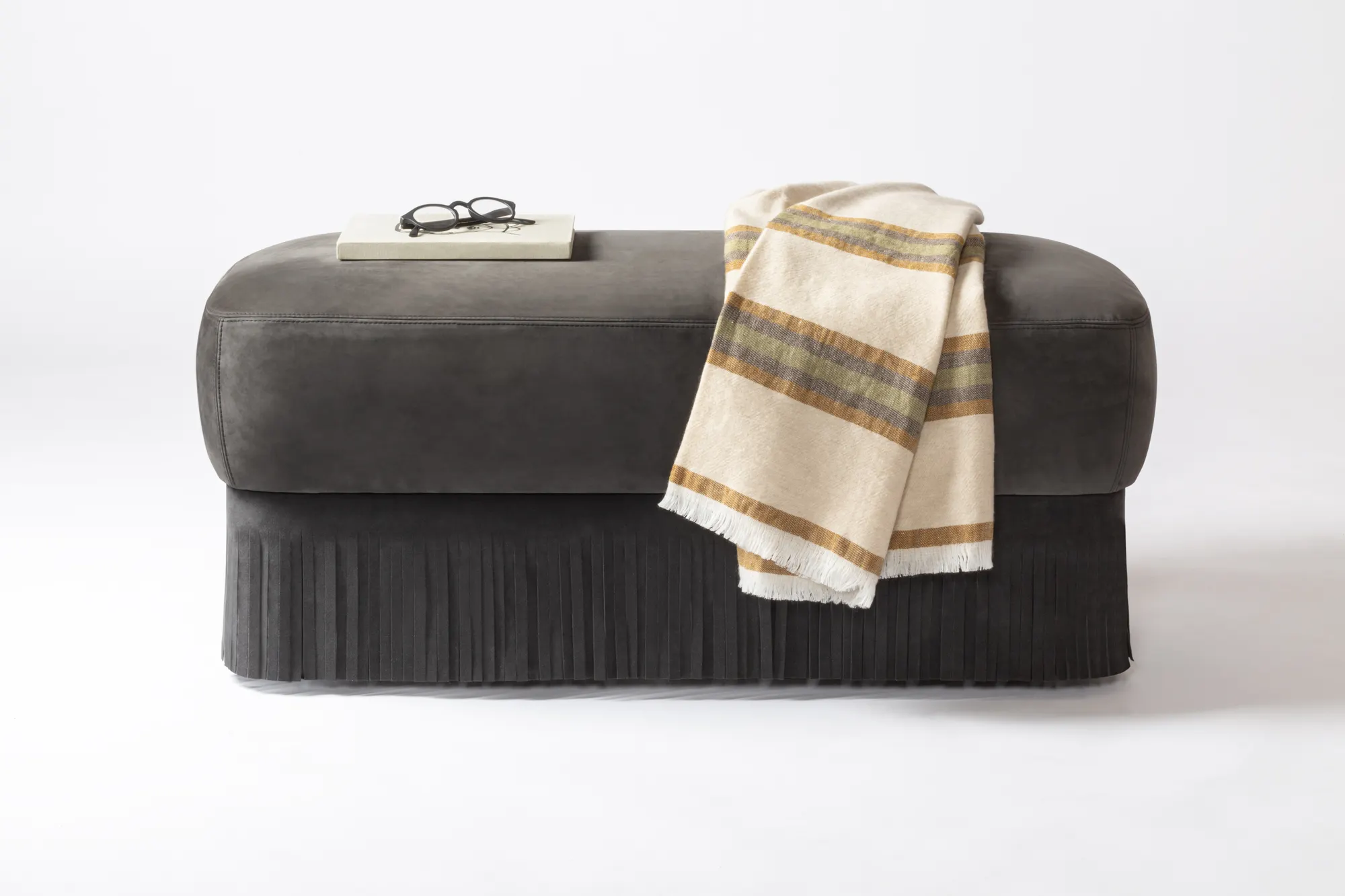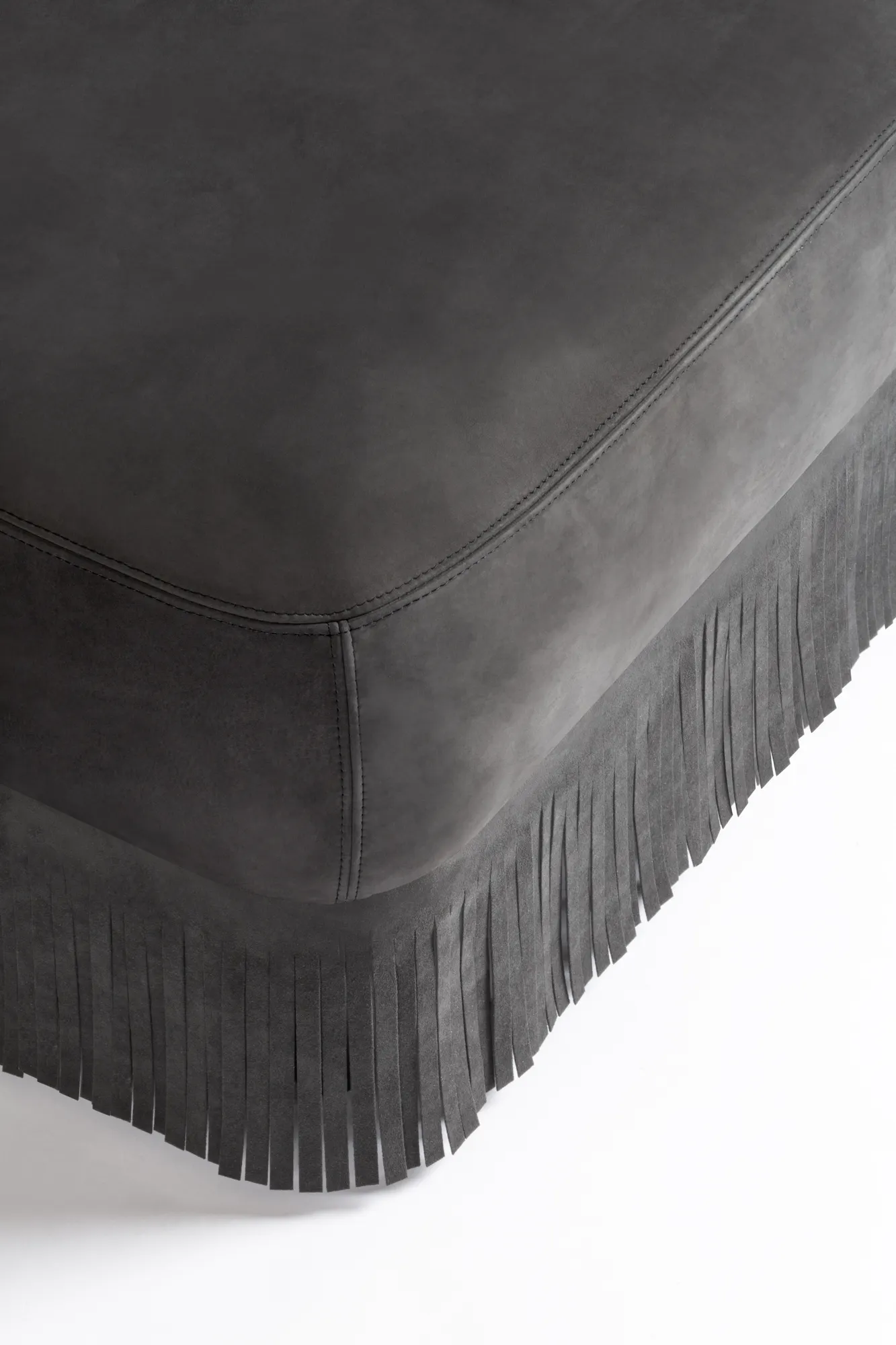 Materials: upholstered leather cushions and fringes. Custom sizes and fabric available on request.