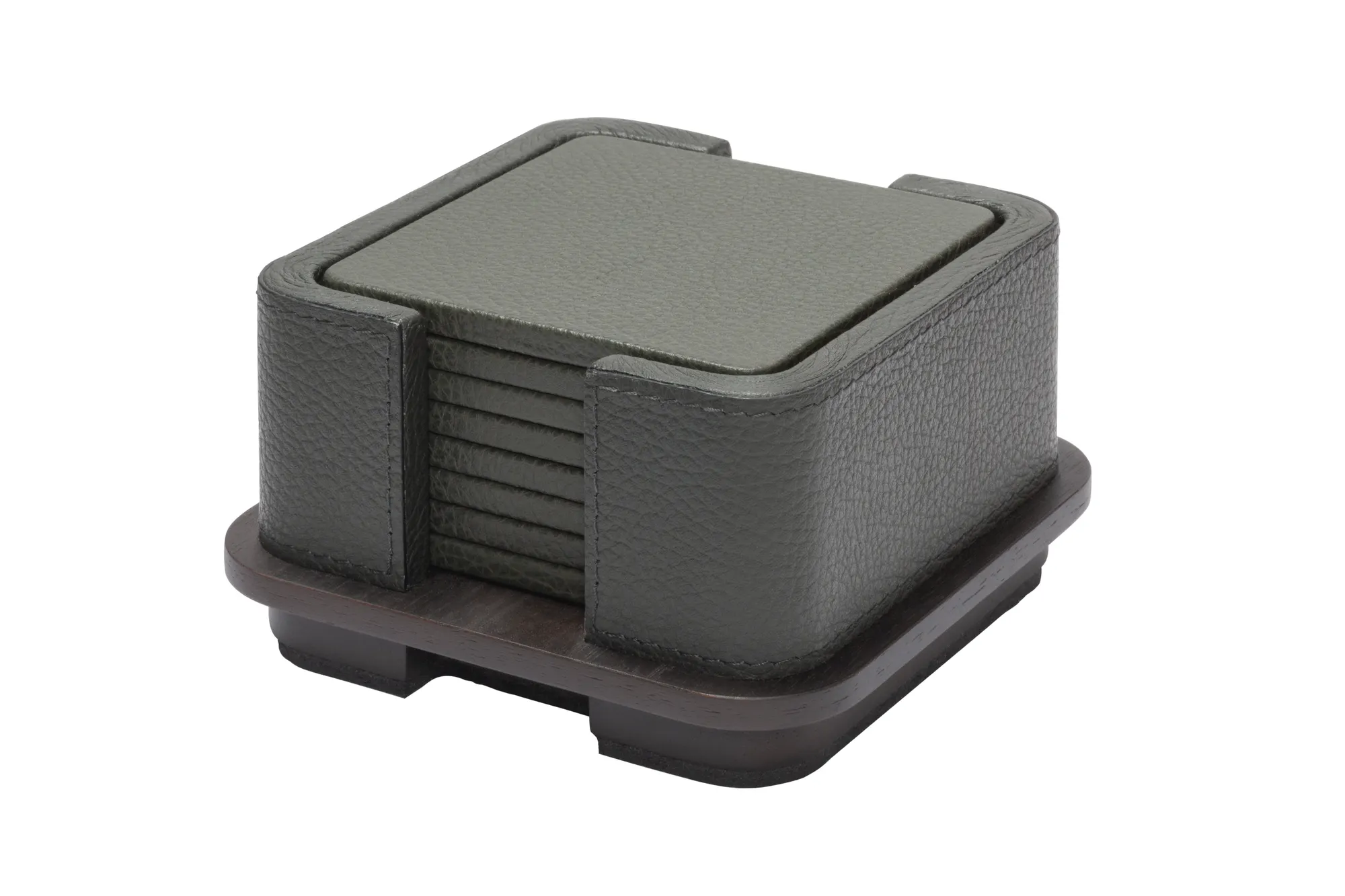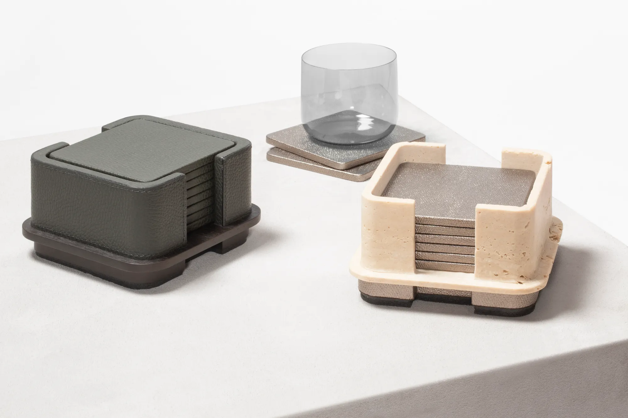 Materials: leather and wood (the wood finish can be either dark-stained Canaletto walnut or wenge) or leather and travertine. Custom sizes available on request.