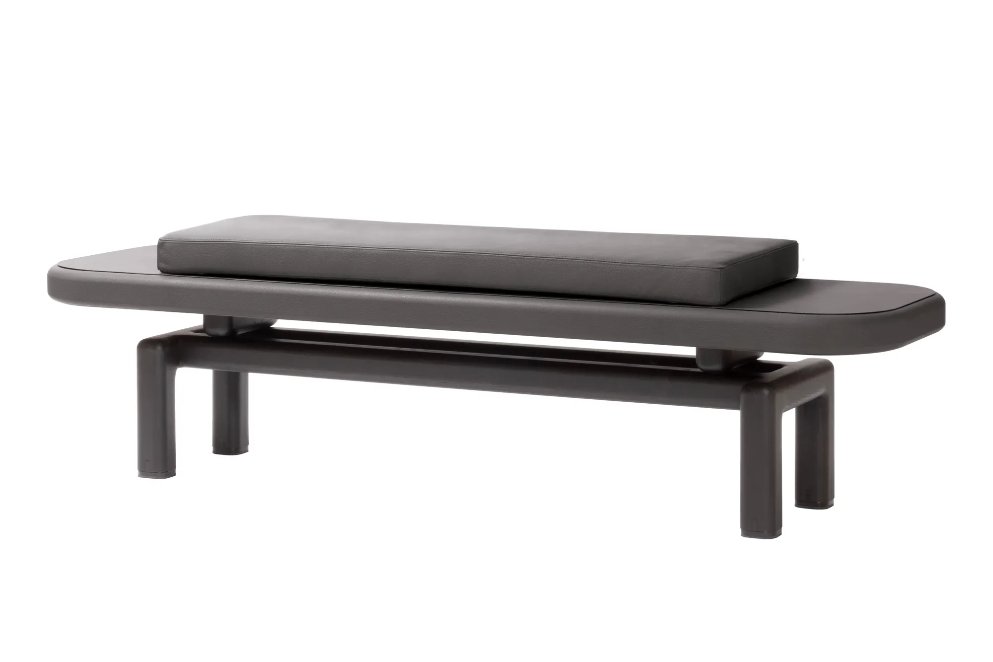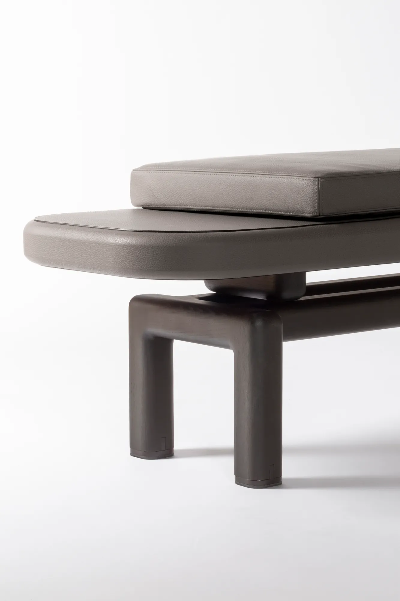Materials: leather and dark-stained Canaletto walnut wood. Provided with upholstered top leather cushion and inox or brushed bronze decorative feet. Custom sizes available on request.