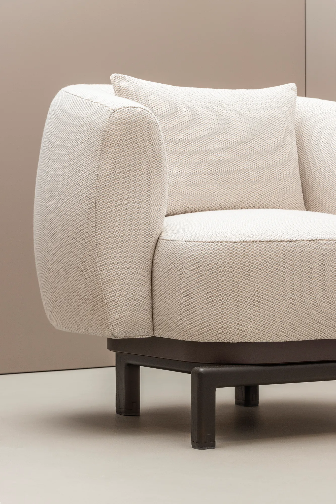 Materials: top in cashmere and wool or shearling, base in dark-stained Canaletto walnut wood. Provided with inox or brushed bronze decorative feet. Custom sizes and fabric available on request.