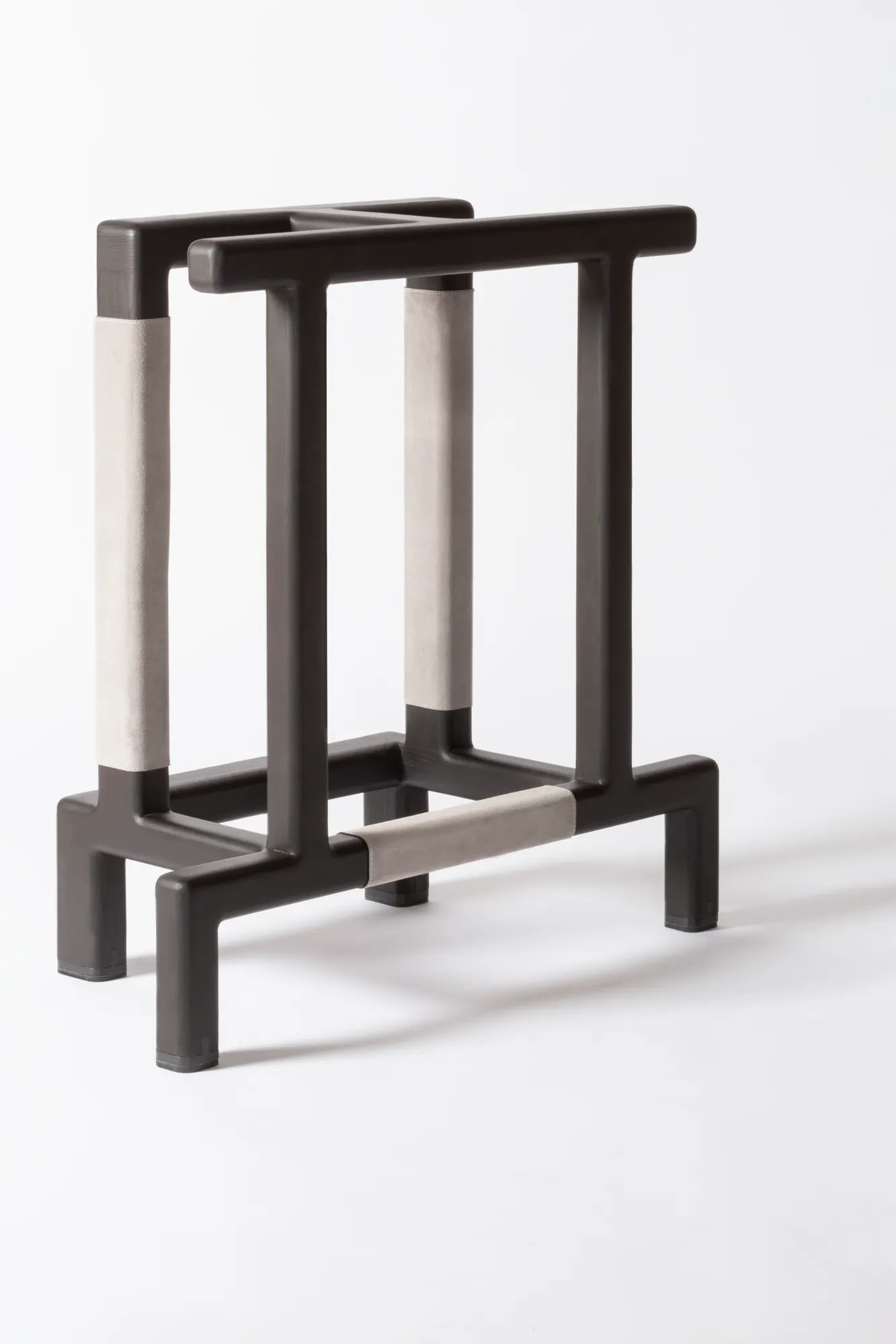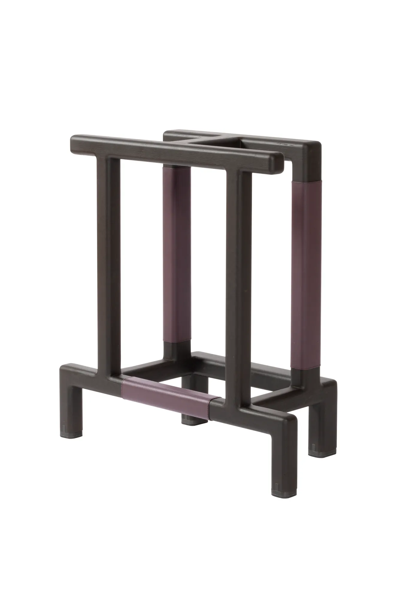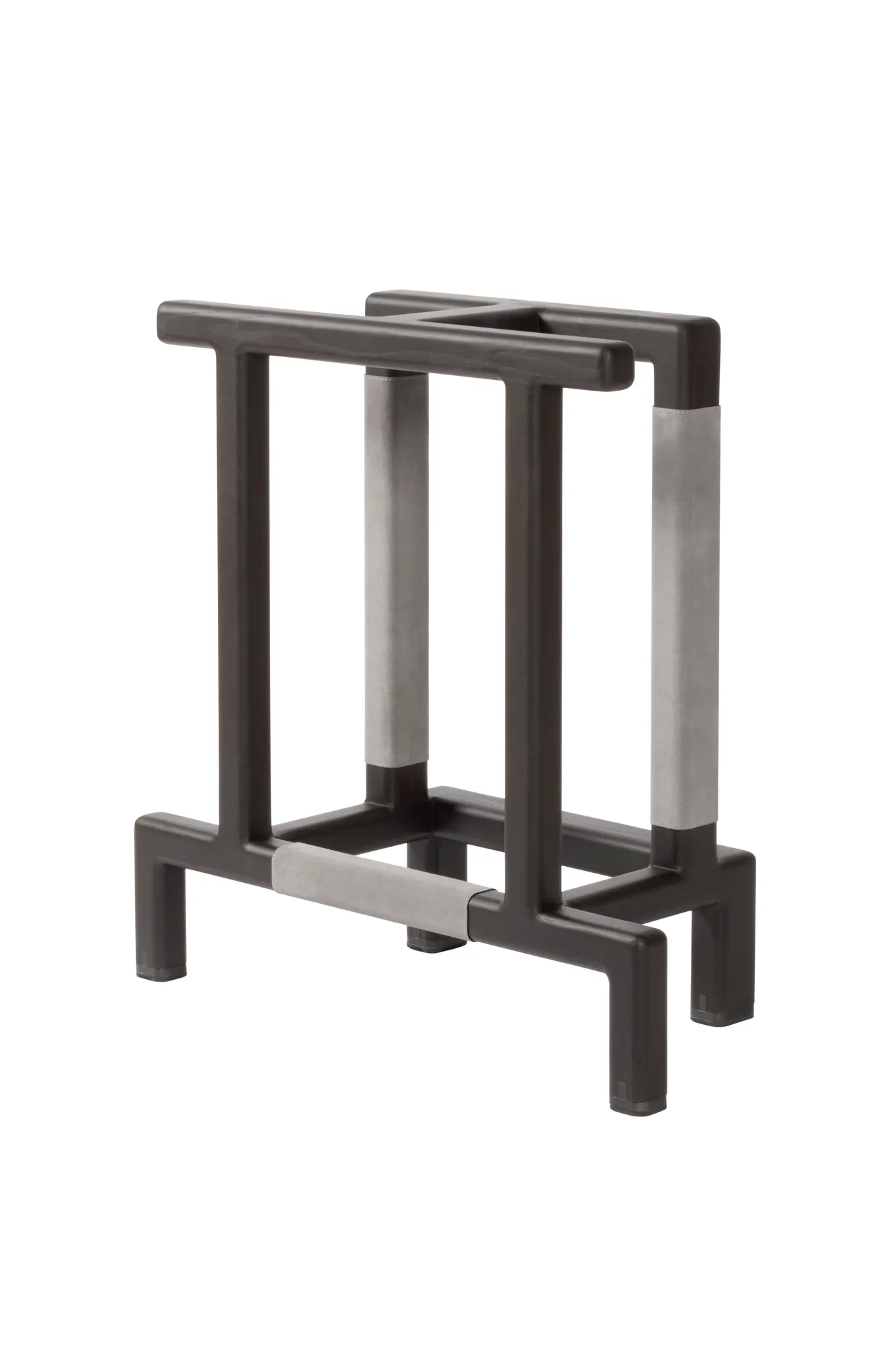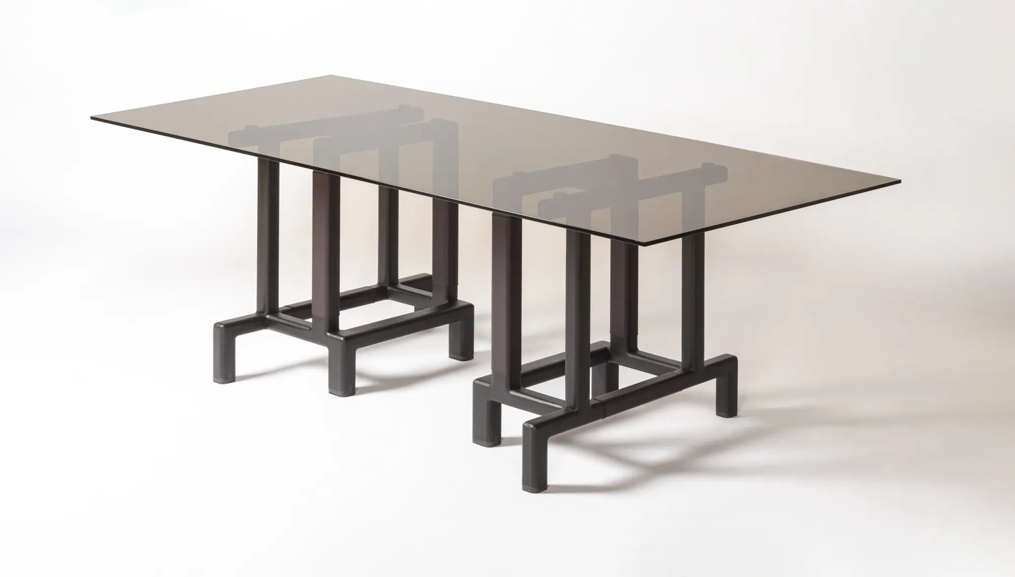 The Lloyd Tabi trestle is ideal to be used as support for any top to build an exclusive table: use it as a single unit with a small top or combine more to build unique configurations with an architectural appeal, like the Lloyd Tabi dining table which features two trestles and a bronze-colored thick glass top. Materials: leather and dark-stained Canaletto walnut wood. Provided with inox or brushed bronze decorative feet. Custom sizes available on request.
