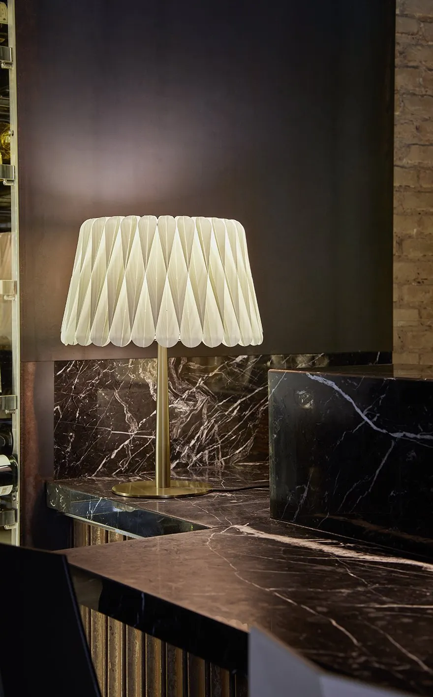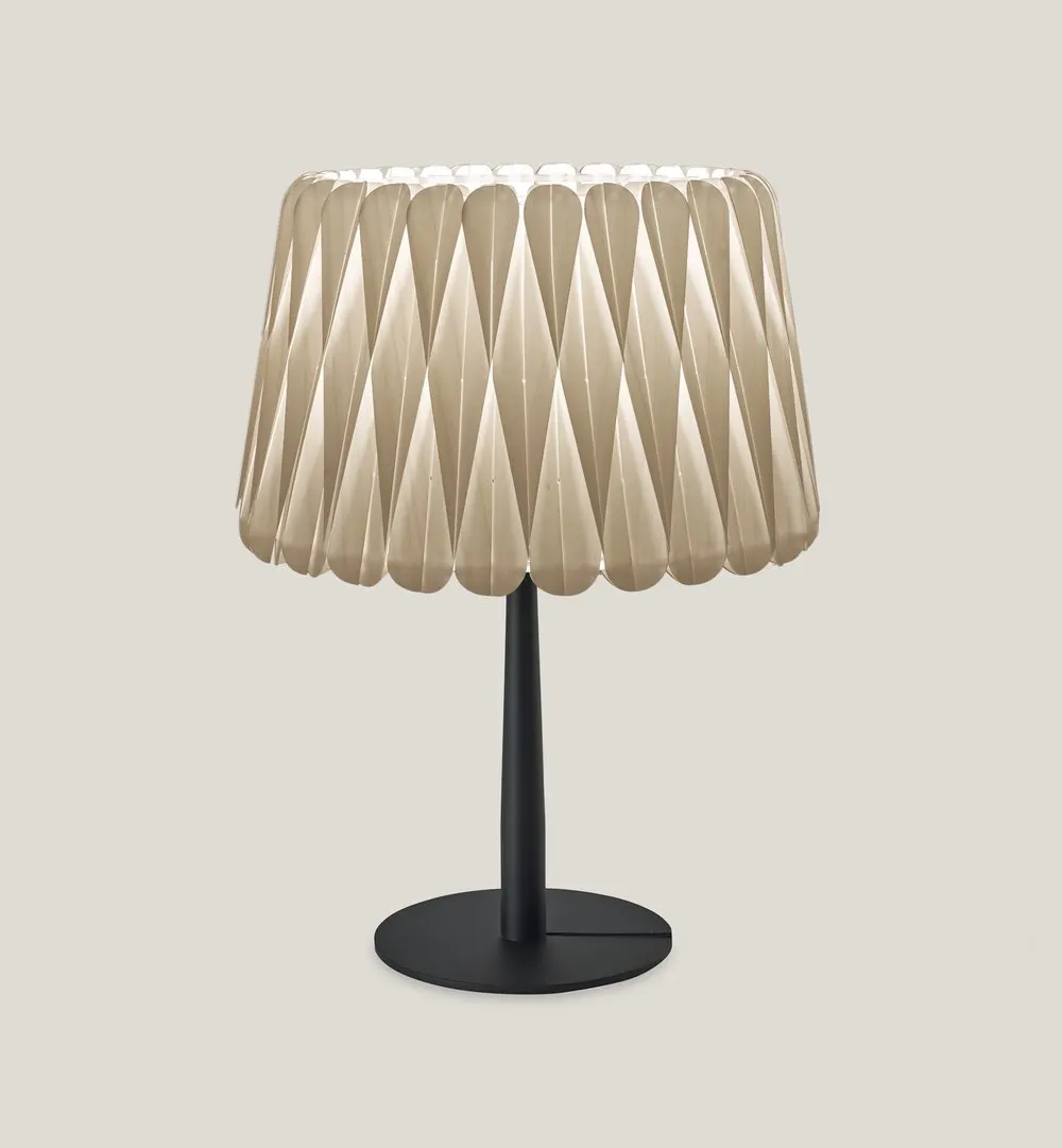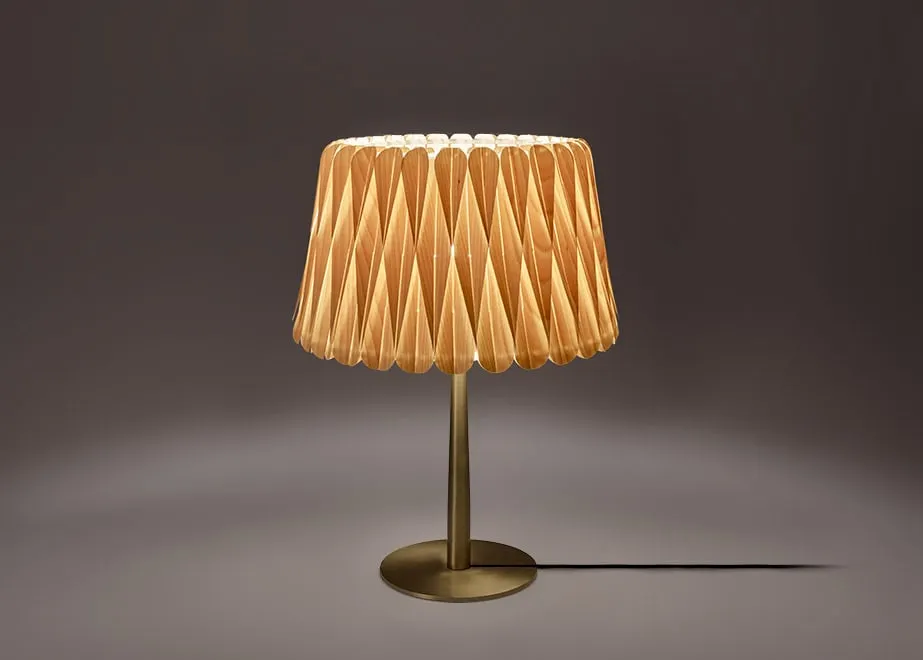 LOLA THE PIQUANT LIGHT. Designed by Ray Power, Lola showcases the designer’s ability to create imaginative three-dimensional forms. Lola is a conical lamp with an intricate geometric pattern. A veritable labour of love, Lola’s shape went through many iterations, drawings and prototypes, before arriving at the finished form. A particularly piquant Spanish name, Lola is very much alive, sensuous, and intriguing. An avant-garde lamp, Lola’s complex woven veneer construction is beautifully accentuated when lit. Lola Table is delightfully piquant—a spicy table lamp, filled with character and charm. The Lola Table is available in Small and Medium sizes, ideally suited to a side table or countertop. The Lola Table is available in Ivory White or Natural Beech wood veneers. The metal base is available in Black, Matt Ivory and Gold finishes.