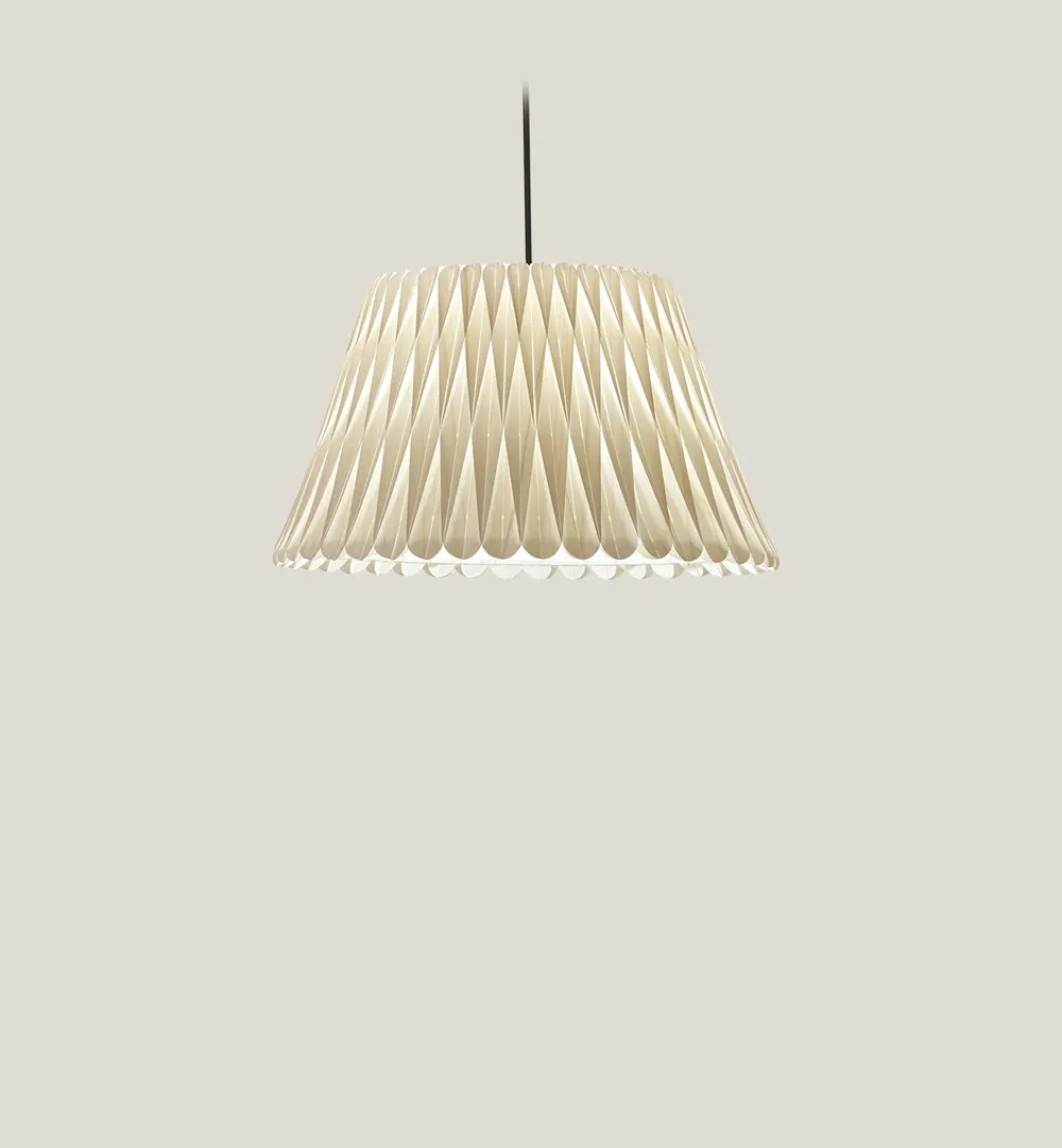 LOLA THE PIQUANT LIGHT. Designed by Ray Power, Lola showcases the designer’s ability to create imaginative three-dimensional forms. Lola is a conical lamp with an intricate geometric pattern. A veritable labour of love, Lola’s shape went through many iterations, drawings and prototypes, before arriving at the finished form. A particularly piquant Spanish name, Lola is very much alive, sensuous, and intriguing. An avant-garde lamp, Lola’s complex woven veneer construction is beautifully accentuated when lit. The textural pattern of Lola’s woven wood veneer shade comes alive in the Lola Suspension lamp. Available in Medium and Large sizes, Lola’s unique construction is testament to the skill of LZF’s craftspeople. The Lola Suspension is available in Ivory White or Natural Beech wood veneers. The metal canopy is available in Matt Nickel.