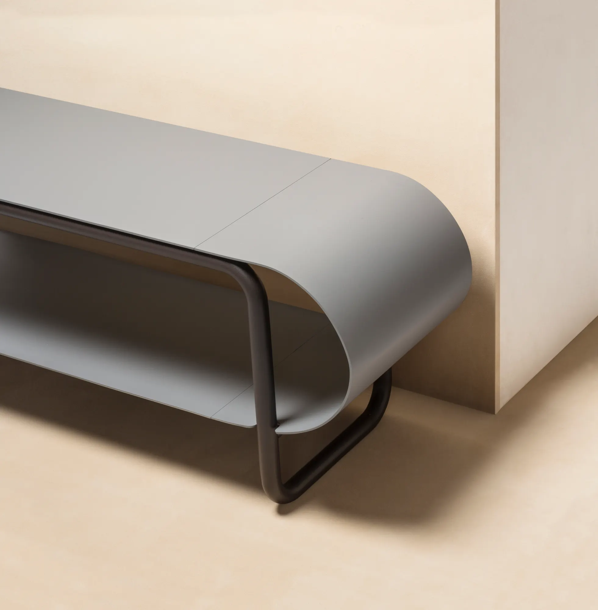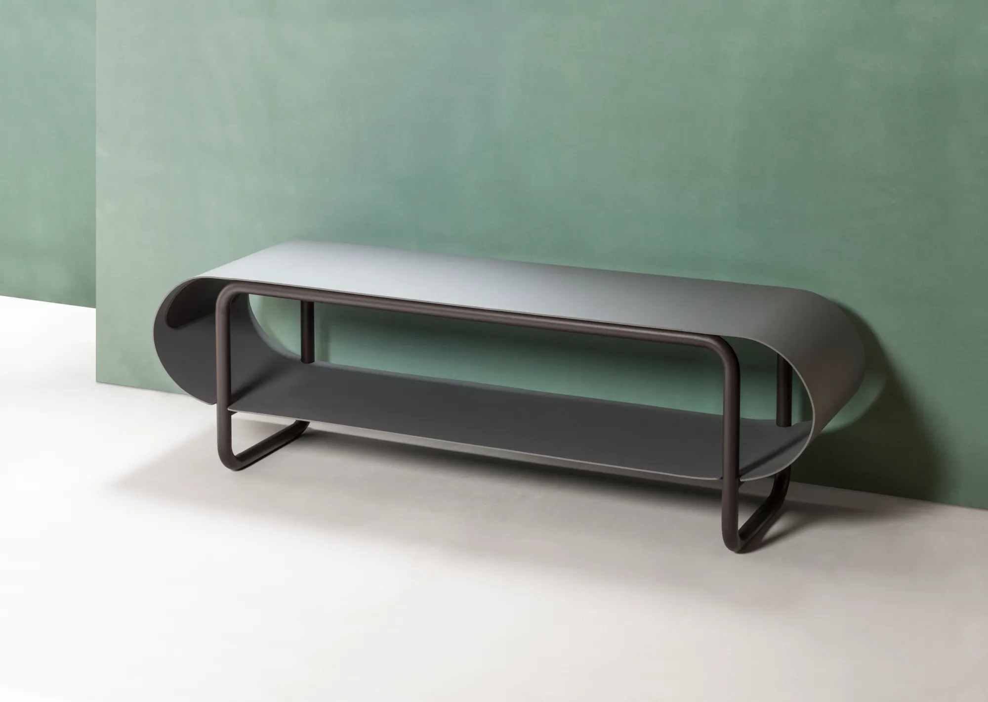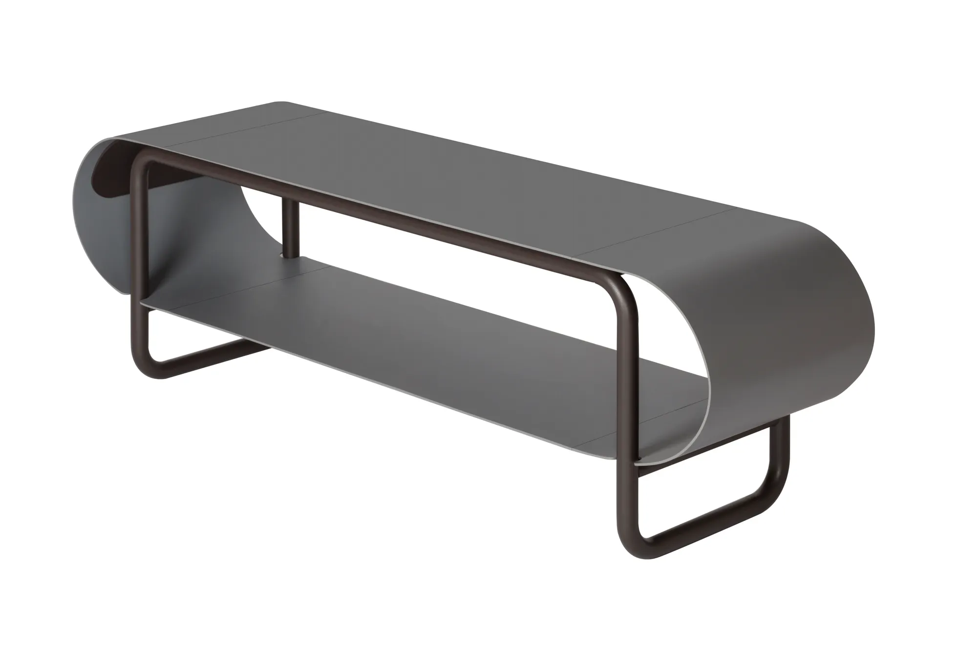 Dark-stained metal structure featuring a Tecnocuoio® cover: finest regenerated leather with water-resistant and UV-resistant finish.