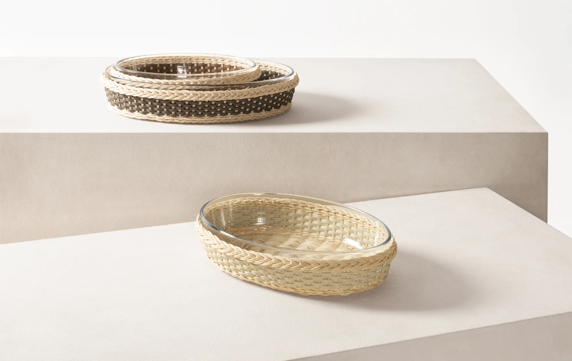 Glass baking tray partially dresses in woven leather and rattan, ideal for cooking your delicious creations, both in traditional and microwave ovens. It also resists low temperatures inside the freezer and is easily dishwasher safe.